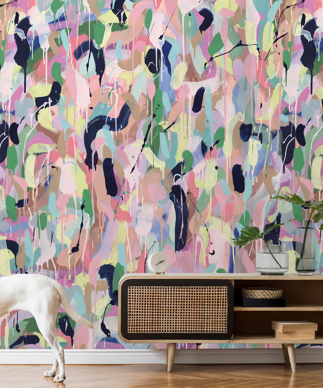 Between Tides Wallpaper is an explosion of harmonious colours. This design was created by playing with the application of colour and paint without planning, a study of how colours sit side by side and layer over each other. The depth of the navy gives the focal points to the other softer but quirky colours. Rust and lilac, olive green and peach, pale blue and watermelon, so many beautiful colours finding themselves happily side by side. So many brush strokes to study and delve into in this contemporary abstract, drip paint wallpaper design.