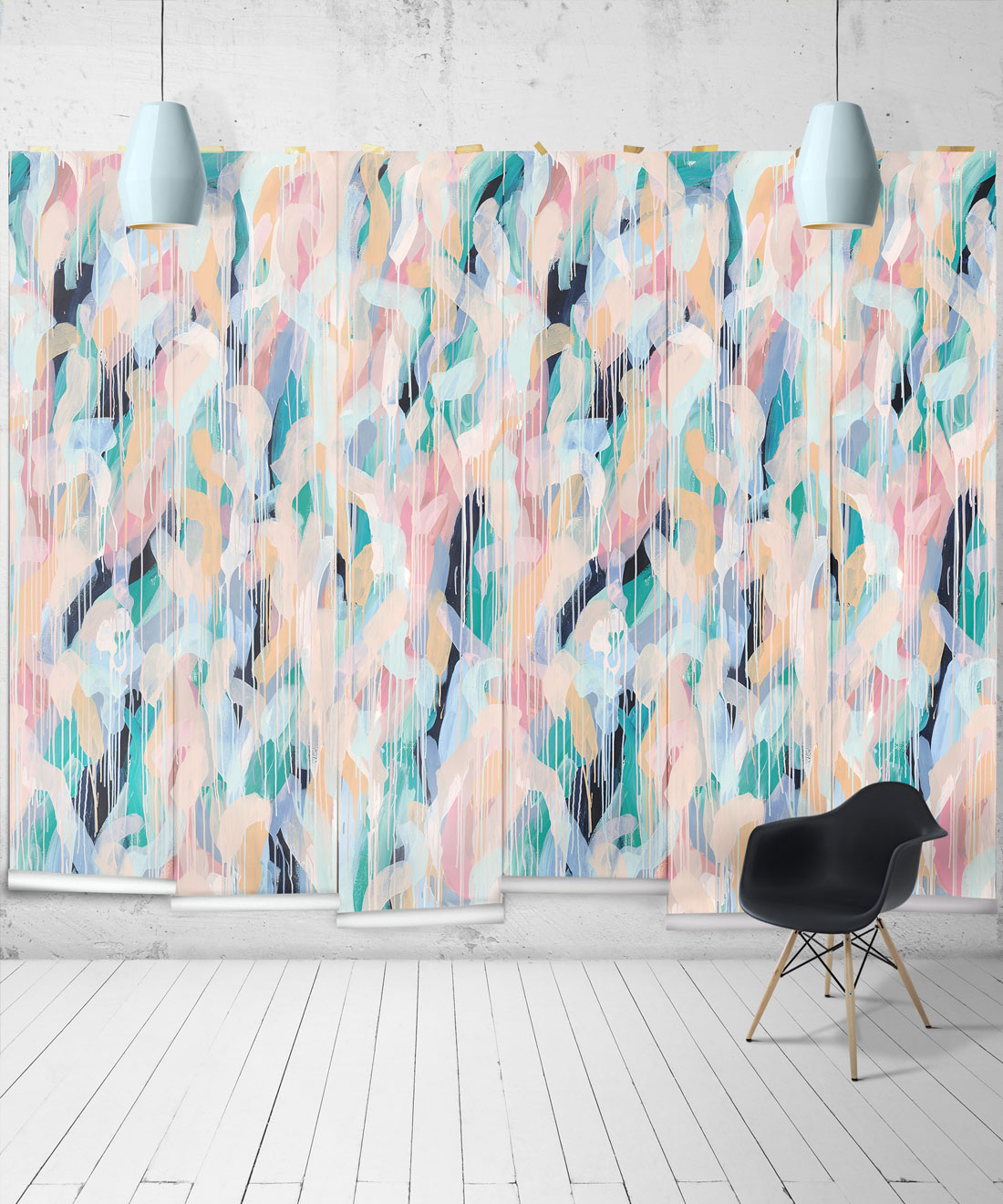 Blue Moon Wallpaper is a very mellow design inspired by the earth and sea, to evoke a sense of tranquility, where the ocean or river meets and layers over the land, both sand and soil. Tiff Manuell began the process of creating this abstract drip style painted wallpaper piece with a heavier base of acrylic Colours and thicker paint to give it weight. She used darker colours first to give it depth.  As colours are added they become lighter and slowly the paint thins to the point they become nearly transparent. This adds softness and lets the under textures and strokes form their own new hues.