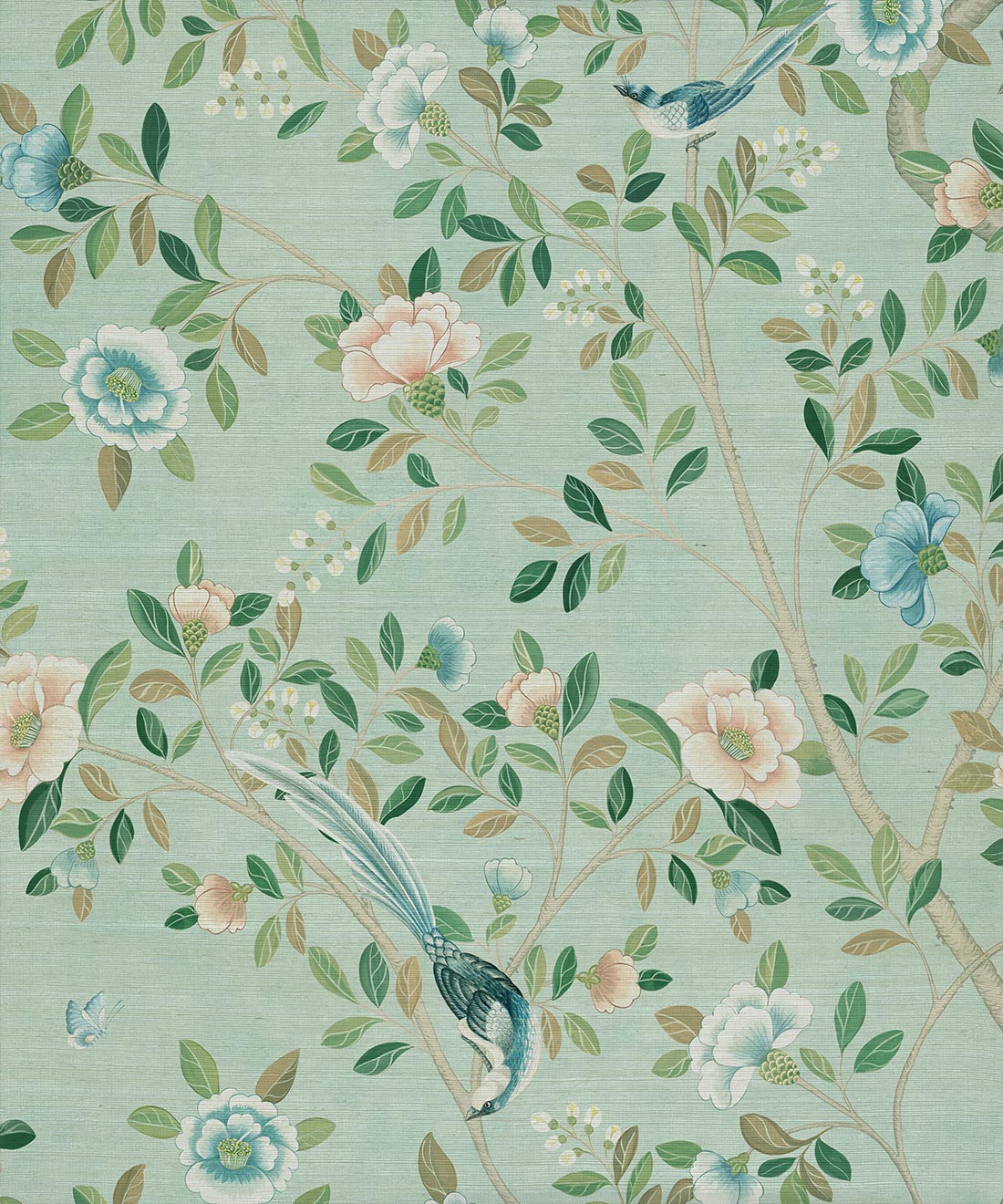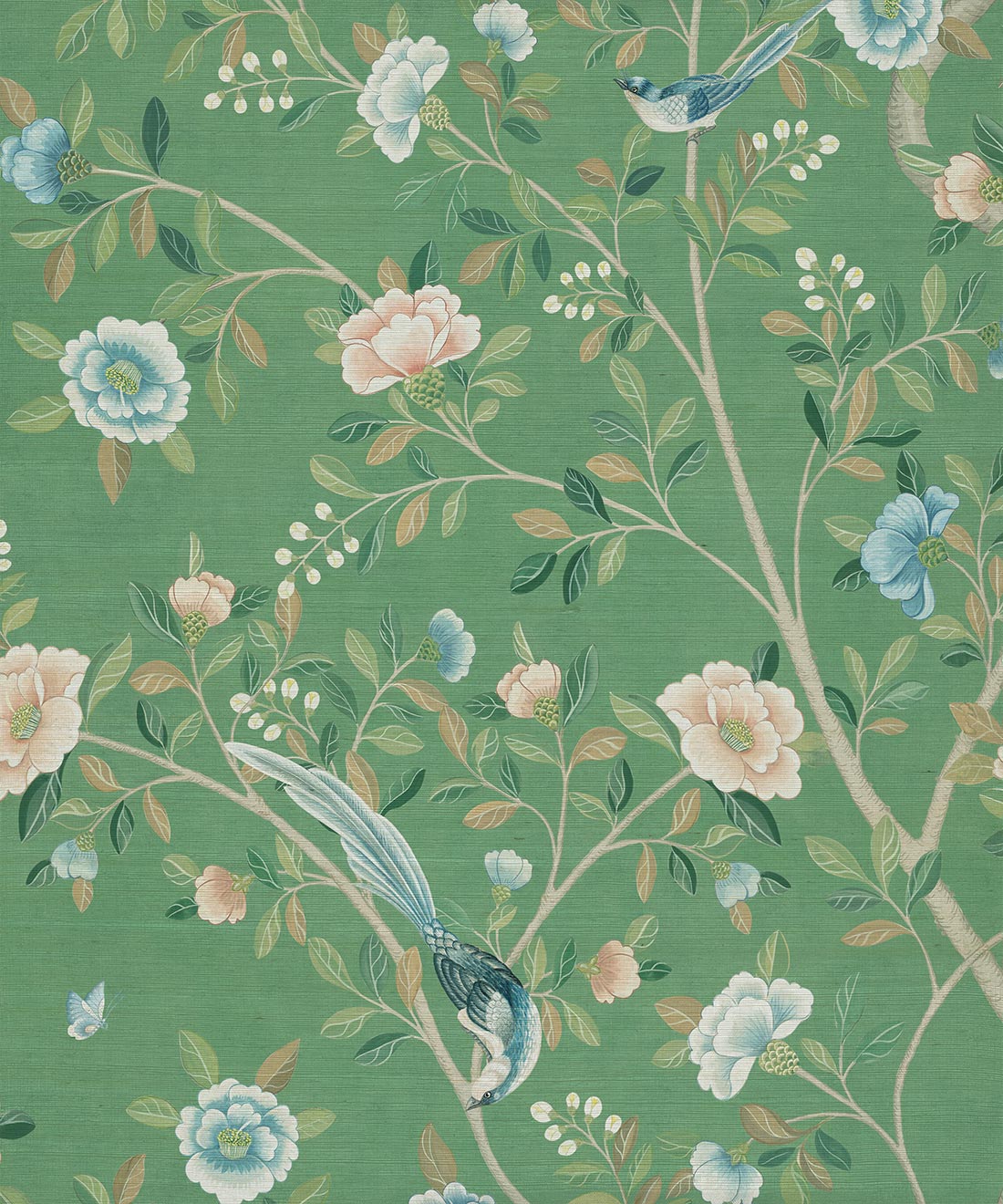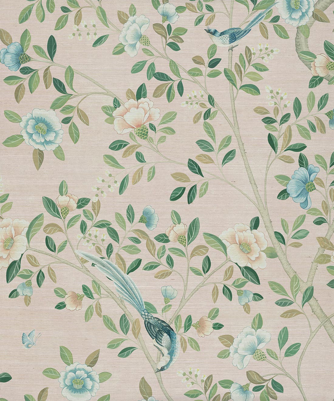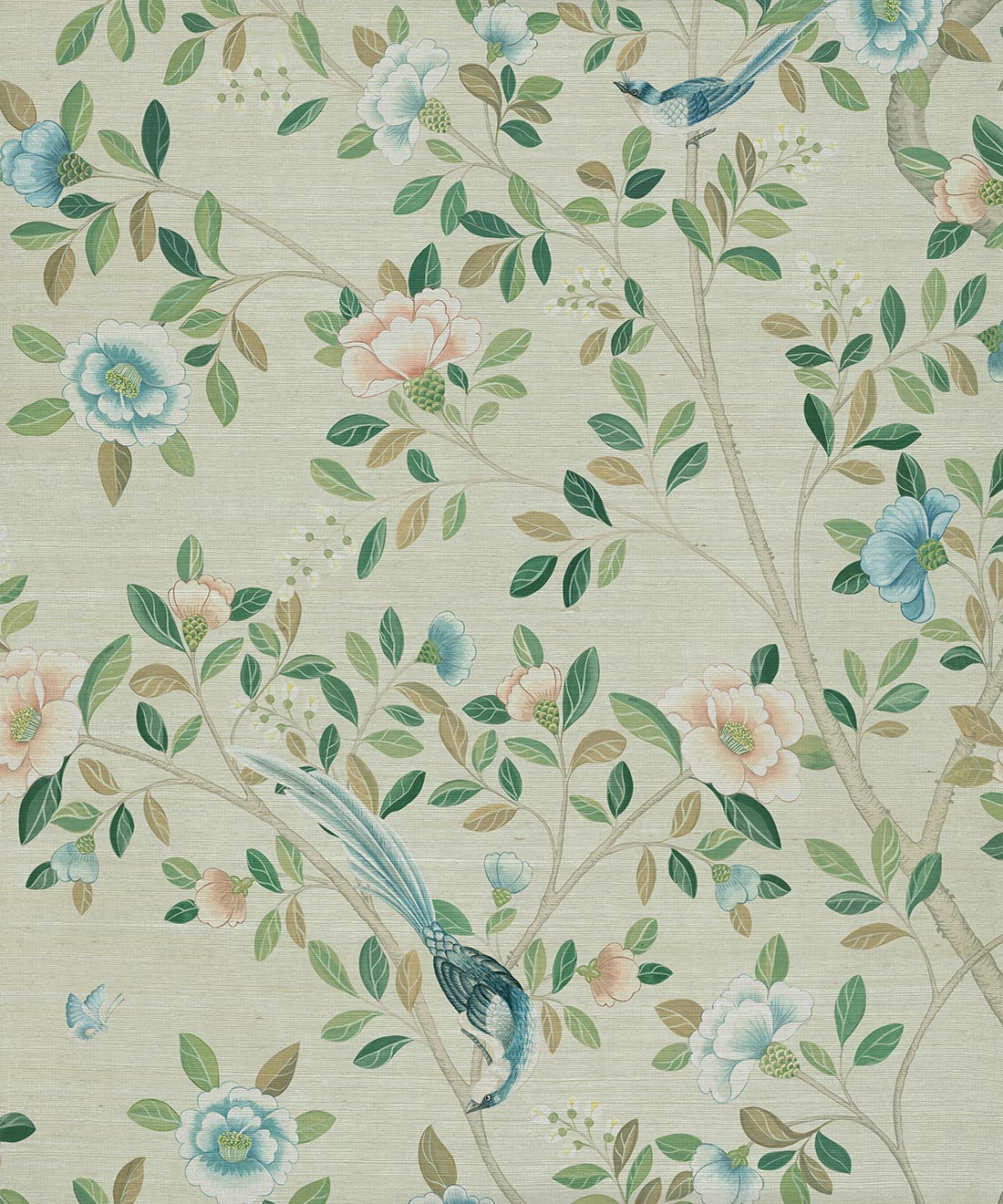 The Camellia Tree Grasscloth Mural draws inspiration from quintessential spring florals, and features beautiful birds nestled among the leaves and flowers of a Camellia tree. Originally hand-painted with gouache on stone henge paper, the winding branches and bursting blooms blend effortlessly with the Grasscloth texture to create a stunning backdrop that will make your space feel larger and livelier.