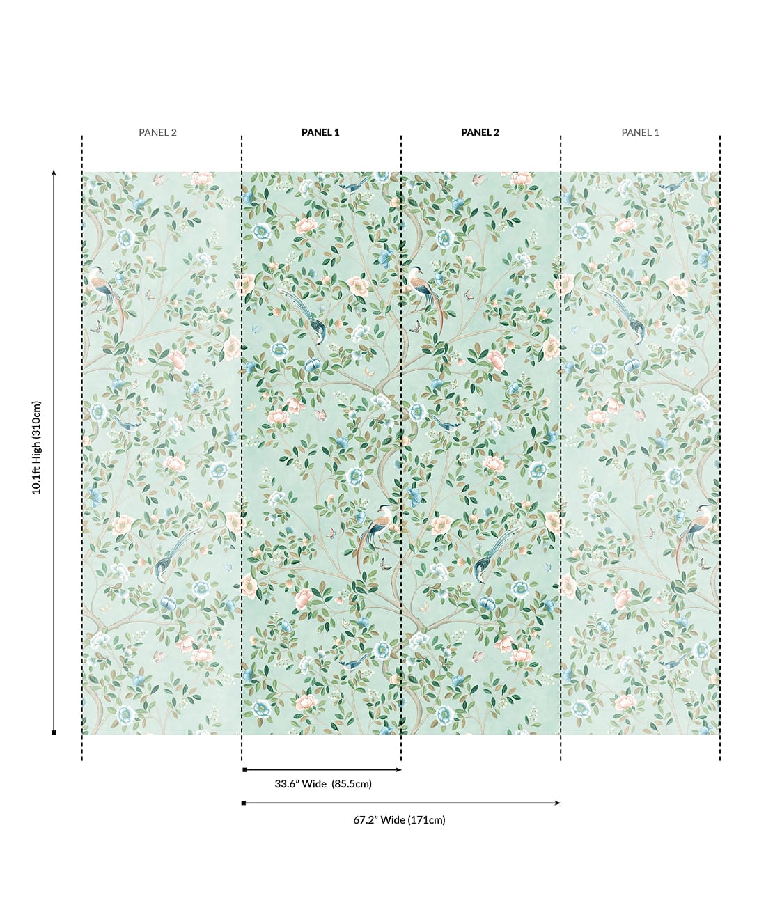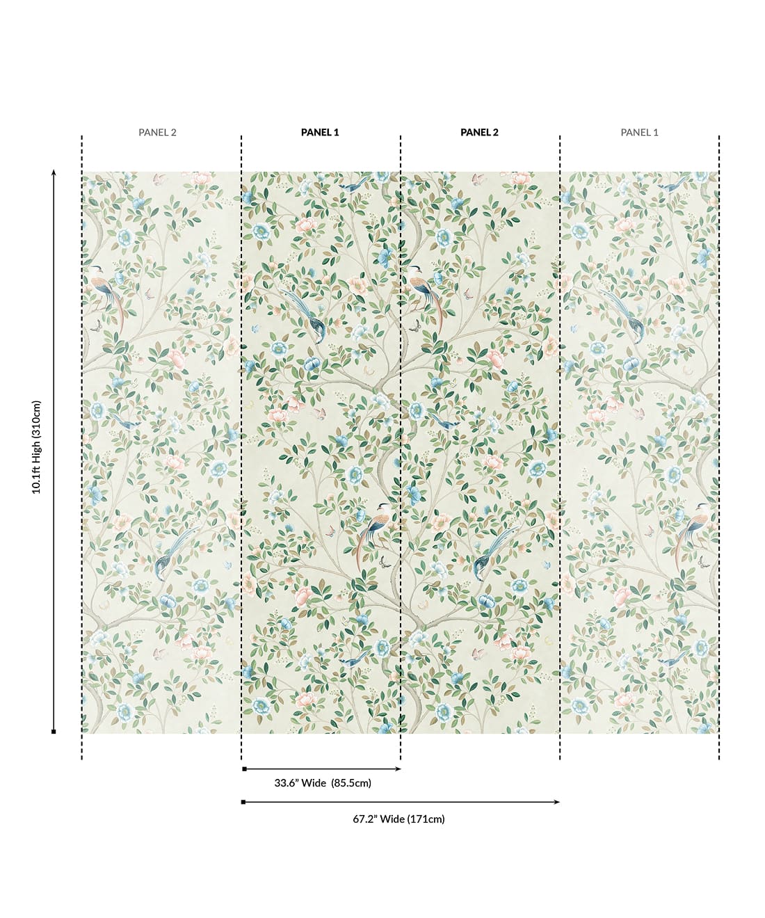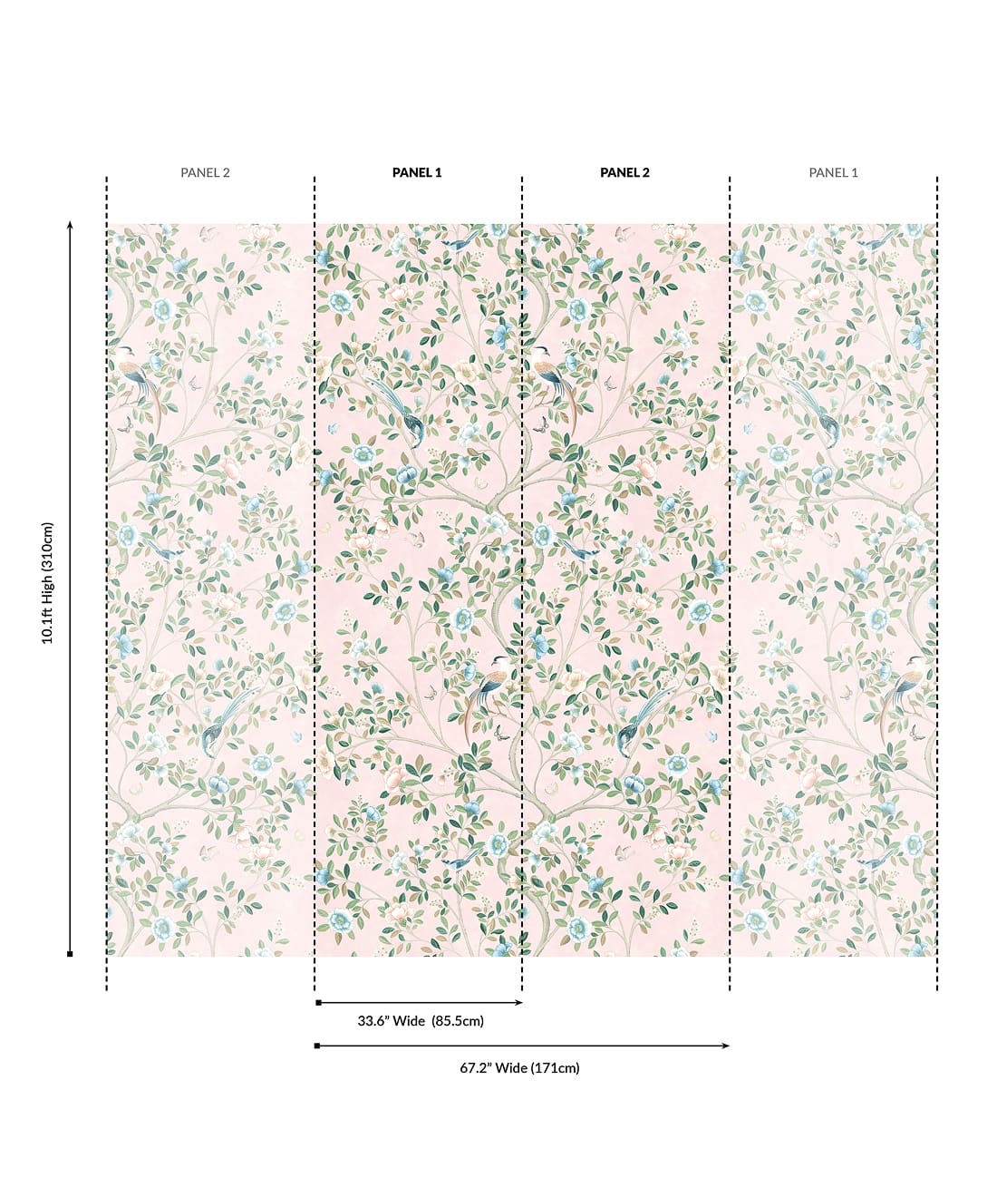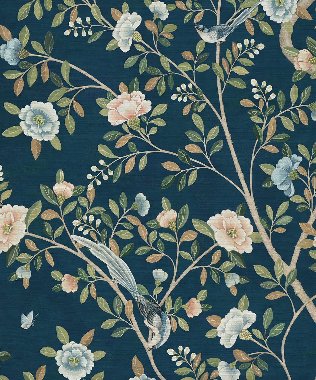 The Camellia Tree Grasscloth Mural draws inspiration from quintessential spring florals, and features beautiful birds nestled among the leaves and flowers of a Camellia tree. Originally hand-painted with gouache on stone henge paper, the winding branches and bursting blooms blend effortlessly with the Grasscloth texture to create a stunning backdrop that will make your space feel larger and livelier.