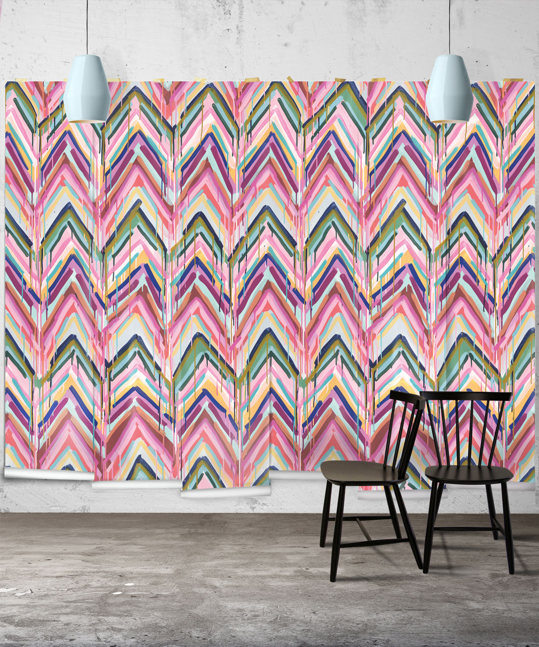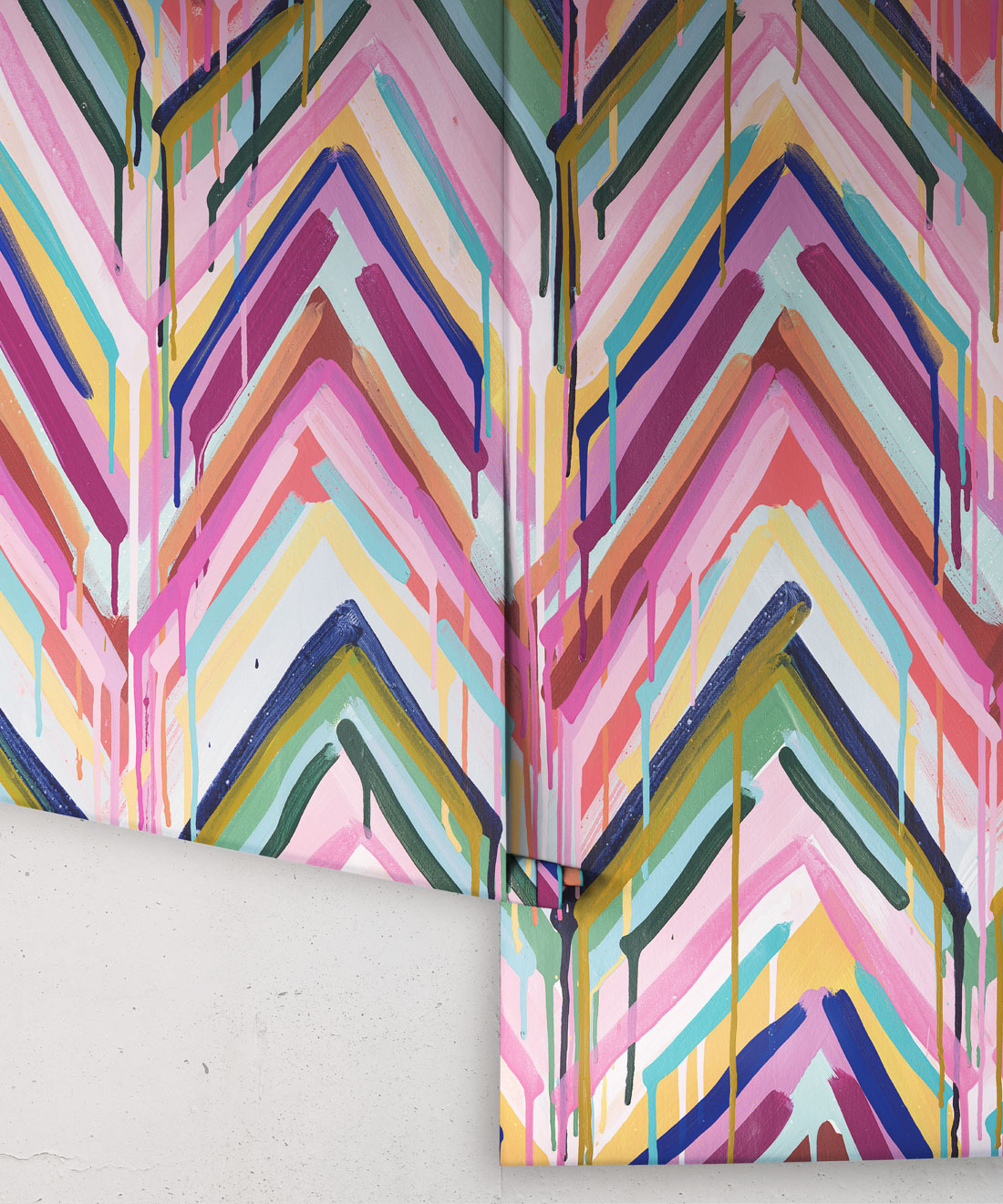 Crossroads is a fun and very colourful chevron wallpaper design. It follows a graphic formation, but was painted with loose abandon. The design demonstrates a true mix of quirky but fashionable colours, haphazardly layering and bouncing off each other. This colourful wallpaper created in a drip paint style is for the bold at heart, creating conversations in a room packed full of joy.