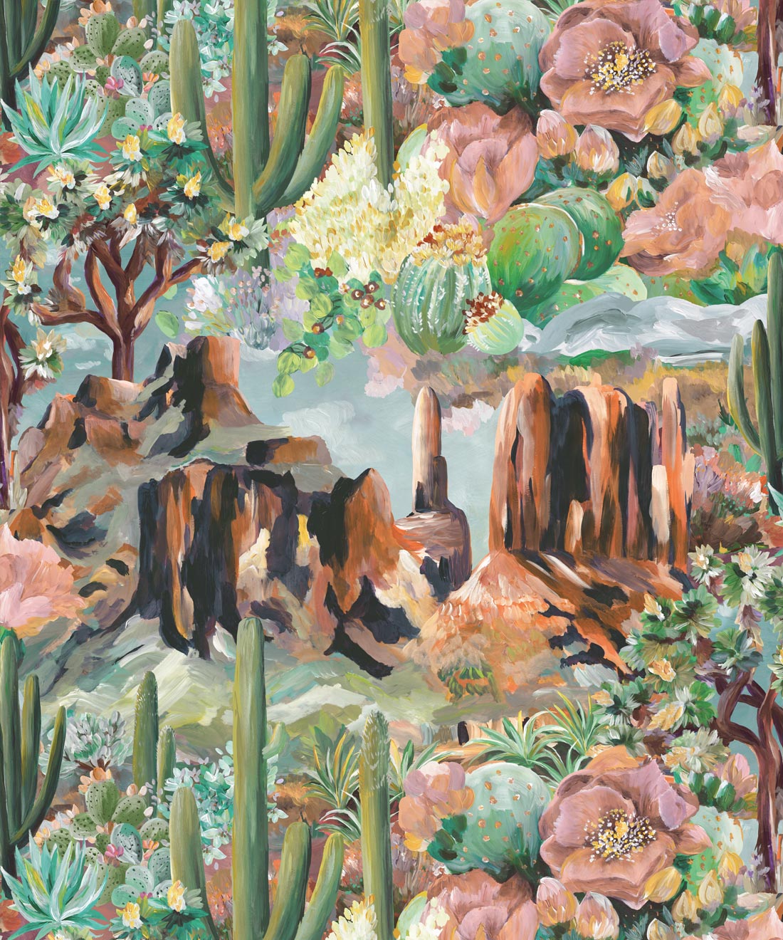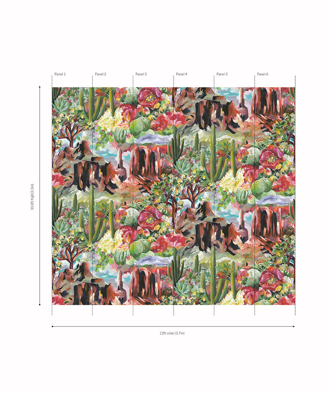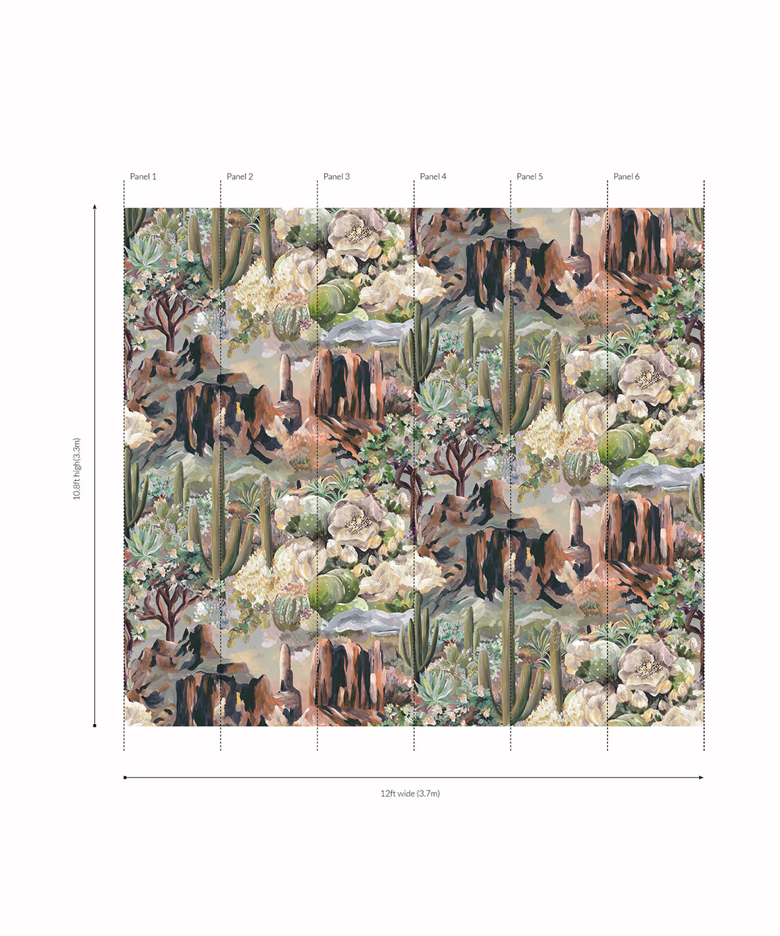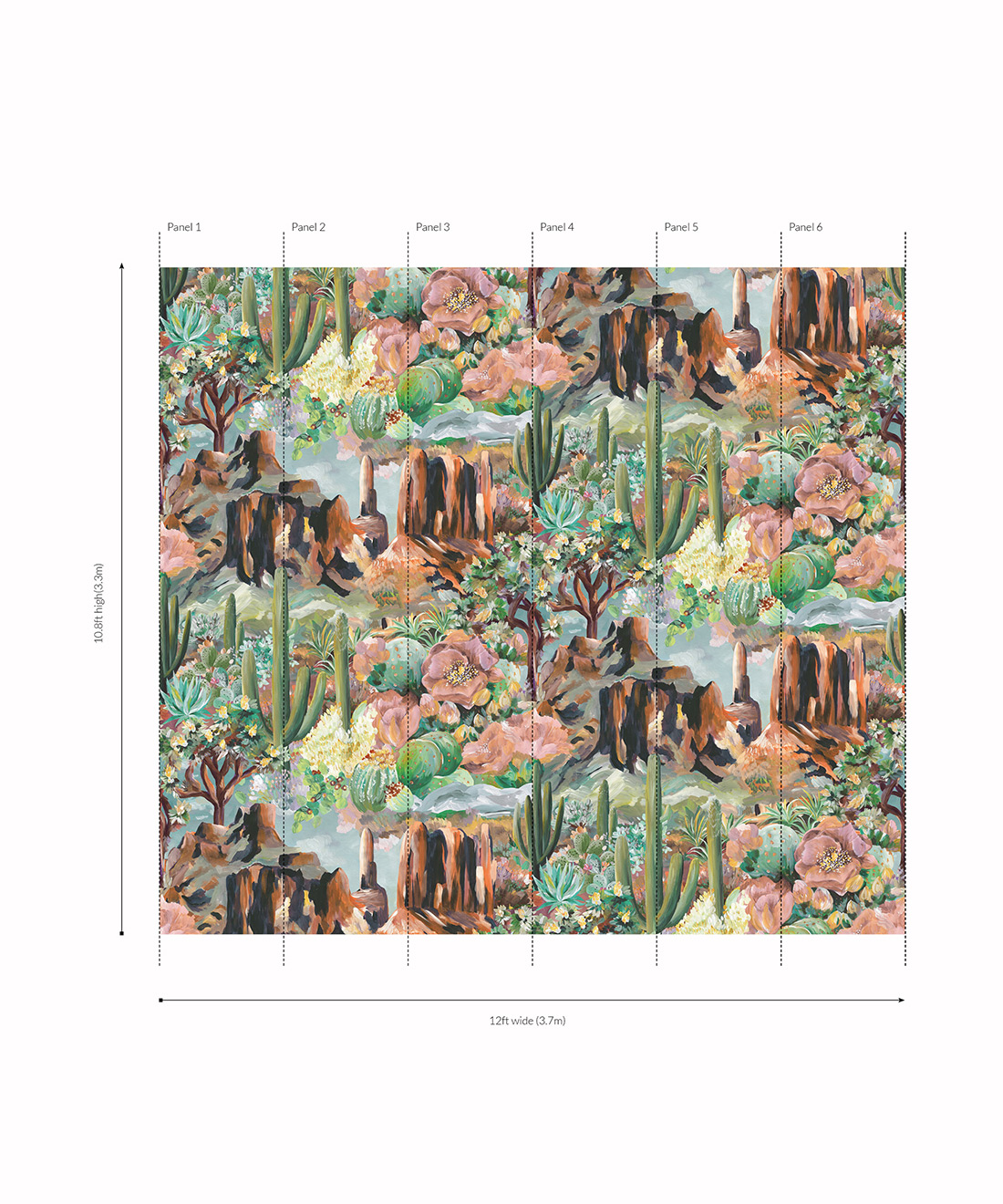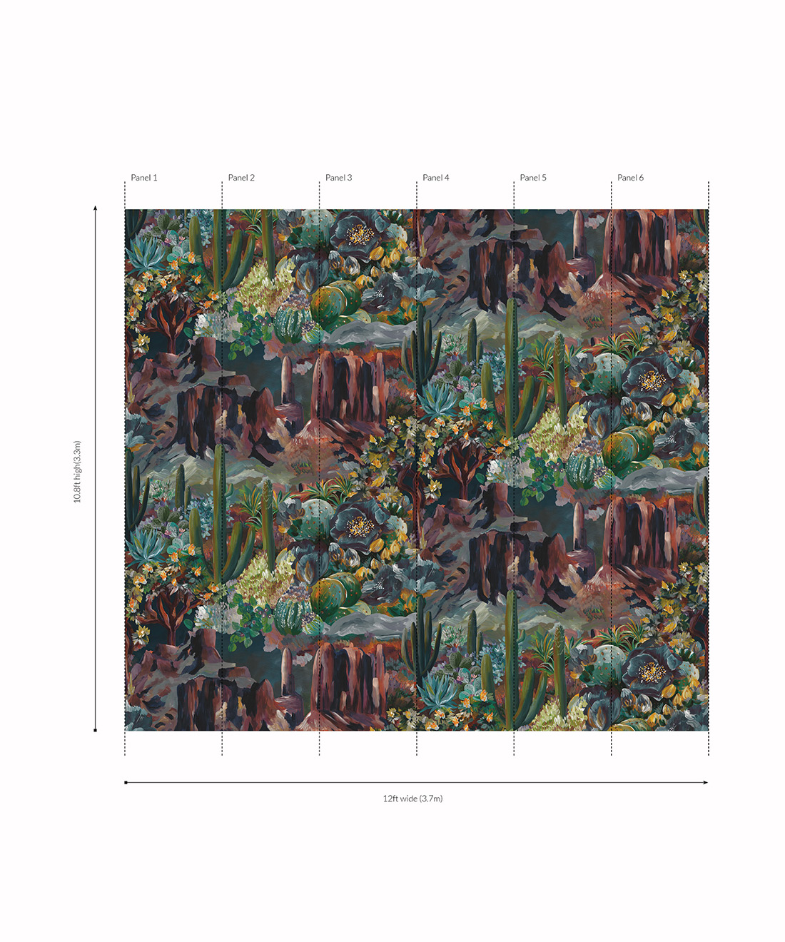 Add a sense of warmth, serenity and adventure to your home with the Desert Skies mural. A painterly landscape featuring sprawling canyons alongside luscious cacti, flora and succulents, Desert Skies is a symphony of colour and contrast. Each colourway showcases a different textural sky, from the fiery sunset hues and inky blues of midnight to the soft pastels of a rising sun, each version is a testament to the everchanging beauty of one of nature’s most captivating landscapes. Designed as a 6 panel repeating mural to convey the grandeur of its rugged terrain whilst ensuring versatility, this design was originally hand-painted in our UK studio, and is available in seven stunning colourways to suit any interior.