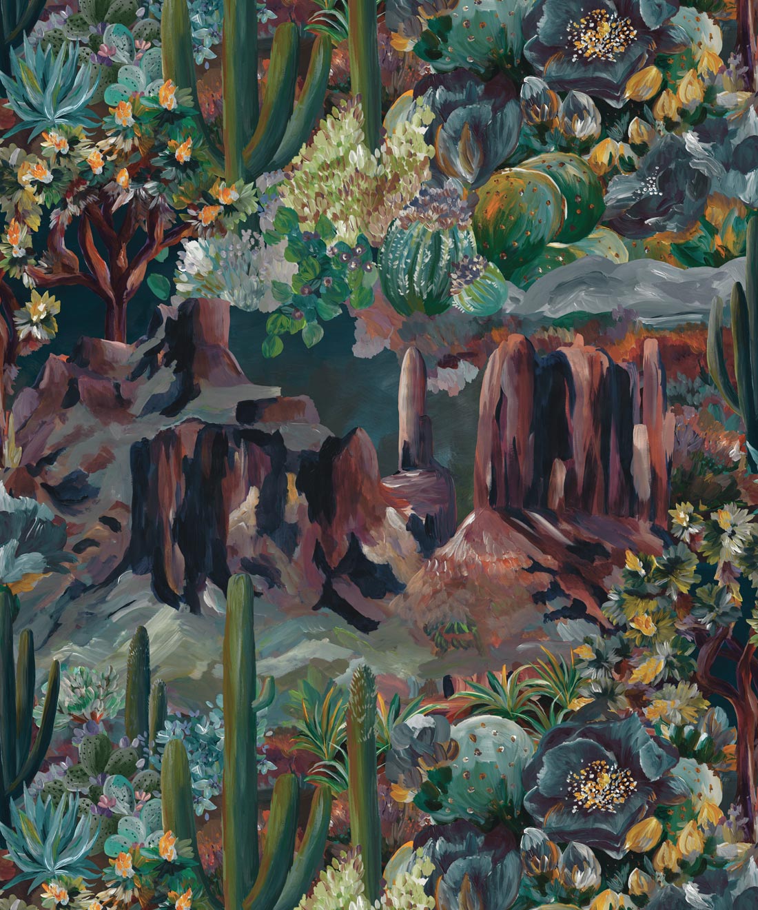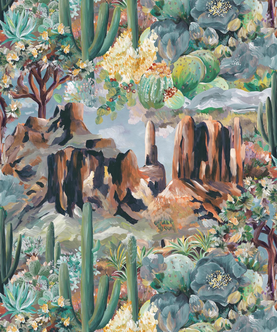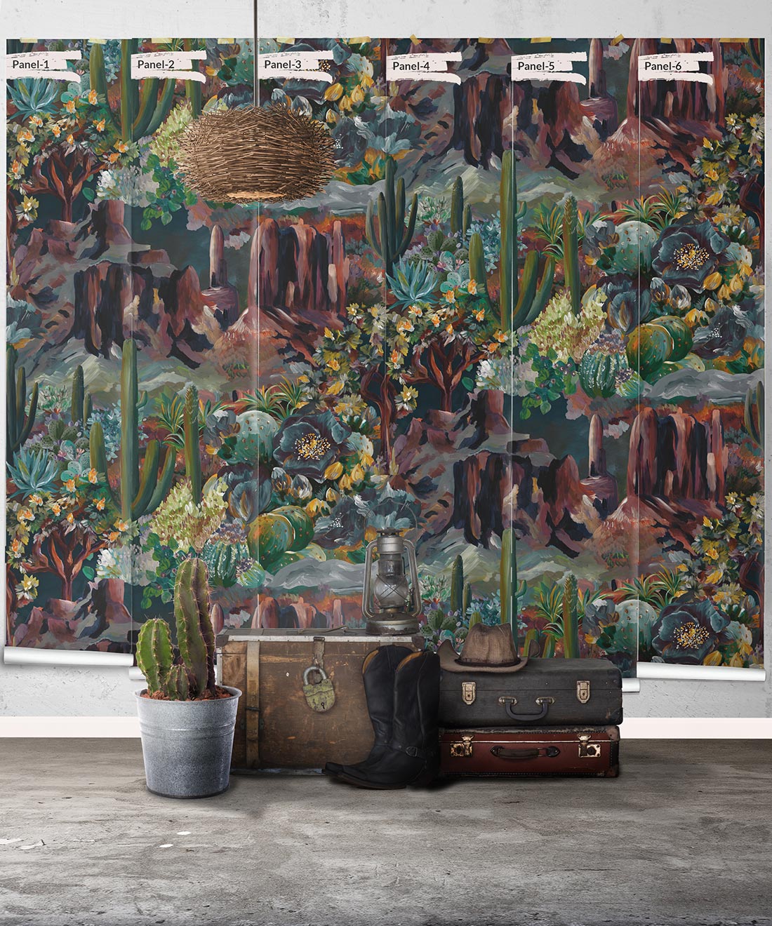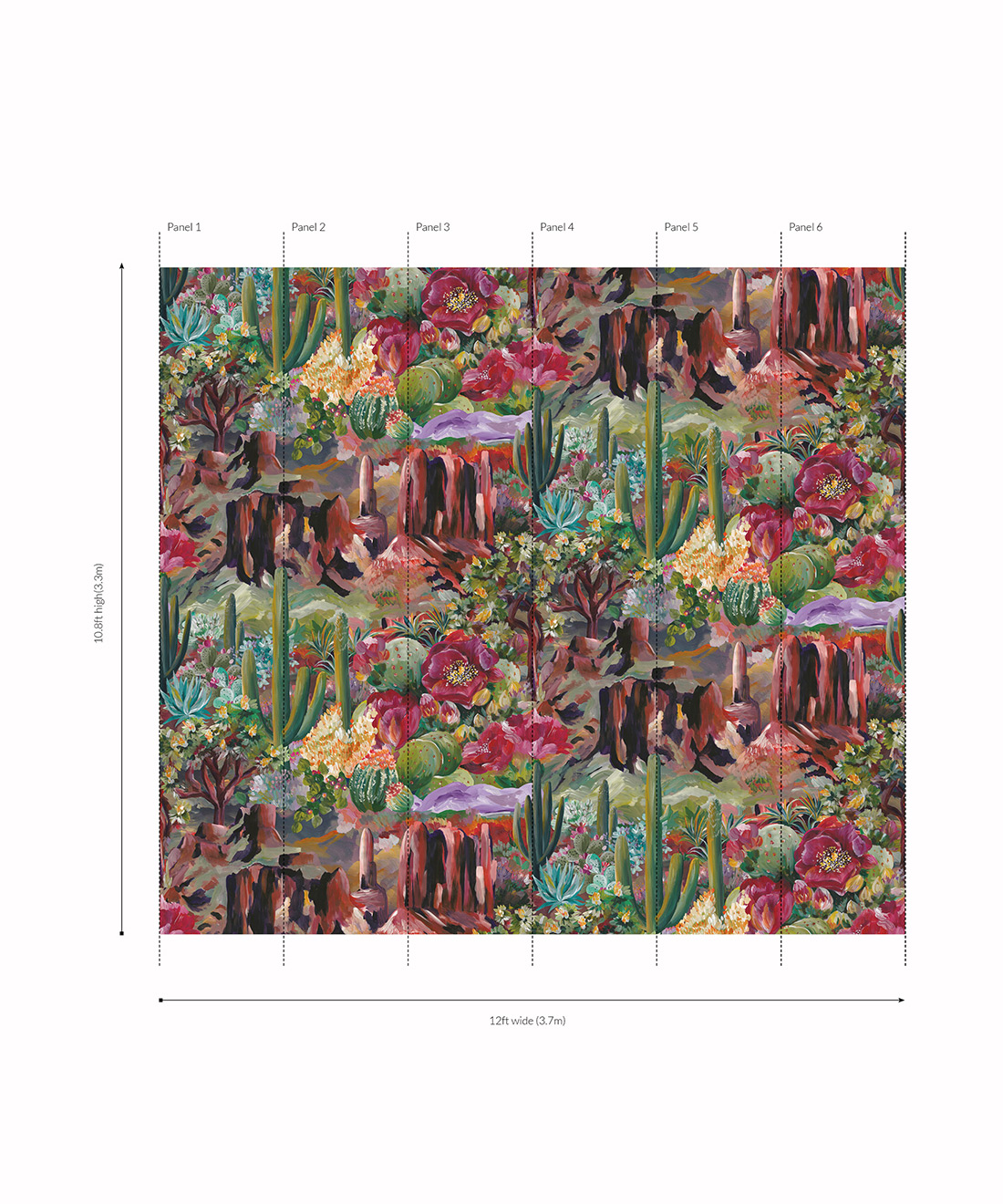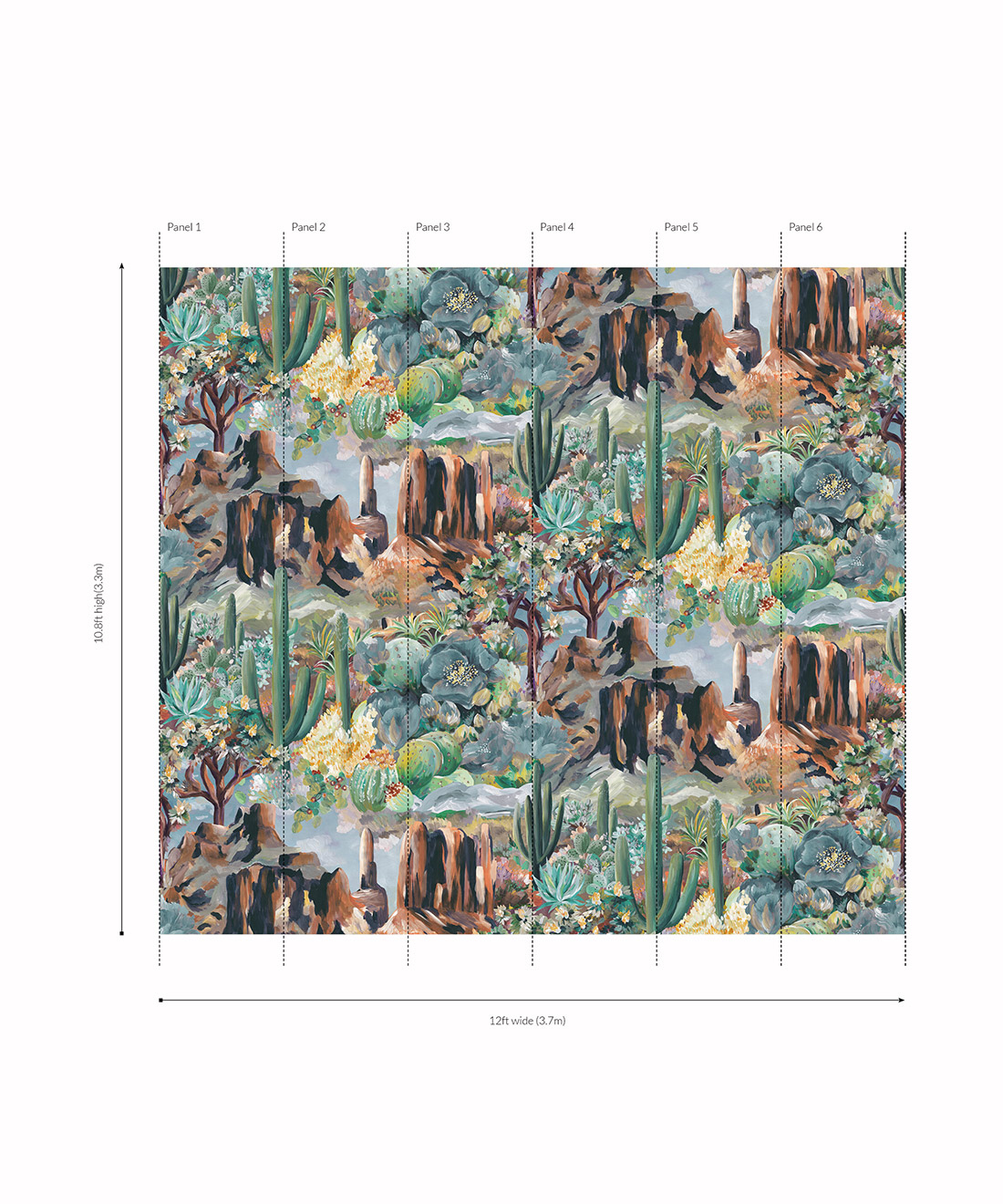 Add a sense of warmth, serenity and adventure to your home with the Desert Skies mural. A painterly landscape featuring sprawling canyons alongside luscious cacti, flora and succulents, Desert Skies is a symphony of colour and contrast. Each colourway showcases a different textural sky, from the fiery sunset hues and inky blues of midnight to the soft pastels of a rising sun, each version is a testament to the everchanging beauty of one of nature’s most captivating landscapes. Designed as a 6 panel repeating mural to convey the grandeur of its rugged terrain whilst ensuring versatility, this design was originally hand-painted in our UK studio, and is available in seven stunning colourways to suit any interior.