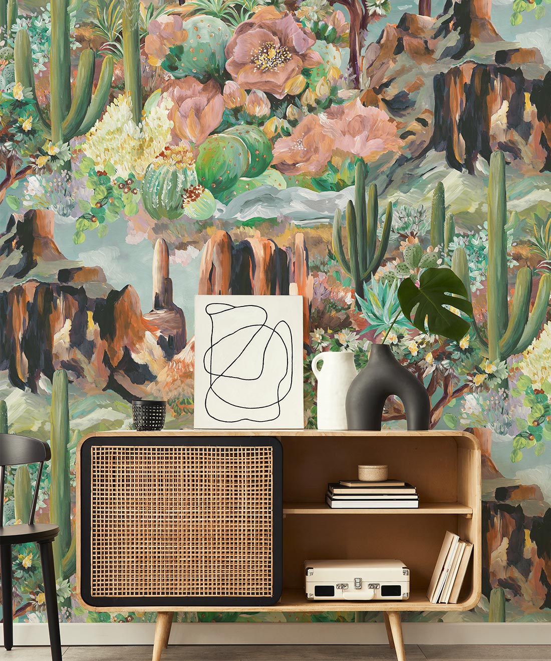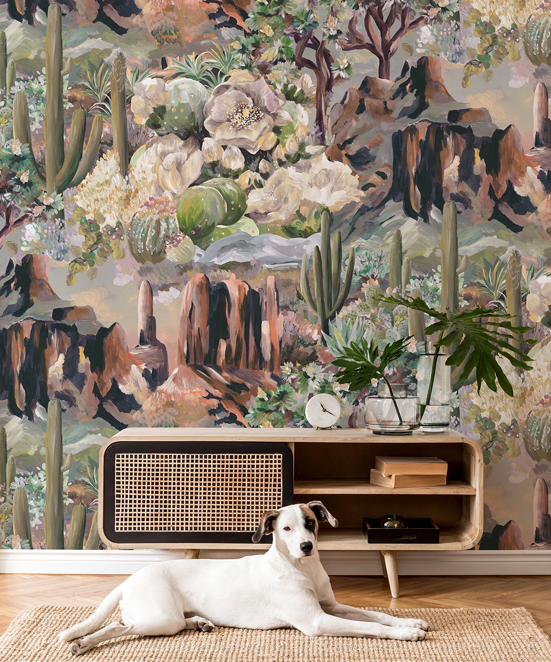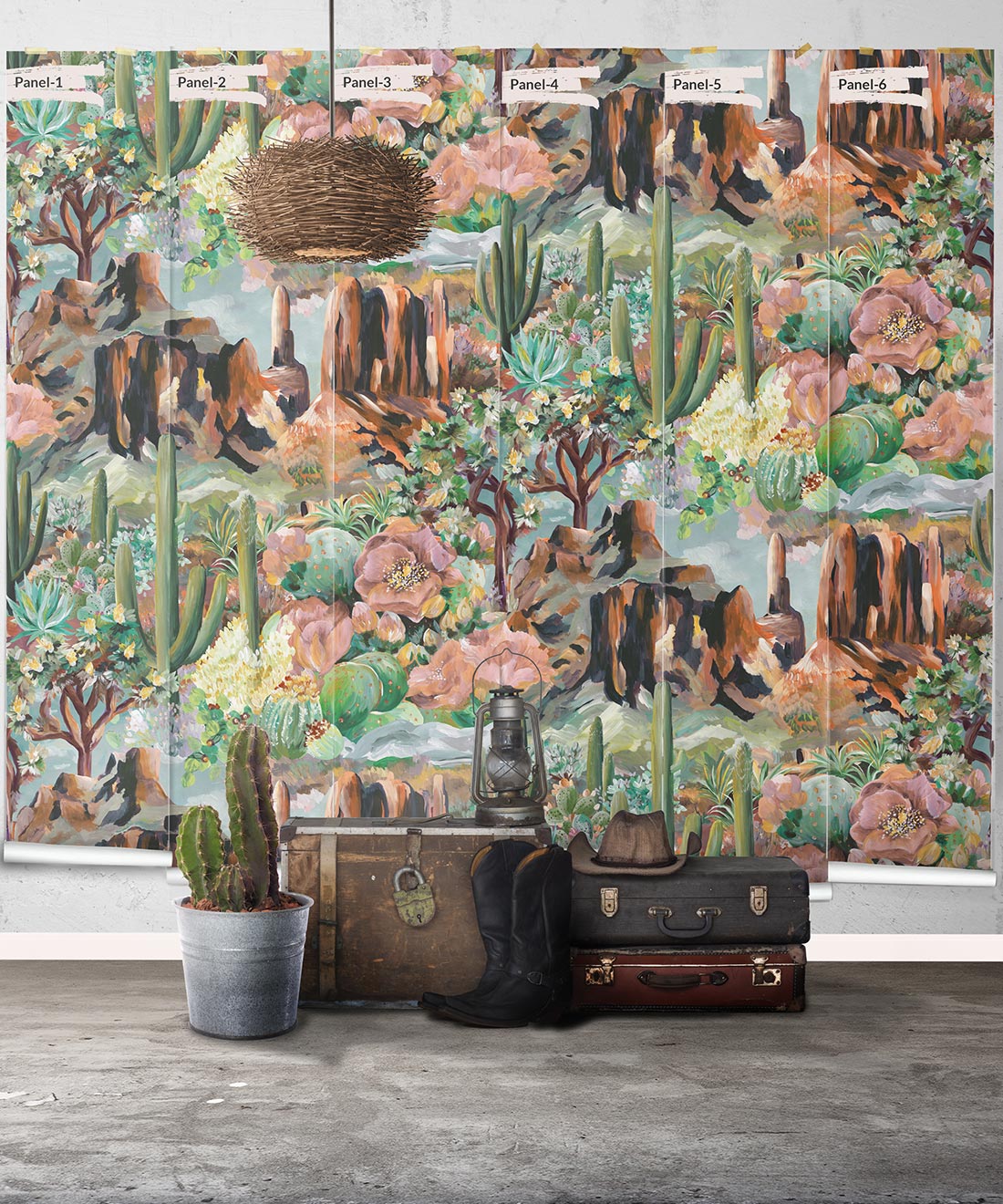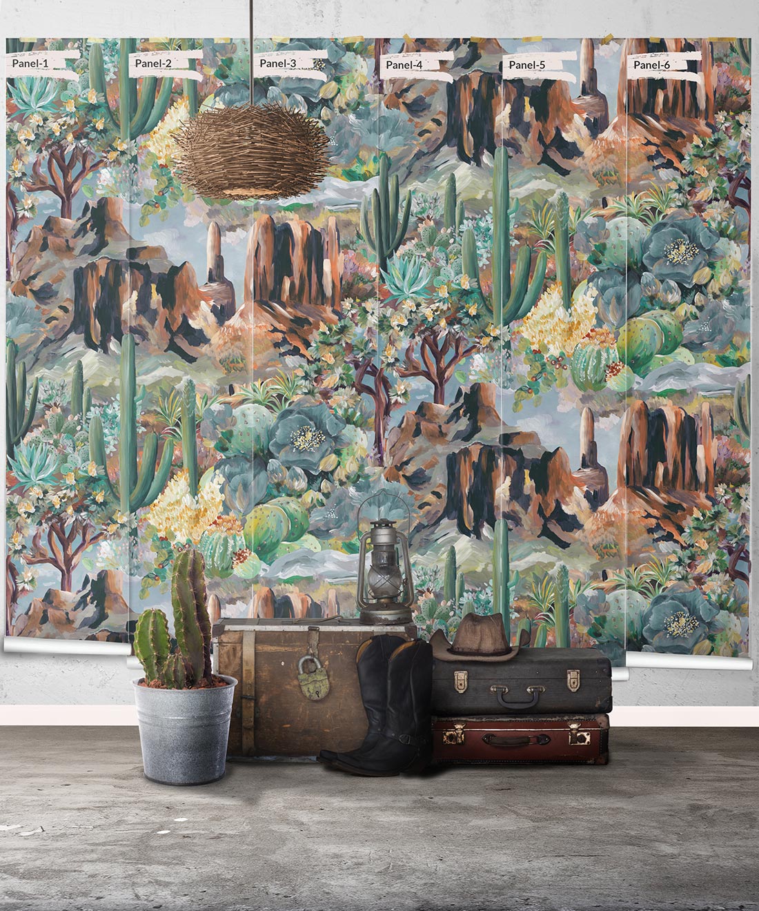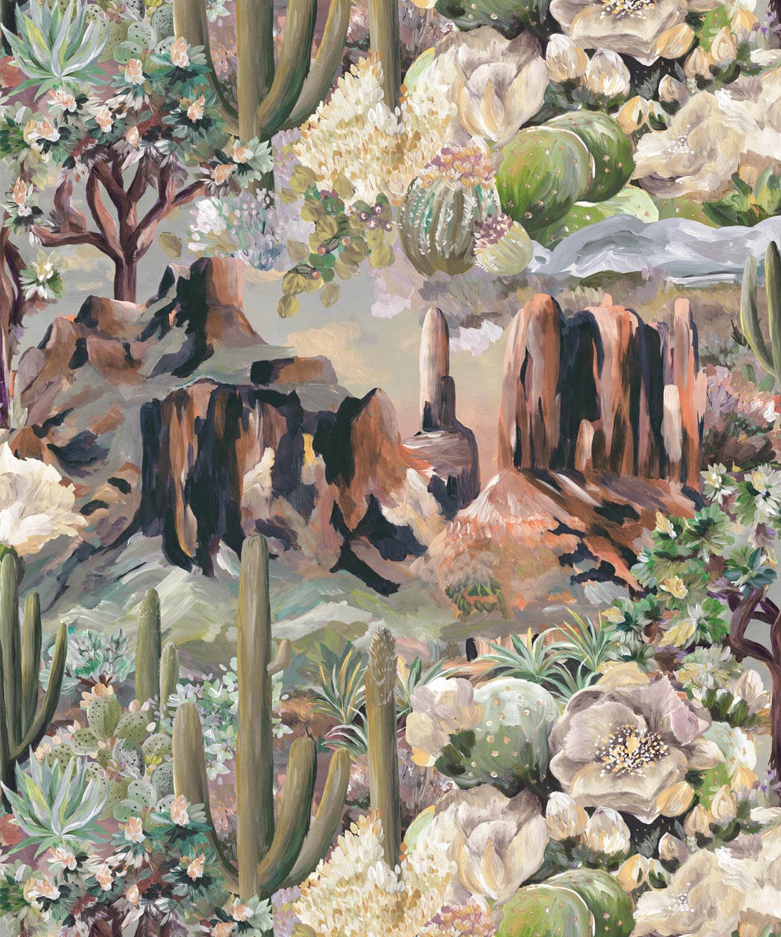 Add a sense of warmth, serenity and adventure to your home with the Desert Skies mural. A painterly landscape featuring sprawling canyons alongside luscious cacti, flora and succulents, Desert Skies is a symphony of colour and contrast. Each colourway showcases a different textural sky, from the fiery sunset hues and inky blues of midnight to the soft pastels of a rising sun, each version is a testament to the everchanging beauty of one of nature’s most captivating landscapes. Designed as a 6 panel repeating mural to convey the grandeur of its rugged terrain whilst ensuring versatility, this design was originally hand-painted in our UK studio, and is available in seven stunning colourways to suit any interior.