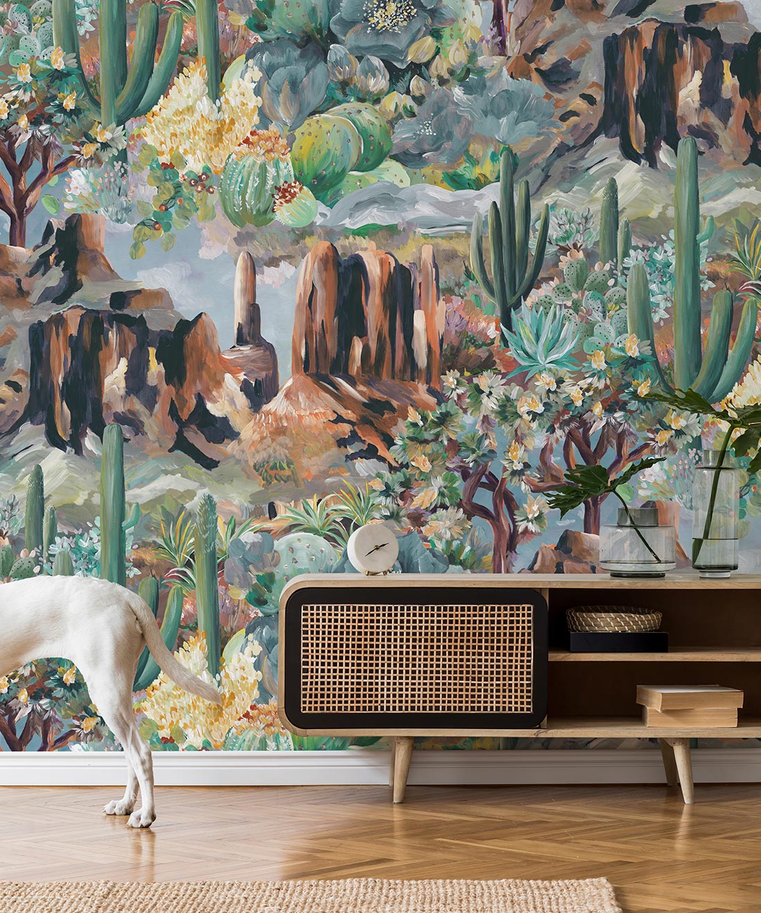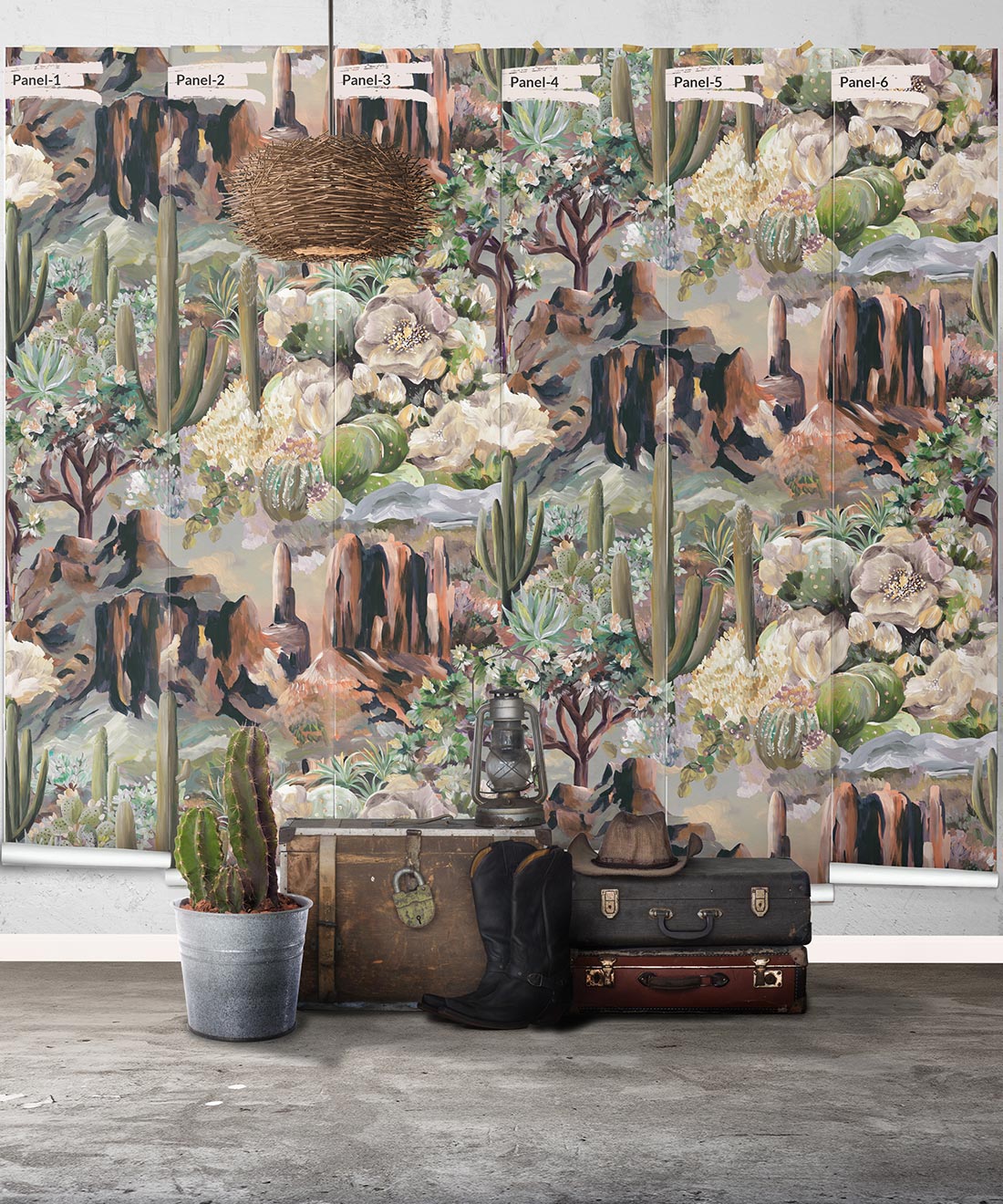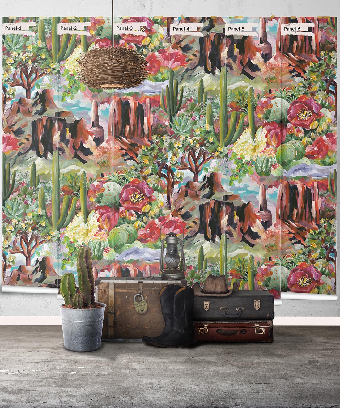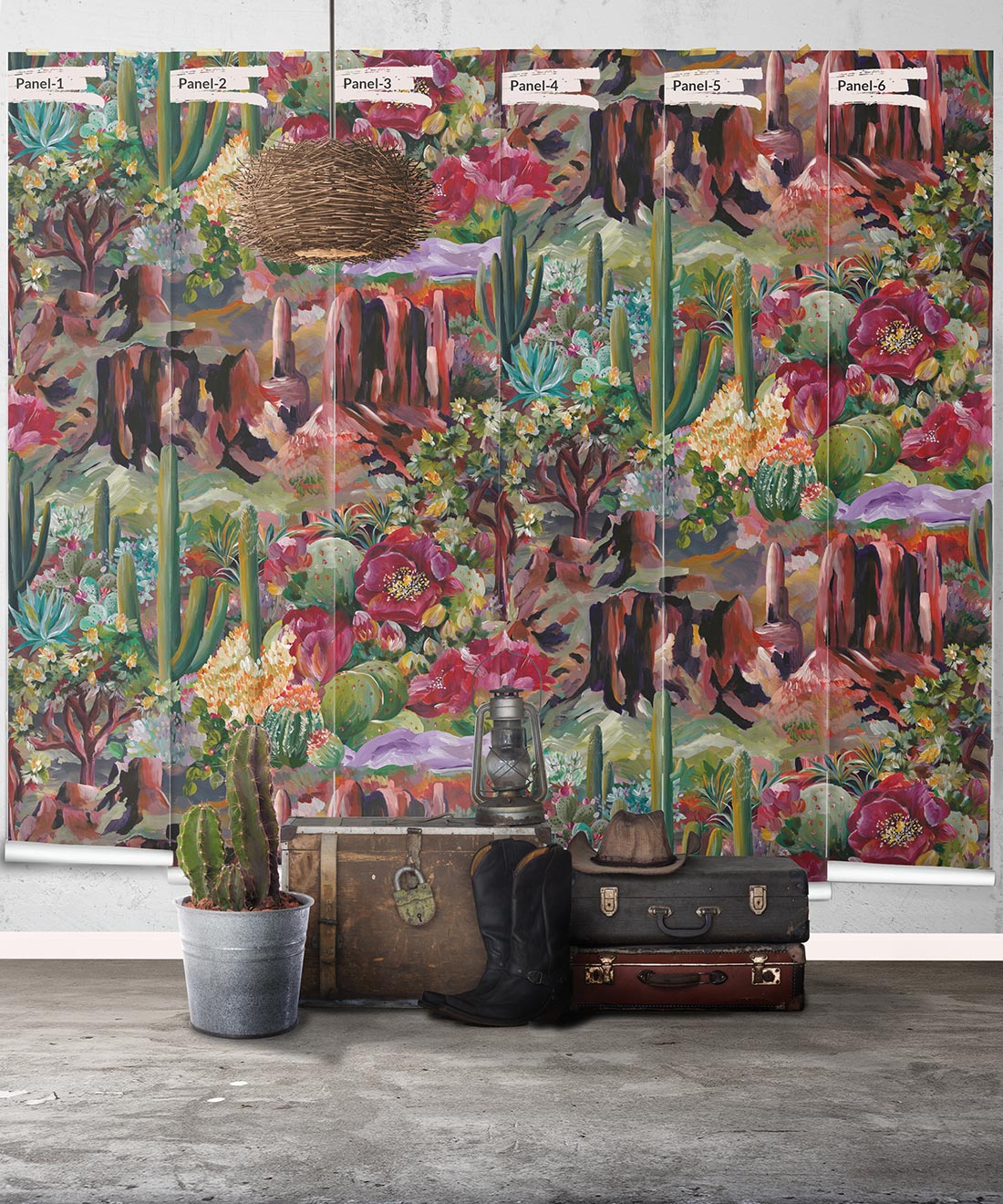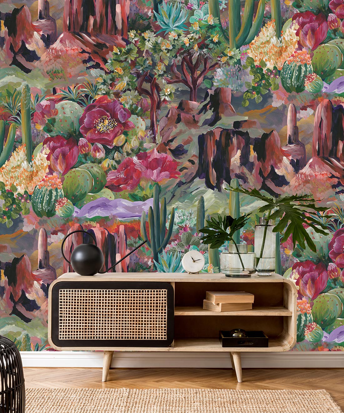 Add a sense of warmth, serenity and adventure to your home with the Desert Skies mural. A painterly landscape featuring sprawling canyons alongside luscious cacti, flora and succulents, Desert Skies is a symphony of colour and contrast. Each colourway showcases a different textural sky, from the fiery sunset hues and inky blues of midnight to the soft pastels of a rising sun, each version is a testament to the everchanging beauty of one of nature’s most captivating landscapes. Designed as a 6 panel repeating mural to convey the grandeur of its rugged terrain whilst ensuring versatility, this design was originally hand-painted in our UK studio, and is available in seven stunning colourways to suit any interior.