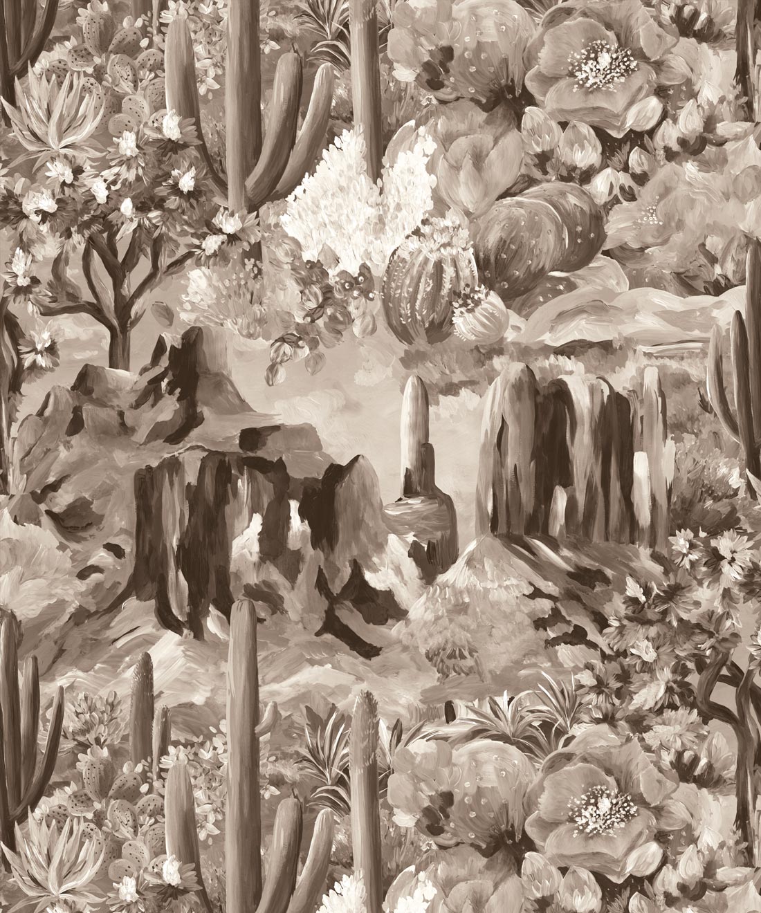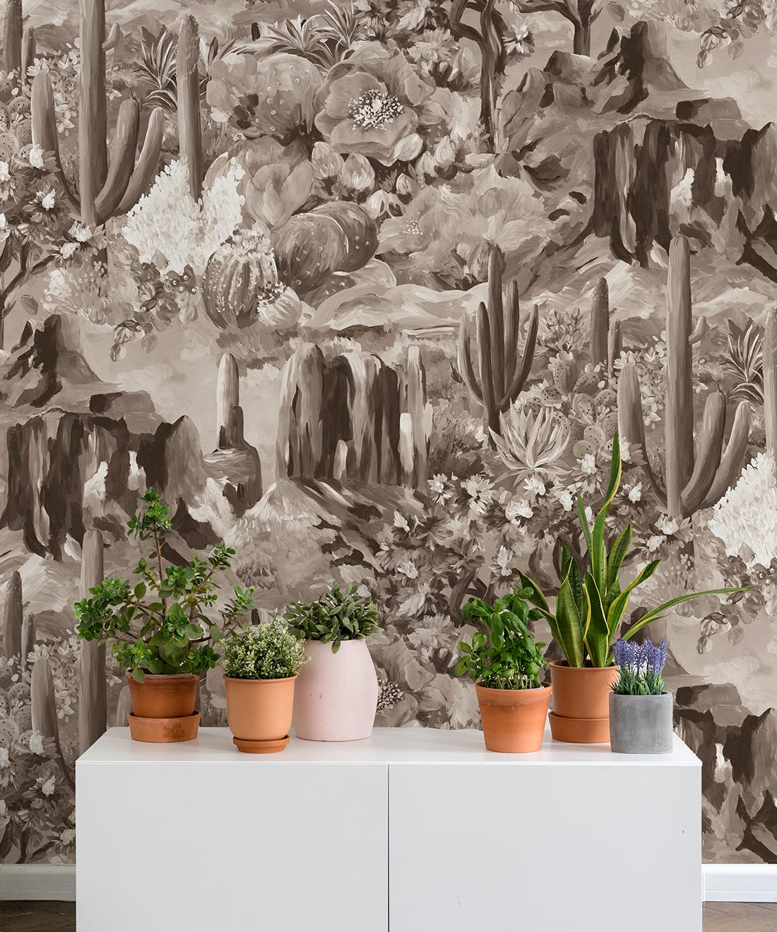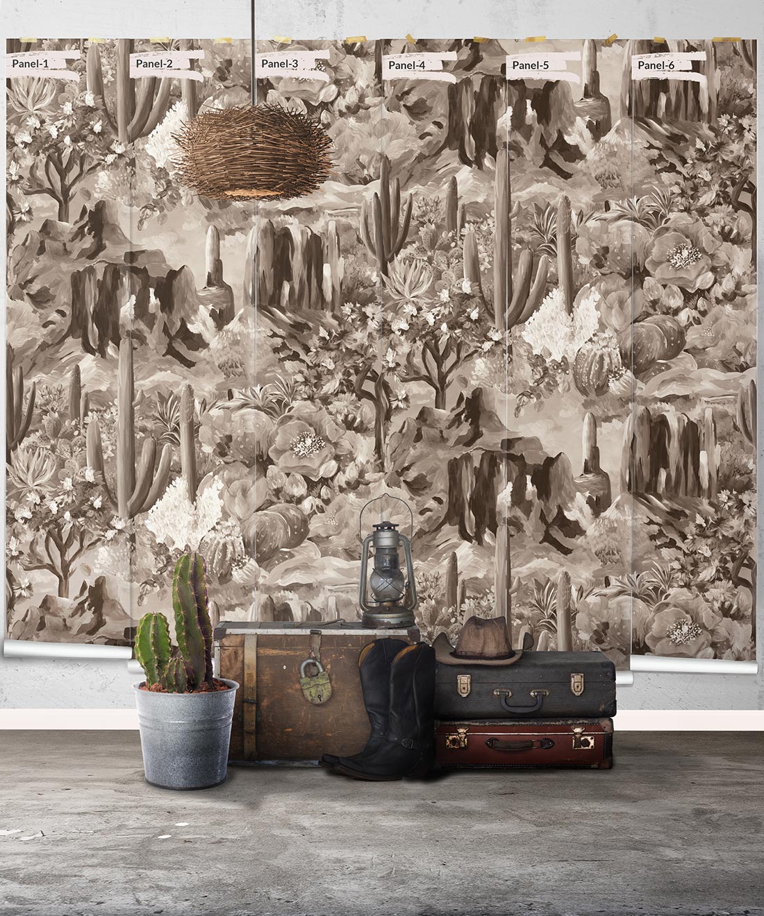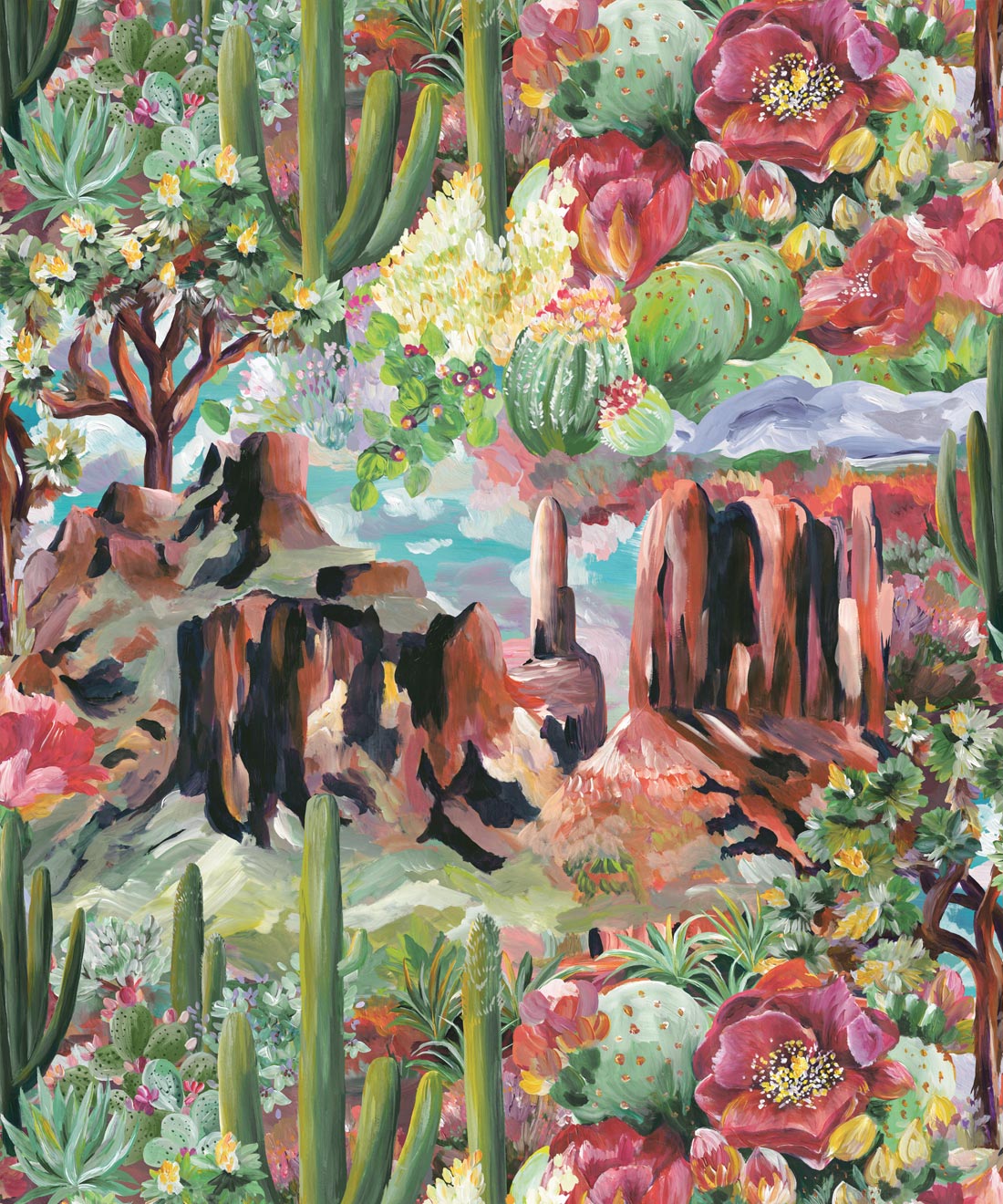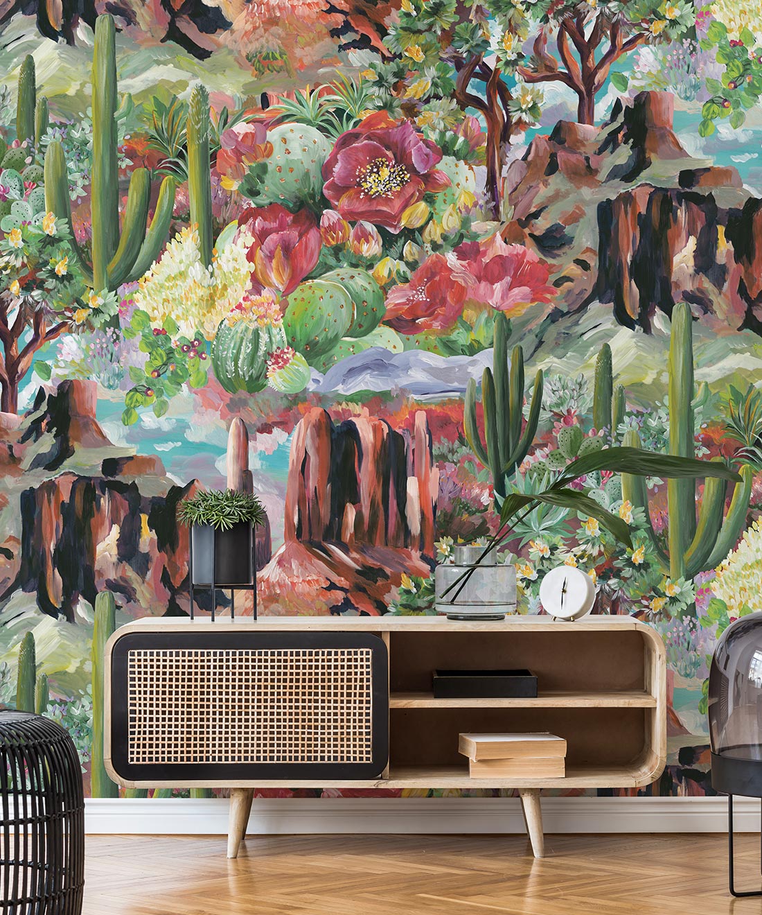 Add a sense of warmth, serenity and adventure to your home with the Desert Skies mural. A painterly landscape featuring sprawling canyons alongside luscious cacti, flora and succulents, Desert Skies is a symphony of colour and contrast. Each colourway showcases a different textural sky, from the fiery sunset hues and inky blues of midnight to the soft pastels of a rising sun, each version is a testament to the everchanging beauty of one of nature’s most captivating landscapes. Designed as a 6 panel repeating mural to convey the grandeur of its rugged terrain whilst ensuring versatility, this design was originally hand-painted in our UK studio, and is available in seven stunning colourways to suit any interior.