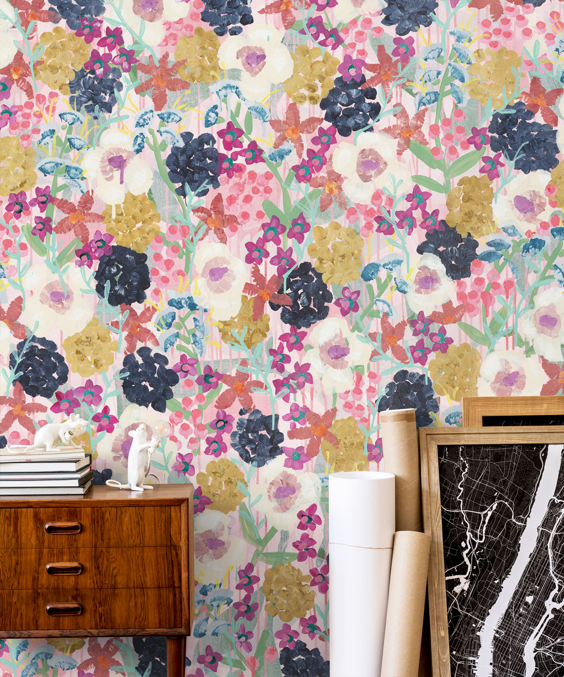 Garden State Wallpaper is a rich full floral that is both fun and modern. Its deep maroons and mustards give it mood and the rough blending of dual tone paints give enormous visual texture to the brush strokes. The soft pink background will provide lightness to your space and the flowers will become the feature of the room. There is plenty of playful movement in the flowers and so many beautiful painterly textures to admire in this wallpaper. Garden State is perfect for the bedroom, bathroom or virtually anywhere.