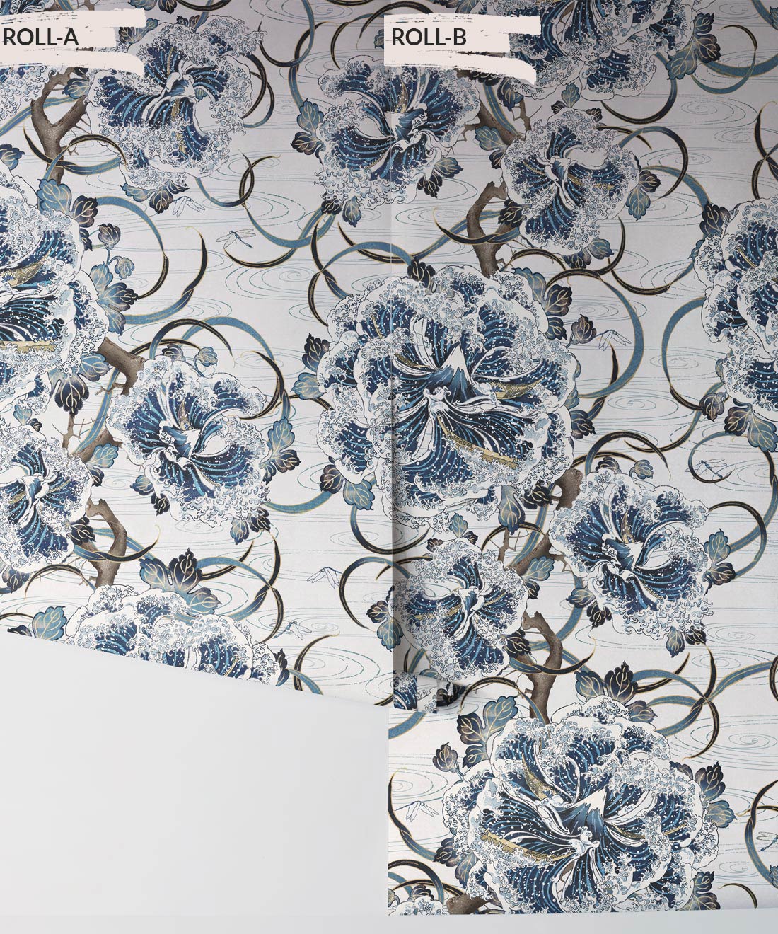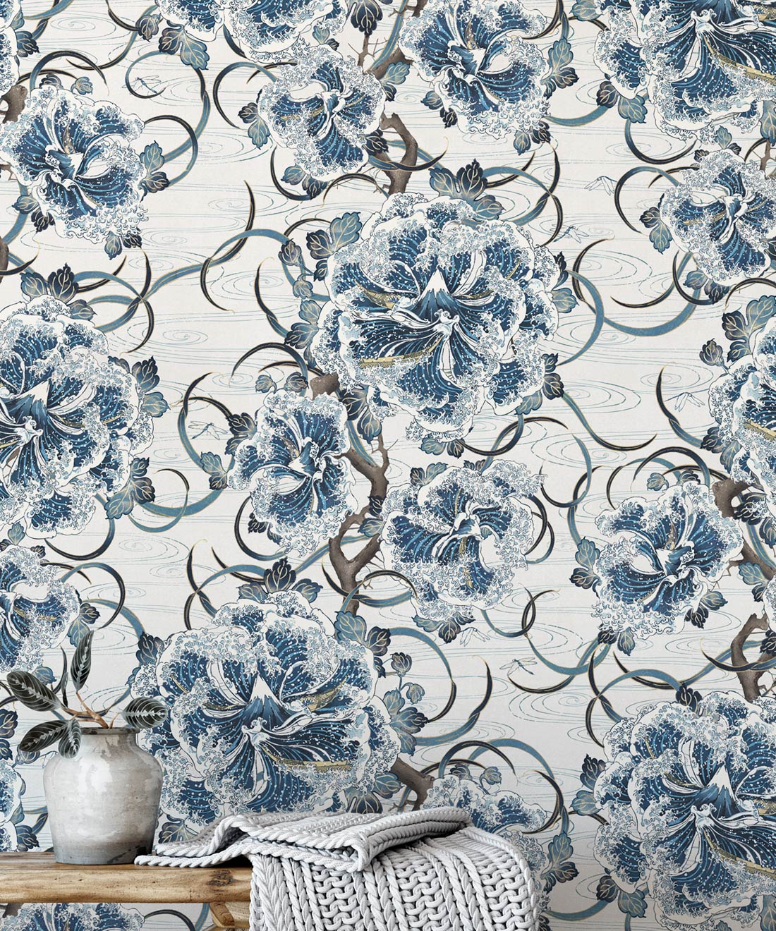 A Japanese wallpaper celebrating the essence of the Ukiyo-e movement, an inspired intermingling between the stunning Japanese art of Ikebanaa (flower arrangement) and a captivating re-imagining of Hokusai’s iconic yet timeless “The Great Wave off Kanagawa”. This surreal wallpaper functions from afar as an engaging omen to traditional depictions of awe-inspiring Japanese floral designs, however in detail, pays homage to the original wood-block print, featuring wild seas, boats with fishermen and mountain scapes. Above all Great Wave Bloom is a tribute to the beauty of Japanese culture and arts.