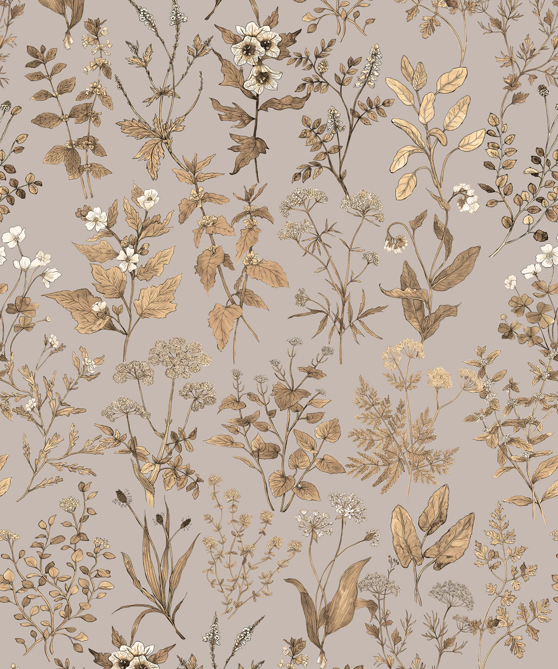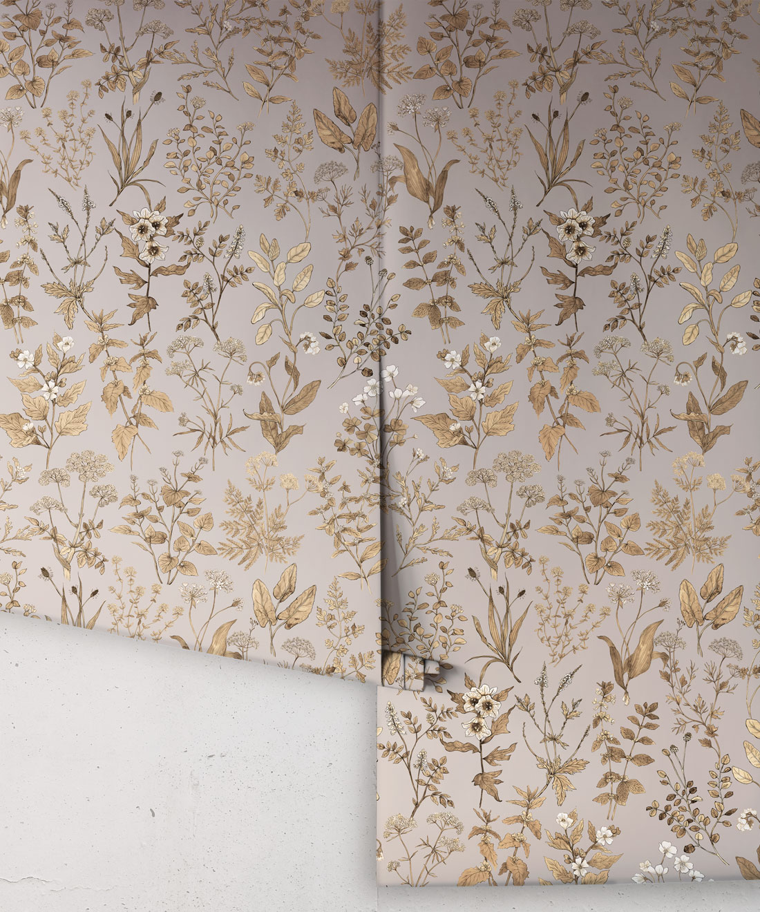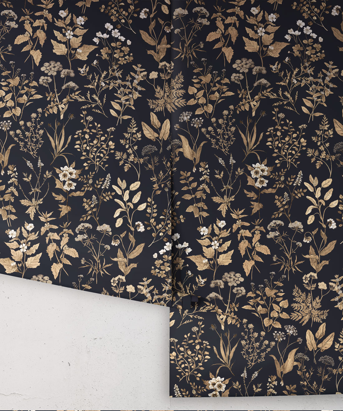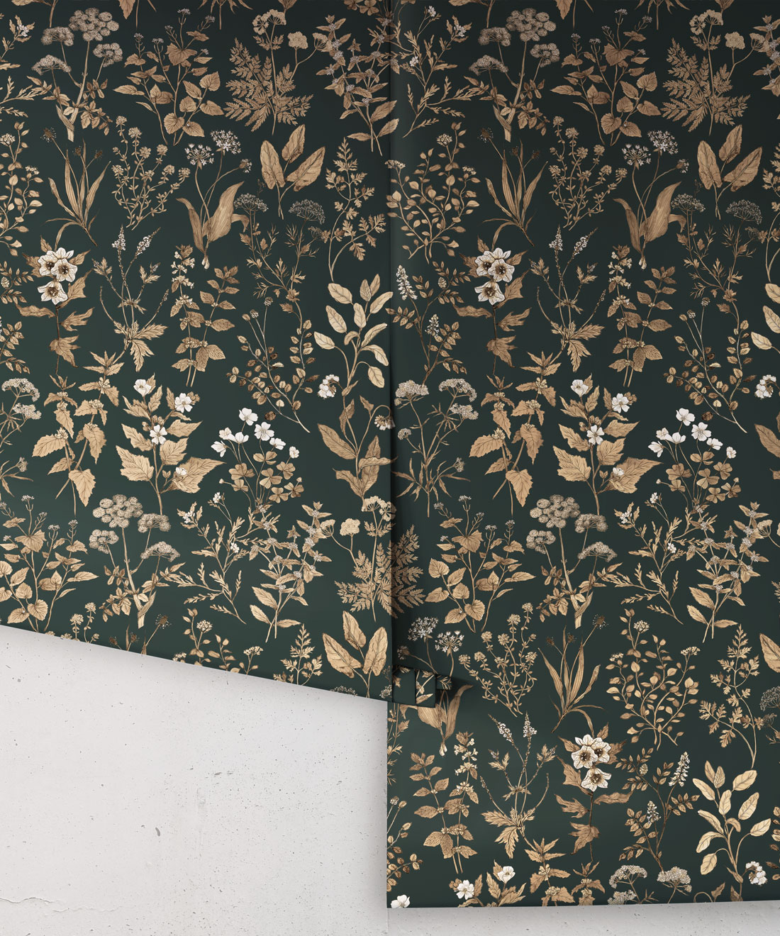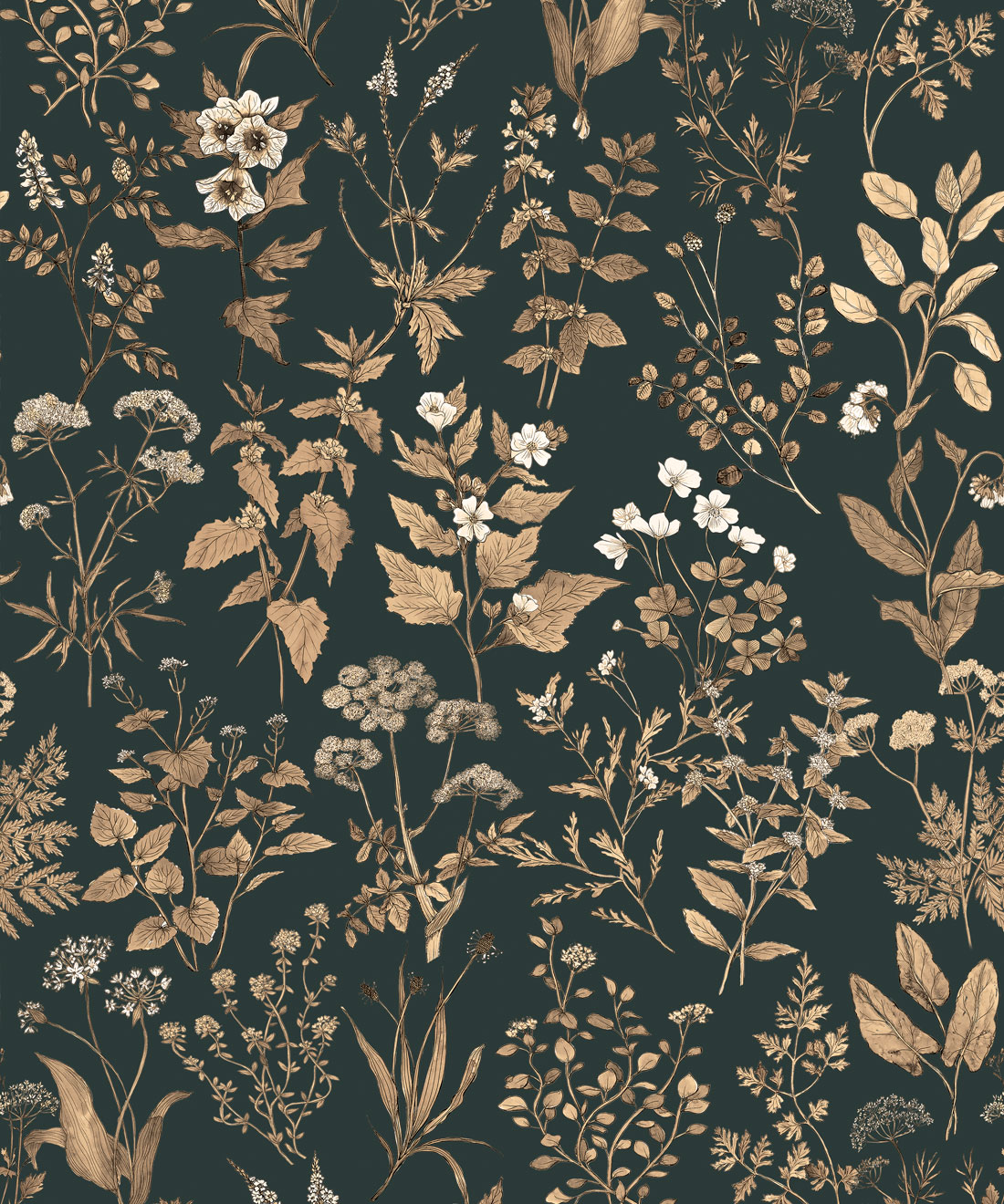 Inspired by the artist’s own journey into the world of herbs, learning about them and their importance for health and wellbeing, and incorporating them into her daily routine, the Herbarium Antique wallpaper is an ode to this magnificent topic. The artist has combined hand drawn elements and watercolours on rich Victorian backgrounds for this stunning herbal wallpaper, featuring forest greens, deep blues and lots of antique gold and silvery shades.