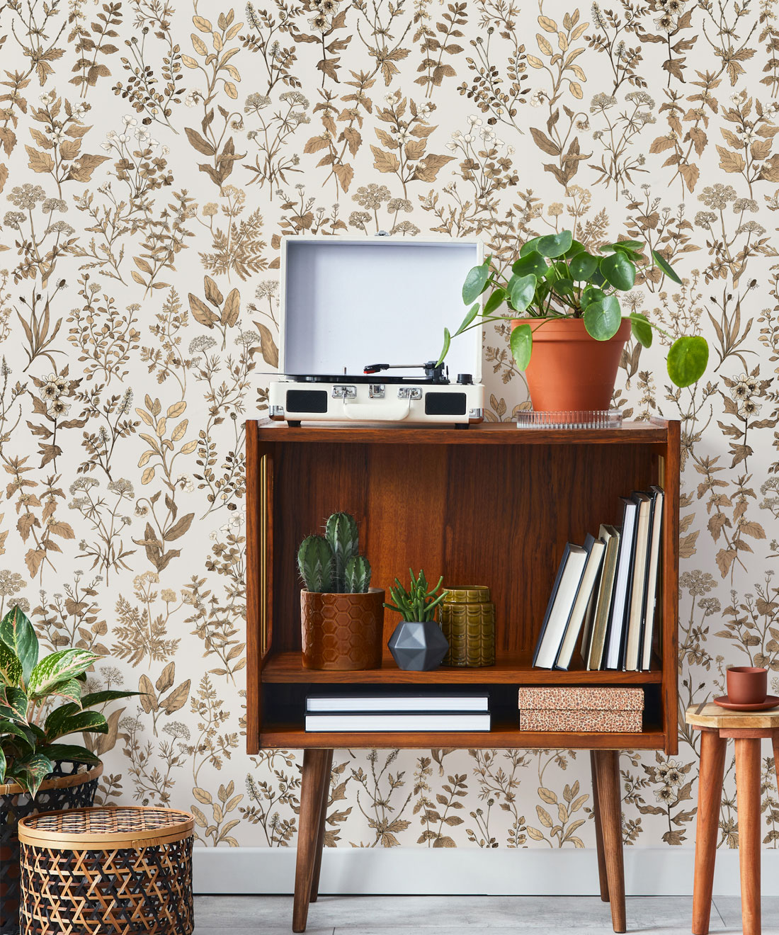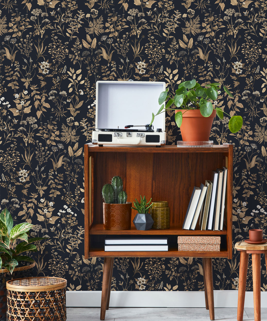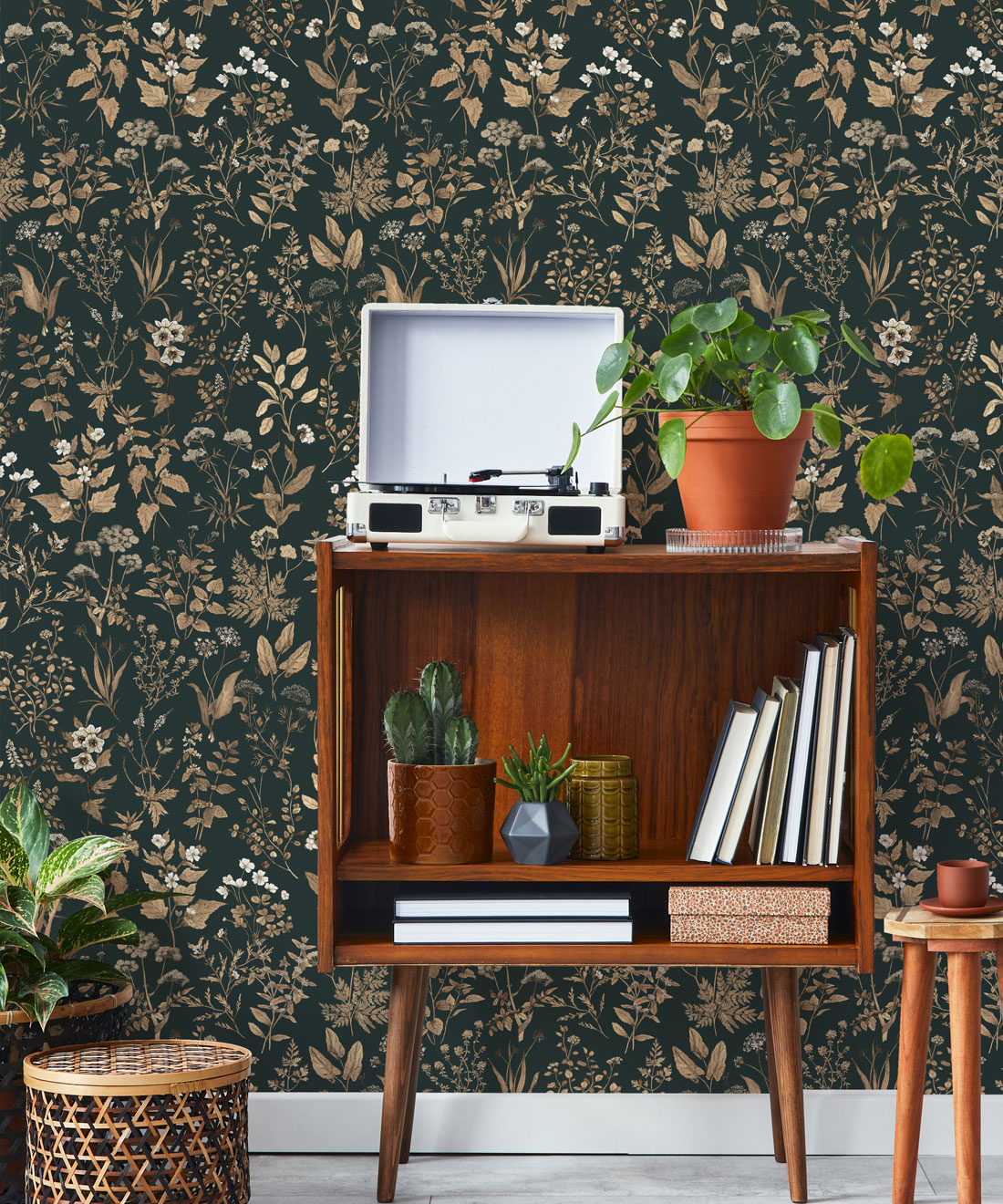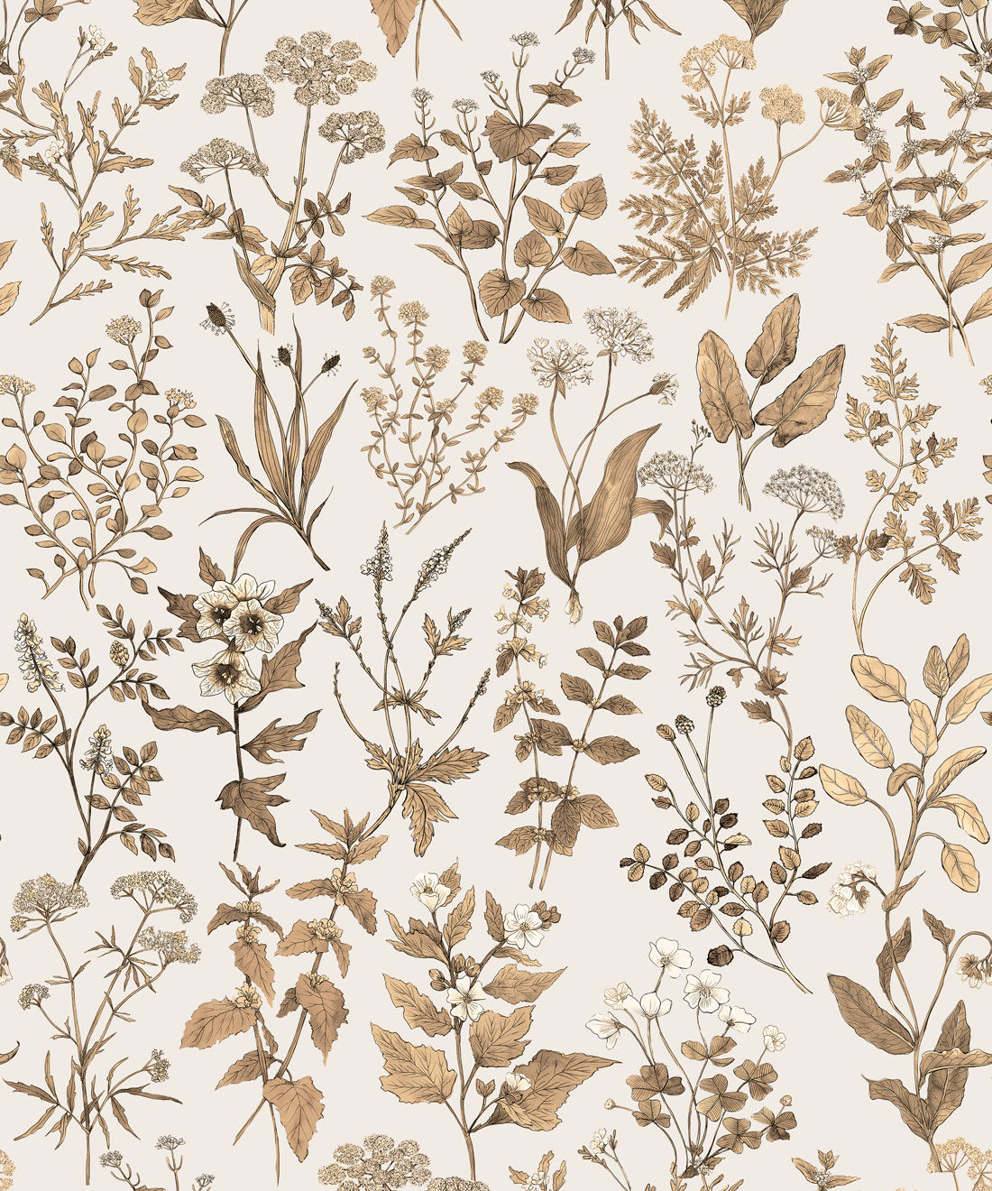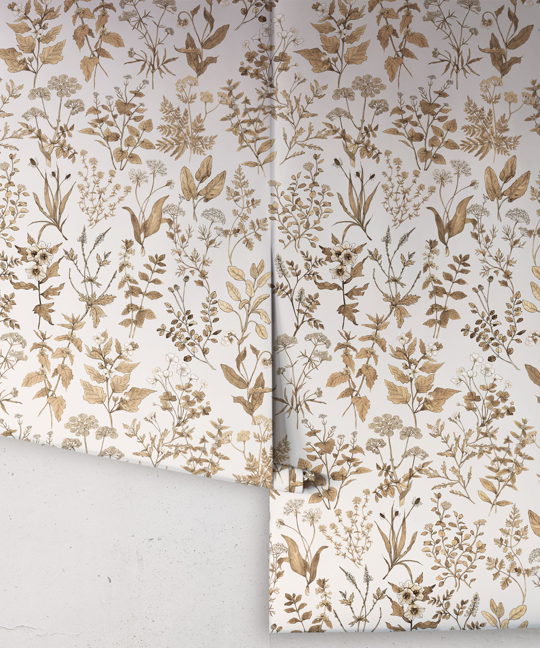 Inspired by the artist’s own journey into the world of herbs, learning about them and their importance for health and wellbeing, and incorporating them into her daily routine, the Herbarium Antique wallpaper is an ode to this magnificent topic. The artist has combined hand drawn elements and watercolours on rich Victorian backgrounds for this stunning herbal wallpaper, featuring forest greens, deep blues and lots of antique gold and silvery shades.