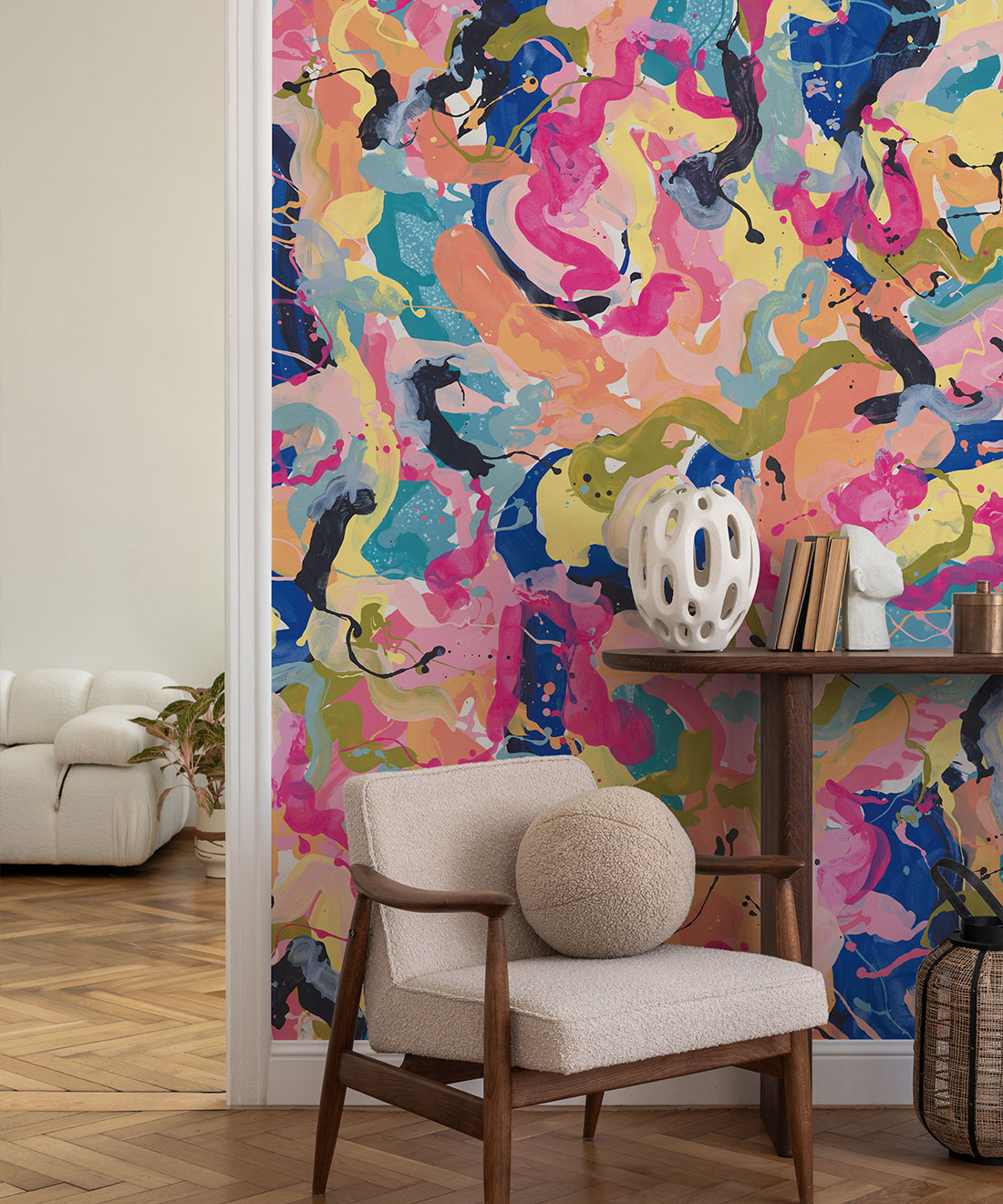 Tiff Manuell is an artist and designer from Adelaide, South Australia who is known for her signature style of colourful art pieces. They are rich with textures using various painting techniques and brushes. Tiff often uses drip-style painting to add a layer of depth to many of her designs. Her most popular designs feature abstract expressionistic artworks brought to life with acrylics on artistic canvas. In addition to her wallpaper collection with Milton & King, her designs can be found on a wide array of products such as bags, clothing, greeting cards and accessories.