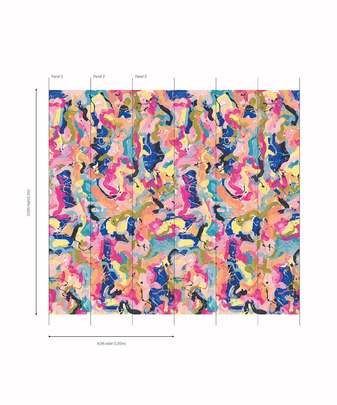 Designed as panels that are 129.6″ high x 24″ wide. Each roll comes with 3 panels. When calculating the quantity required. Simply divide your wall width by the panel width. For example. 142” wide / 24” = 5.8 drops ≈ 6 Panels: 2 Rolls.