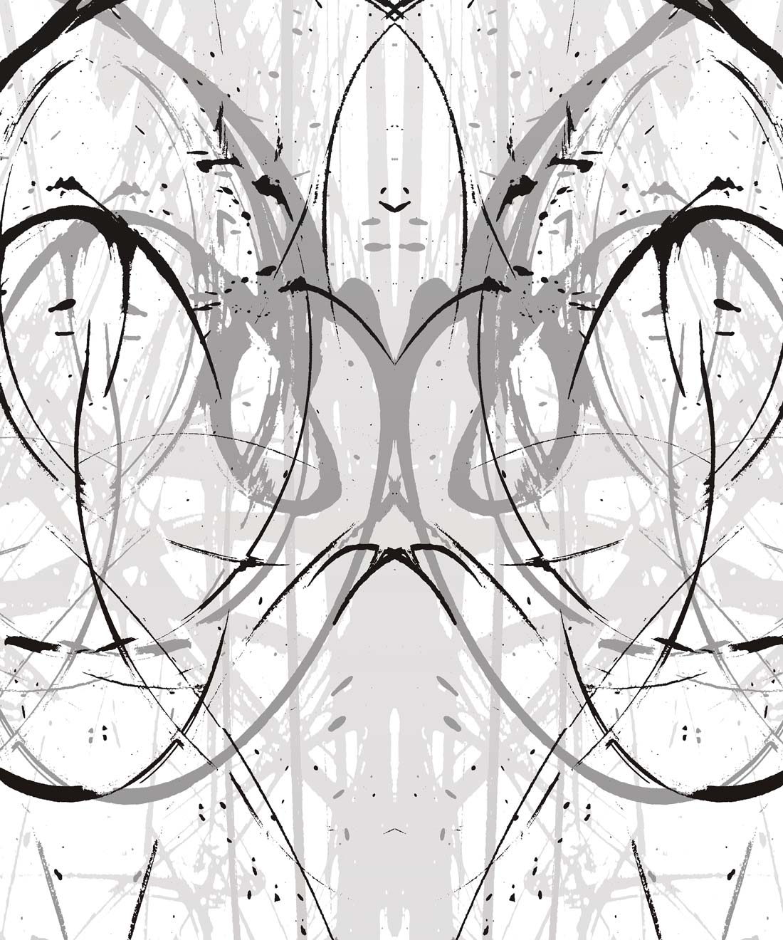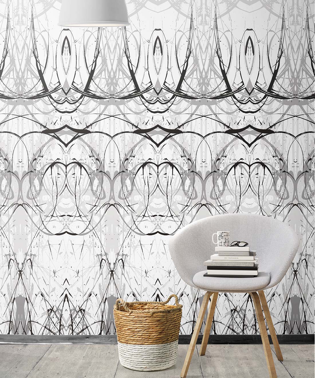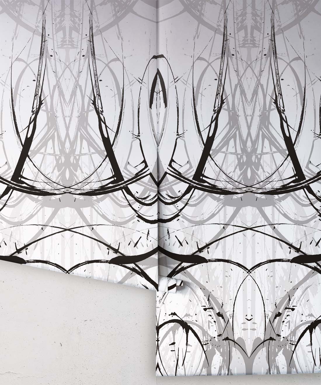 Penthu wallpaper features bold black and grey lines that sweep dramatically over a crisp white surface. Combining the organic hand-drawn mark within a formal pattern creates a show-stopping background. This black & white wallpaper is contemporary and stunning, perfect for a sophisticated bedroom or luxurious bathroom.