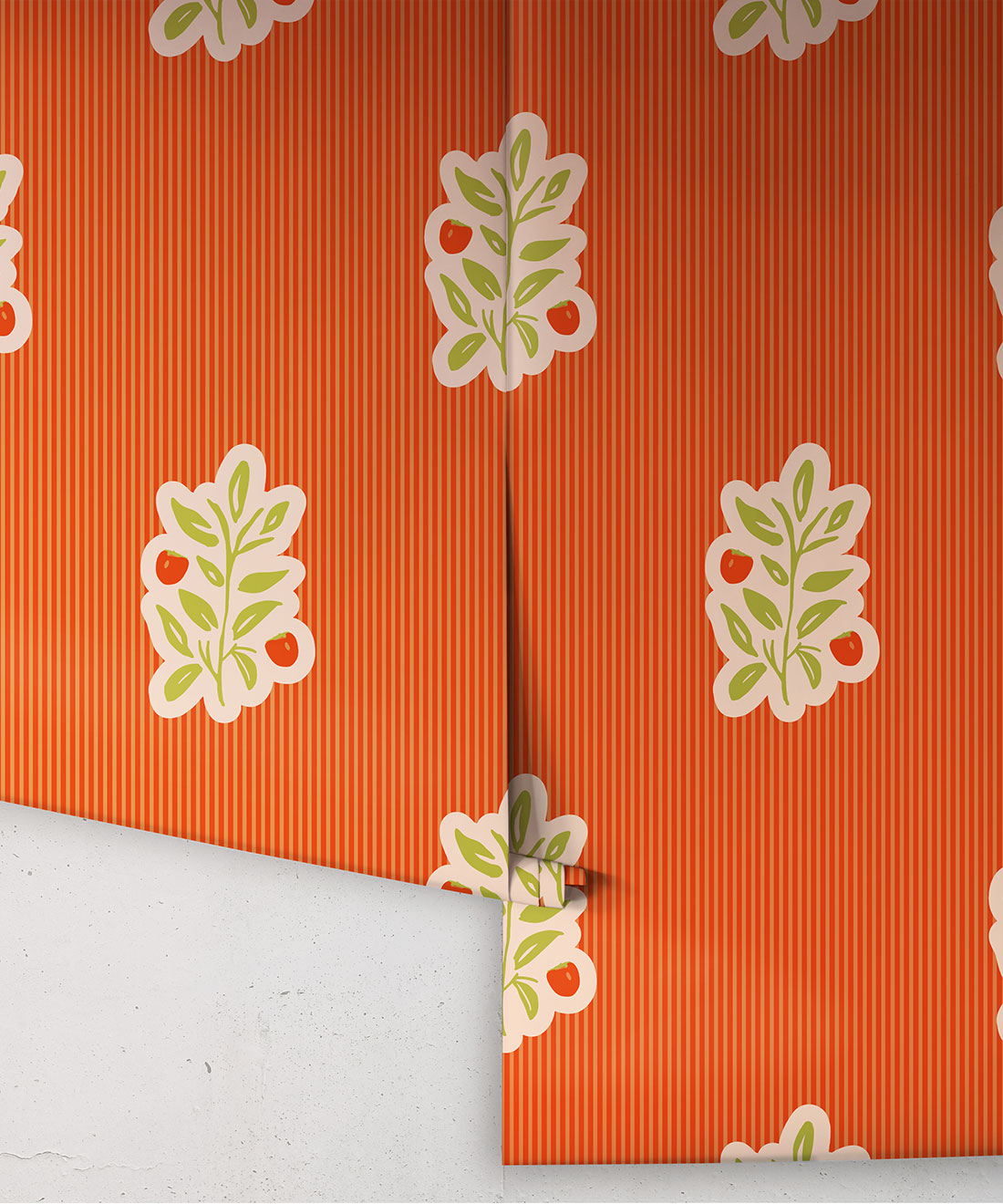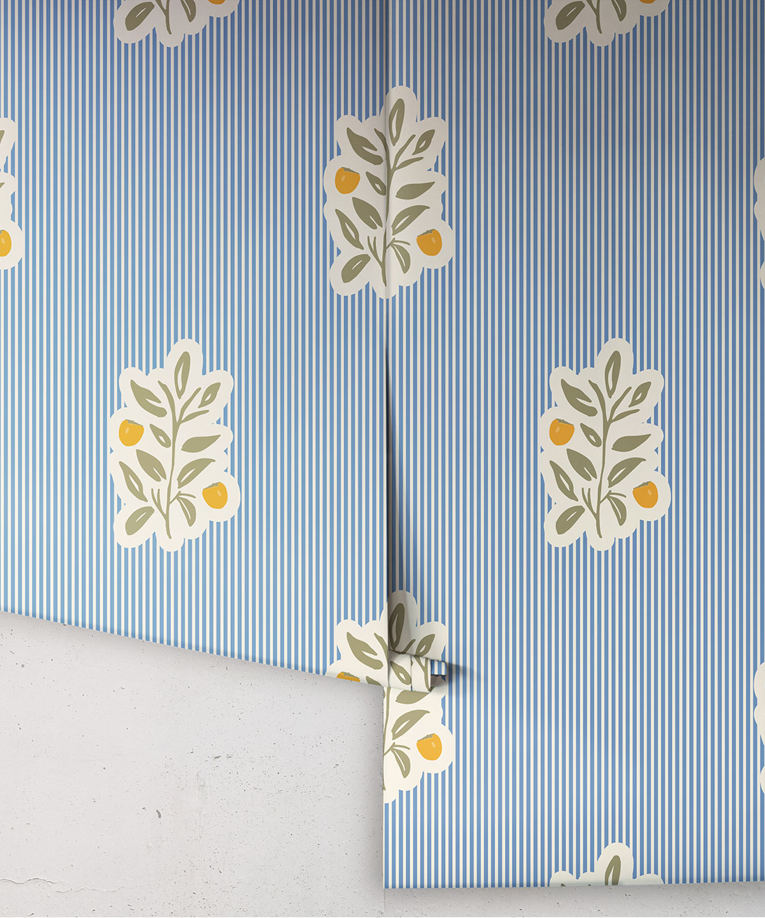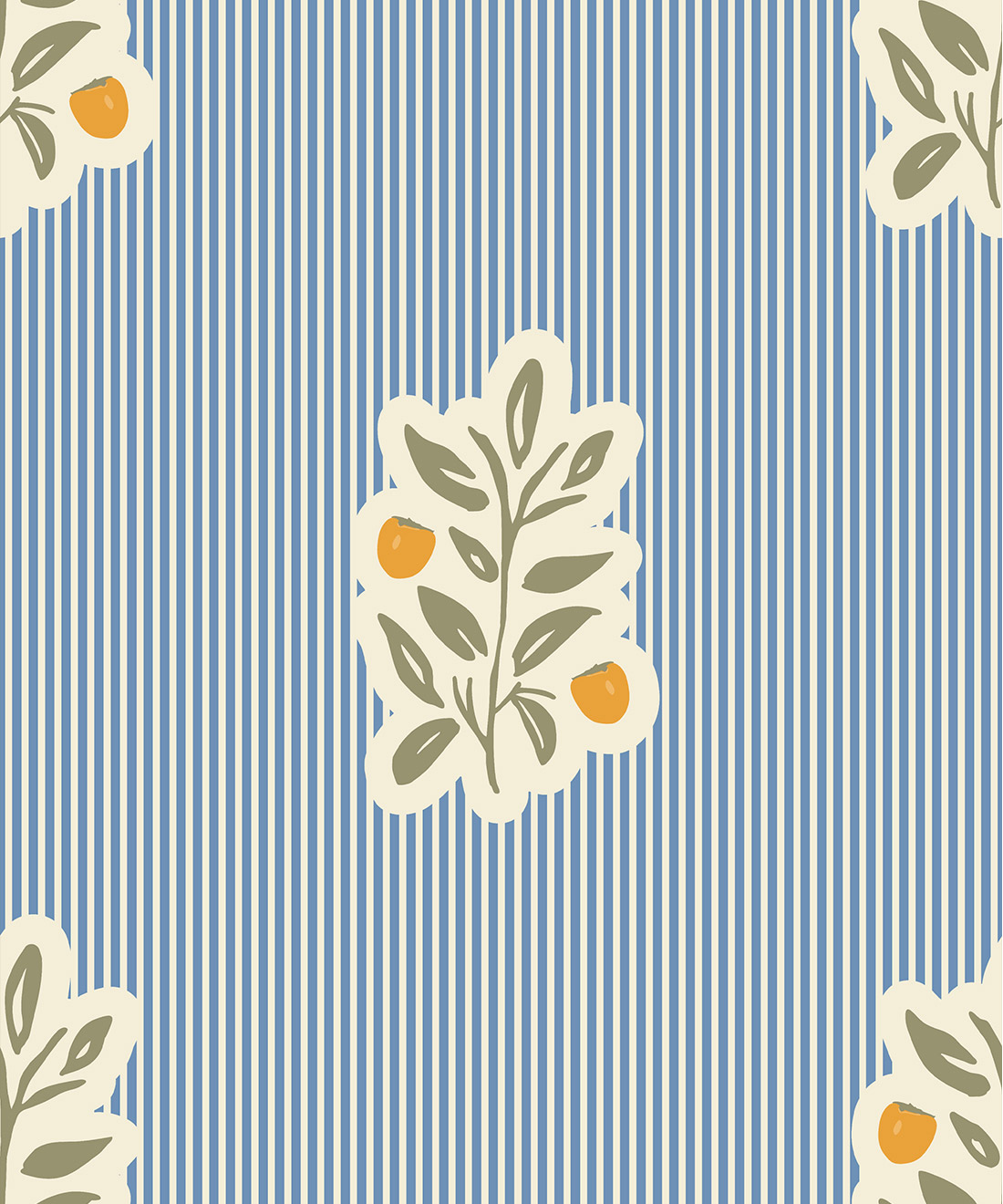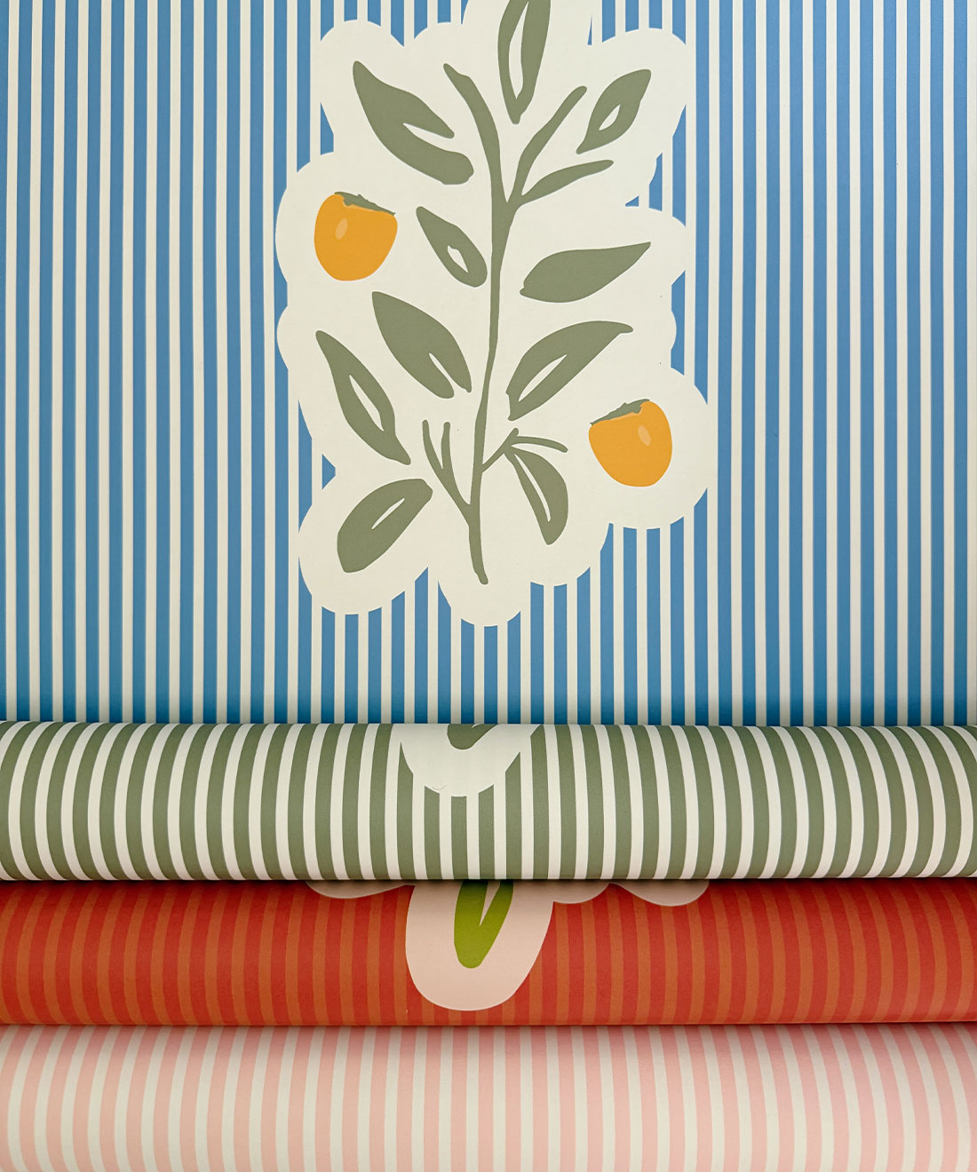 She’s bold. She’s floral. She absolutely does not go quietly. Piper, Nooooo is what happens when sweet meets sassy. A spirited repeat featuring a hand-painted fruit and foliage medallion set against playful pinstripes. With a full range of juicy colourways like tangerine, peachy pink, and classic blue and orange, this design walks into a room and owns it. If your walls are ready for something unexpected (with a wink), Piper’s your girl.