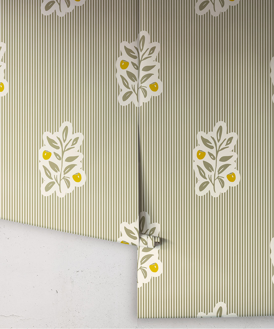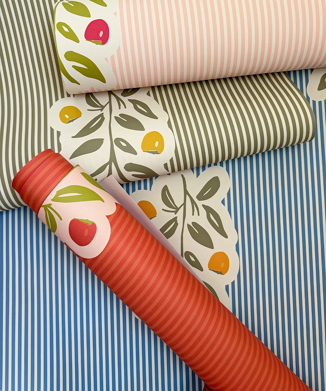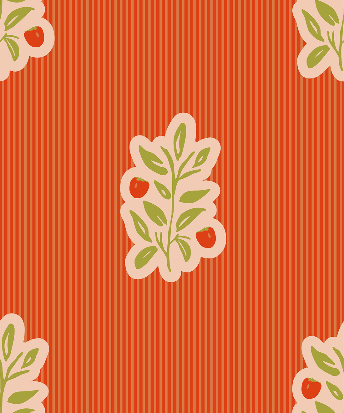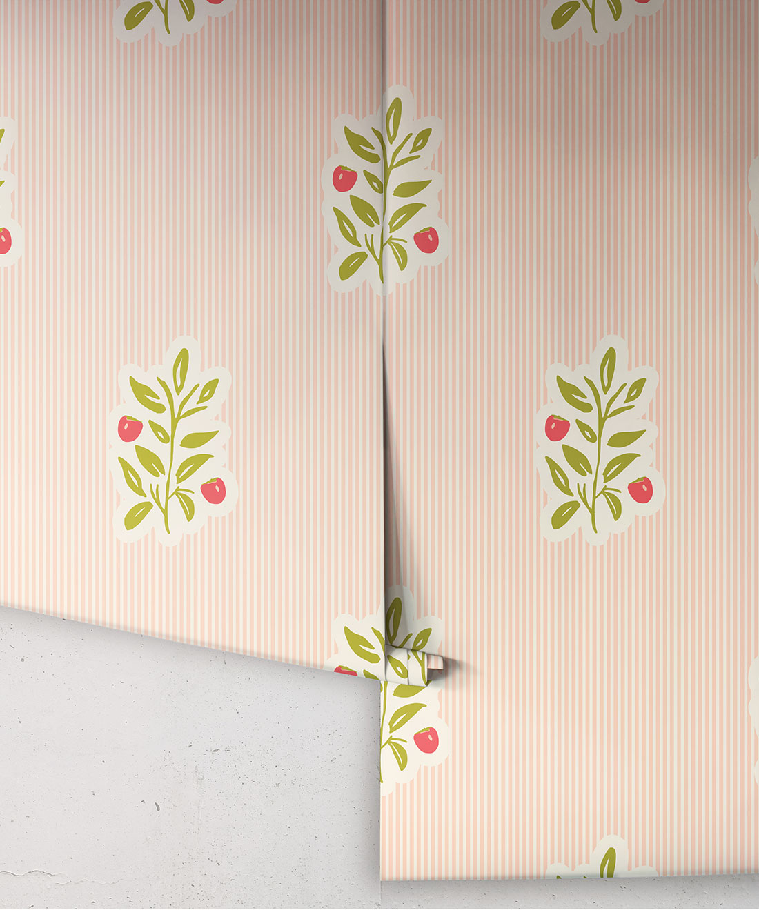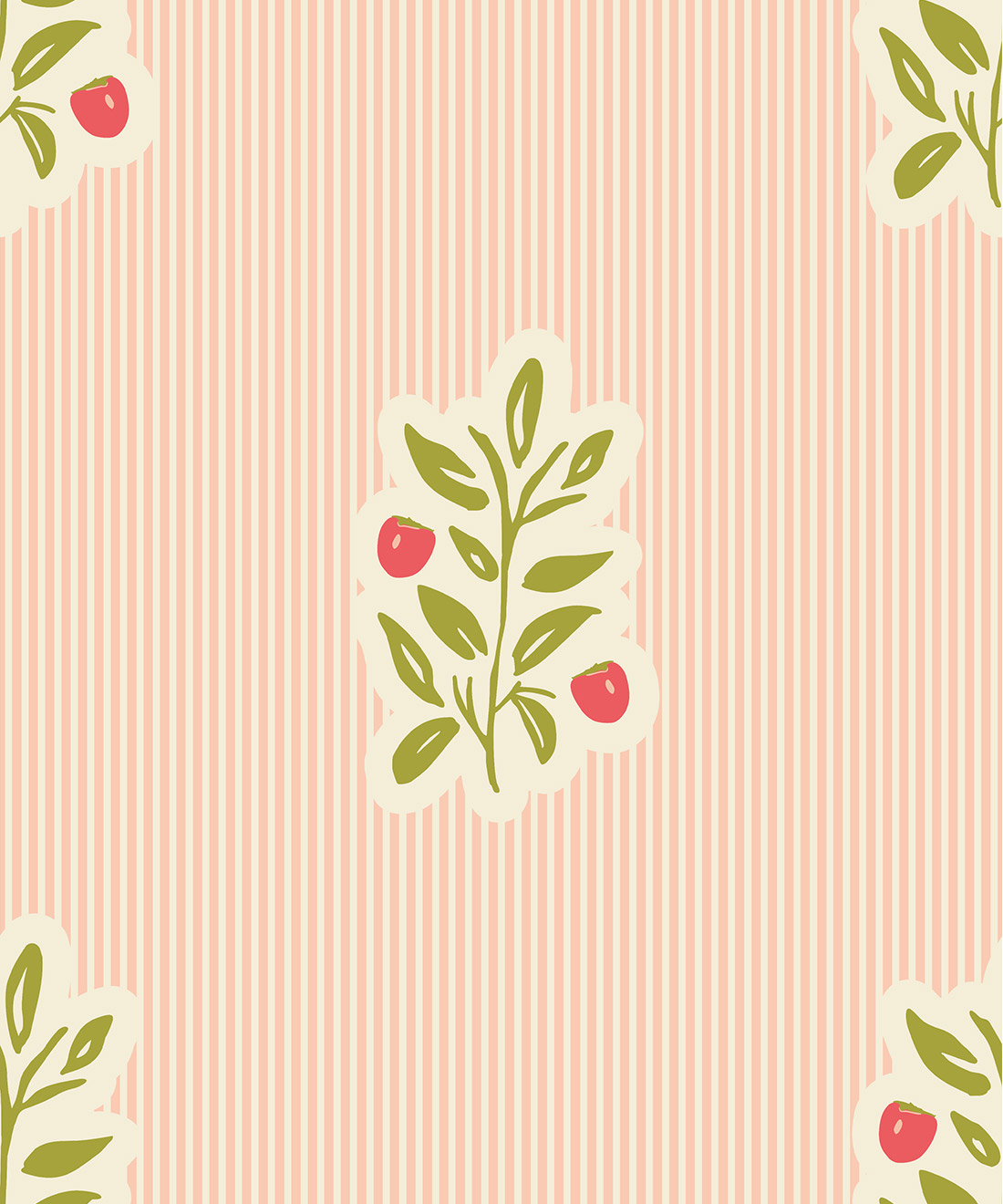 She’s bold. She’s floral. She absolutely does not go quietly. Piper, Nooooo is what happens when sweet meets sassy. A spirited repeat featuring a hand-painted fruit and foliage medallion set against playful pinstripes. With a full range of juicy colourways like tangerine, peachy pink, and classic blue and orange, this design walks into a room and owns it. If your walls are ready for something unexpected (with a wink), Piper’s your girl.