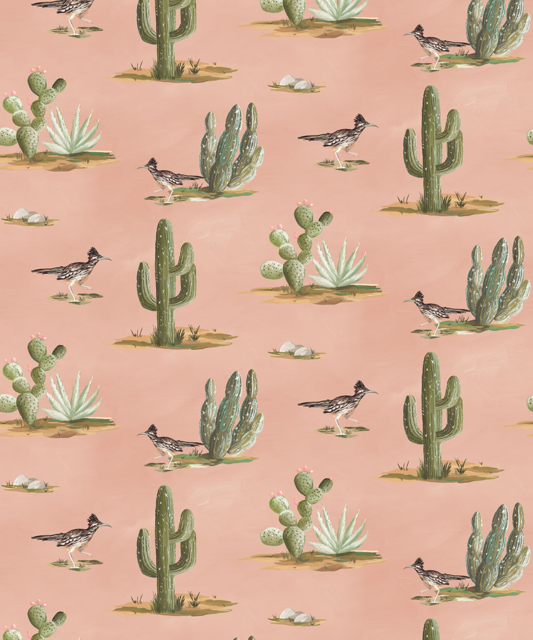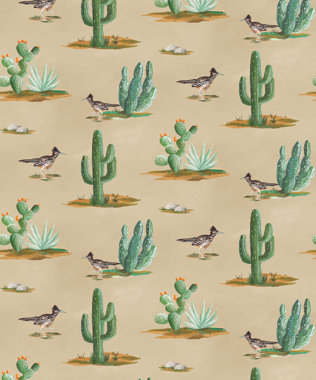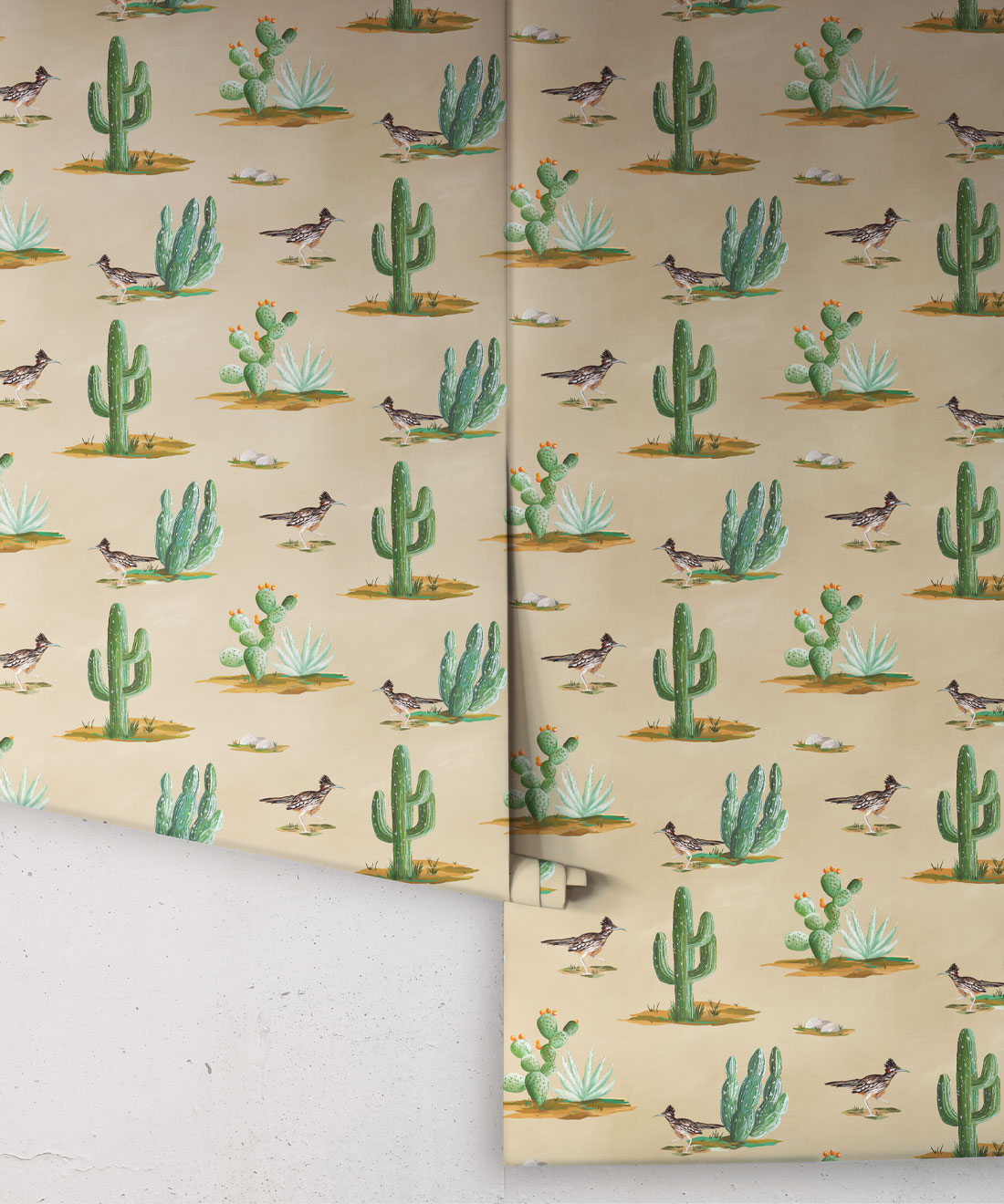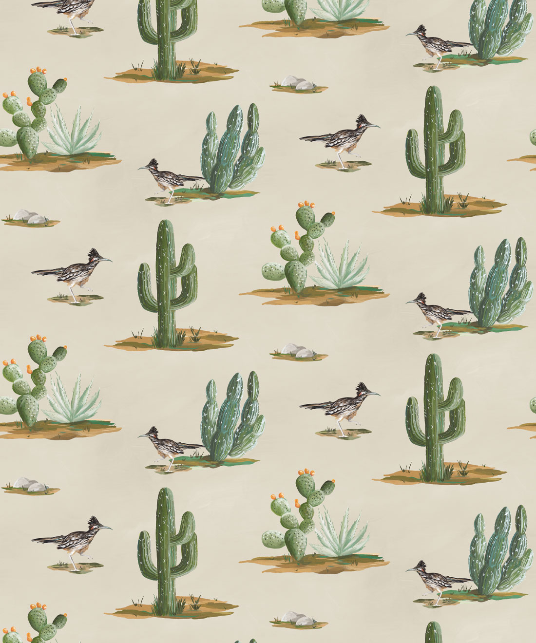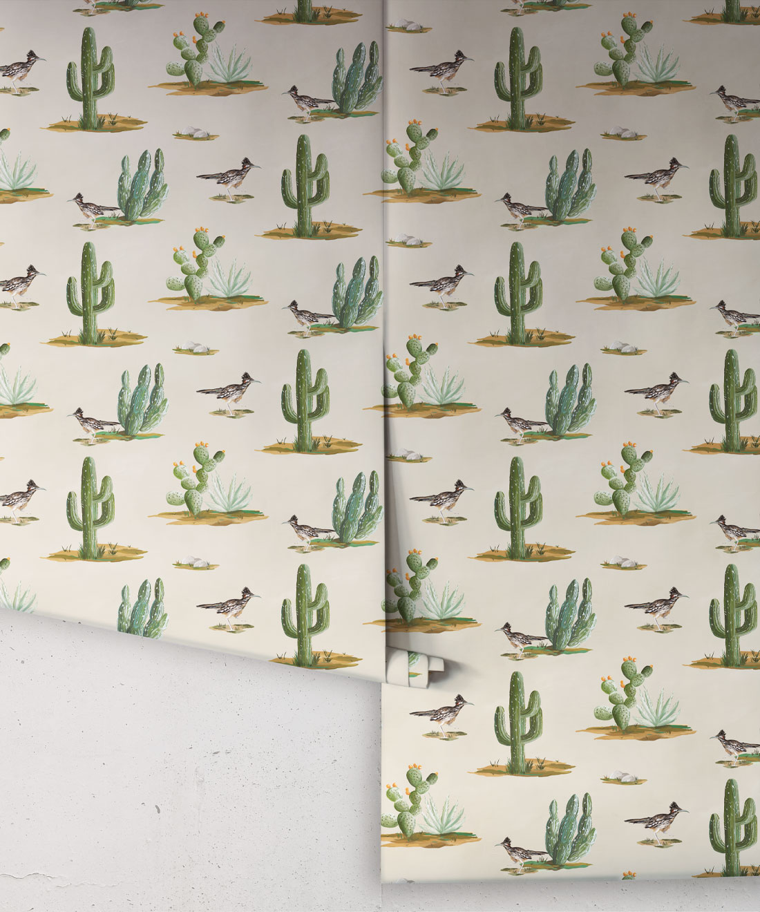 Roadrunner wallpaper is a delightfully simple design depicting the vibrant and resilient spirit of the desert and its wildlife. The roadrunner is regarded by some Indigenous cultures as a symbol of exceptionally good luck. Featuring hand painted illustrations of roadrunners, cacti and other desert plants, the design creates a harmonious and engaging scene that will bring the warmth of the desert and the luck of the roadrunner into any space.