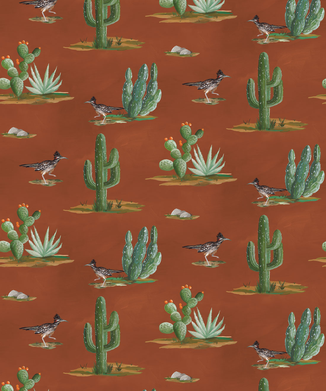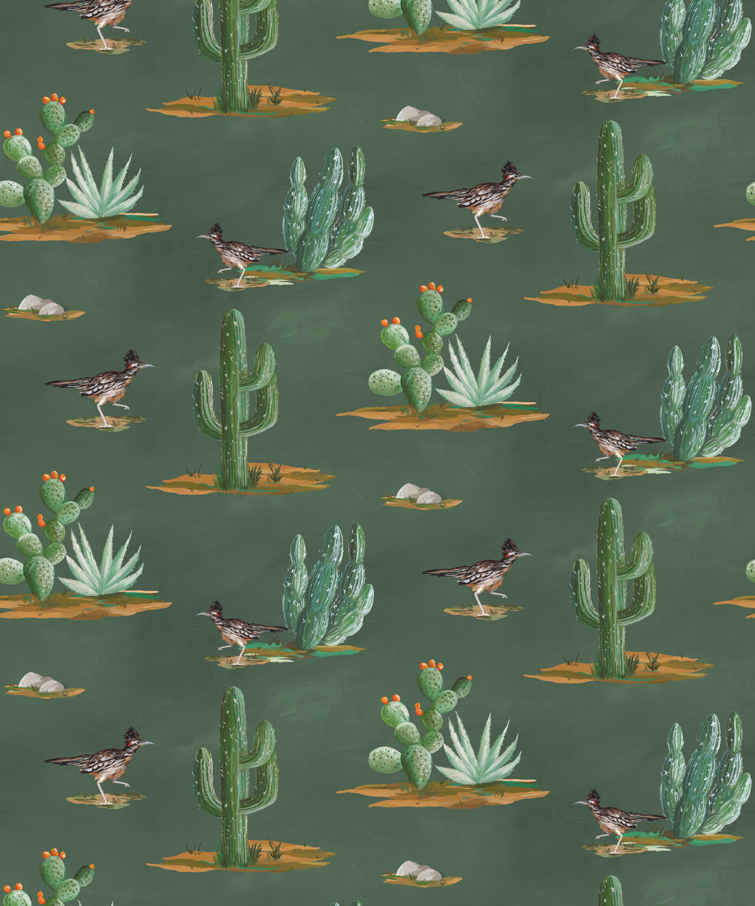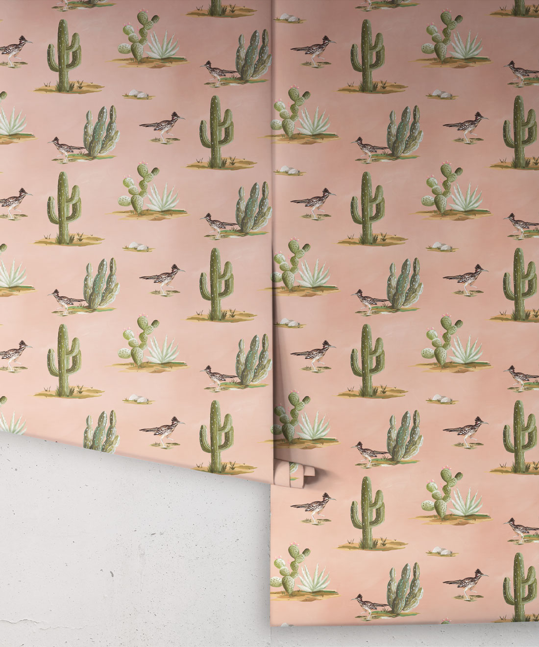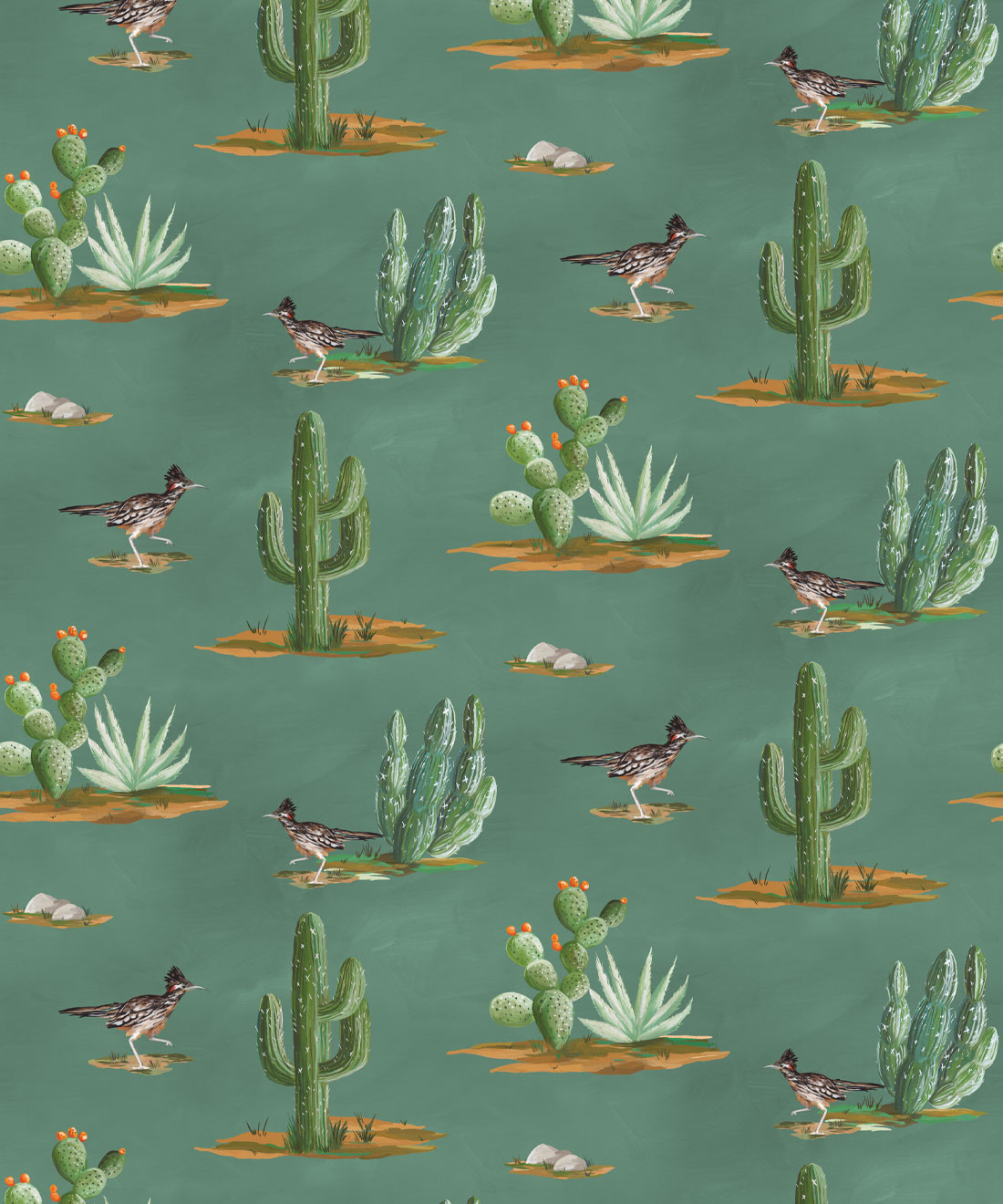 Roadrunner wallpaper is a delightfully simple design depicting the vibrant and resilient spirit of the desert and its wildlife. The roadrunner is regarded by some Indigenous cultures as a symbol of exceptionally good luck. Featuring hand painted illustrations of roadrunners, cacti and other desert plants, the design creates a harmonious and engaging scene that will bring the warmth of the desert and the luck of the roadrunner into any space.