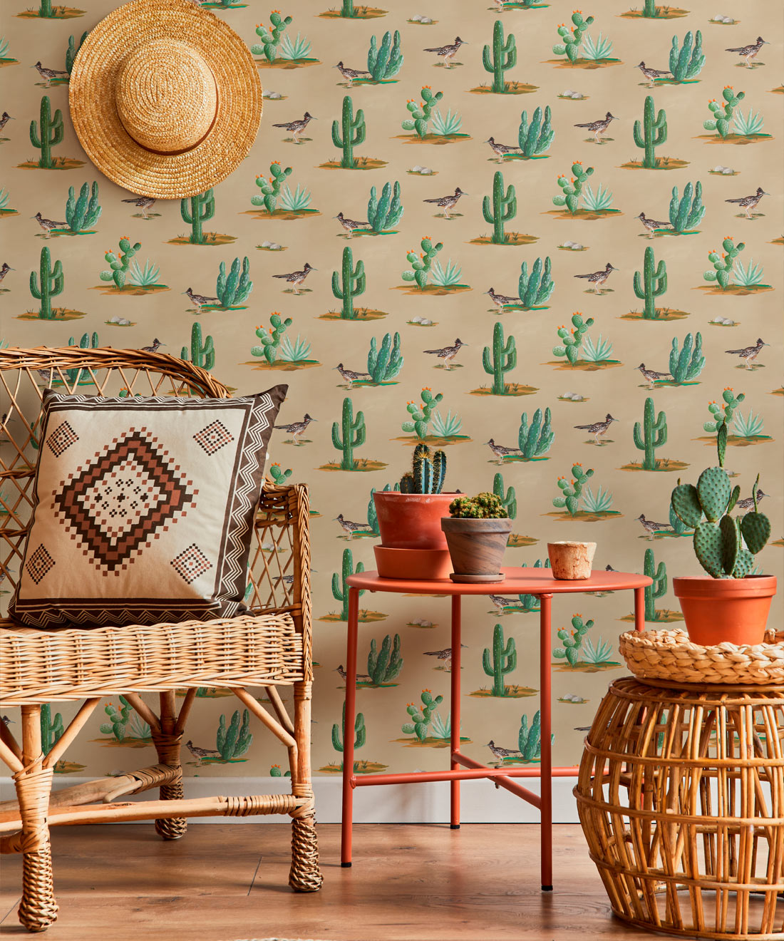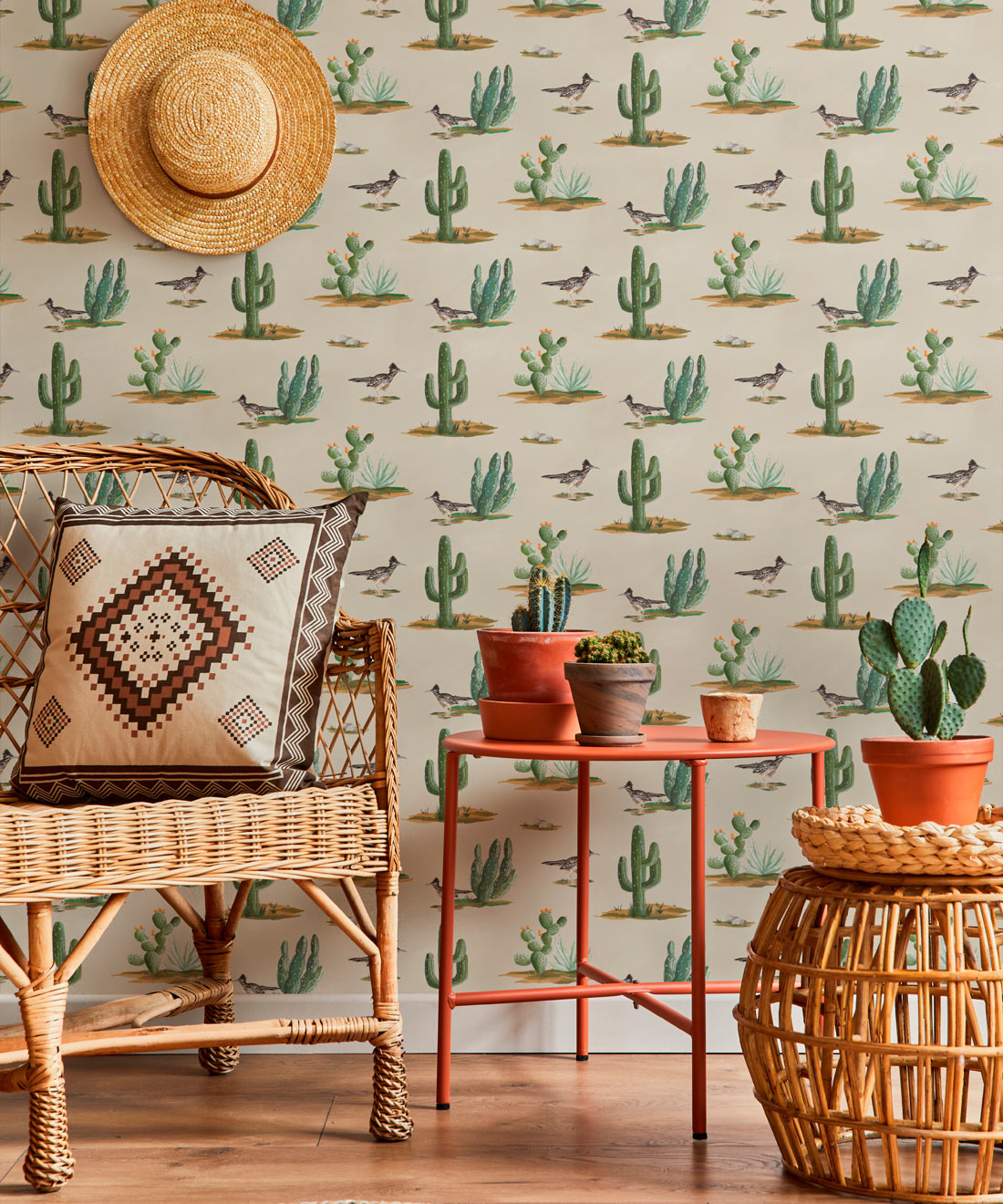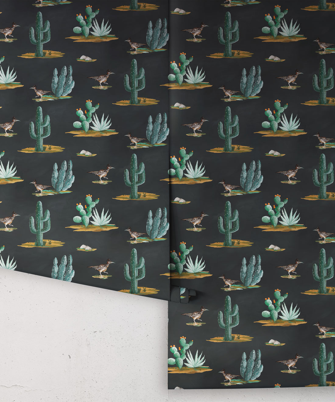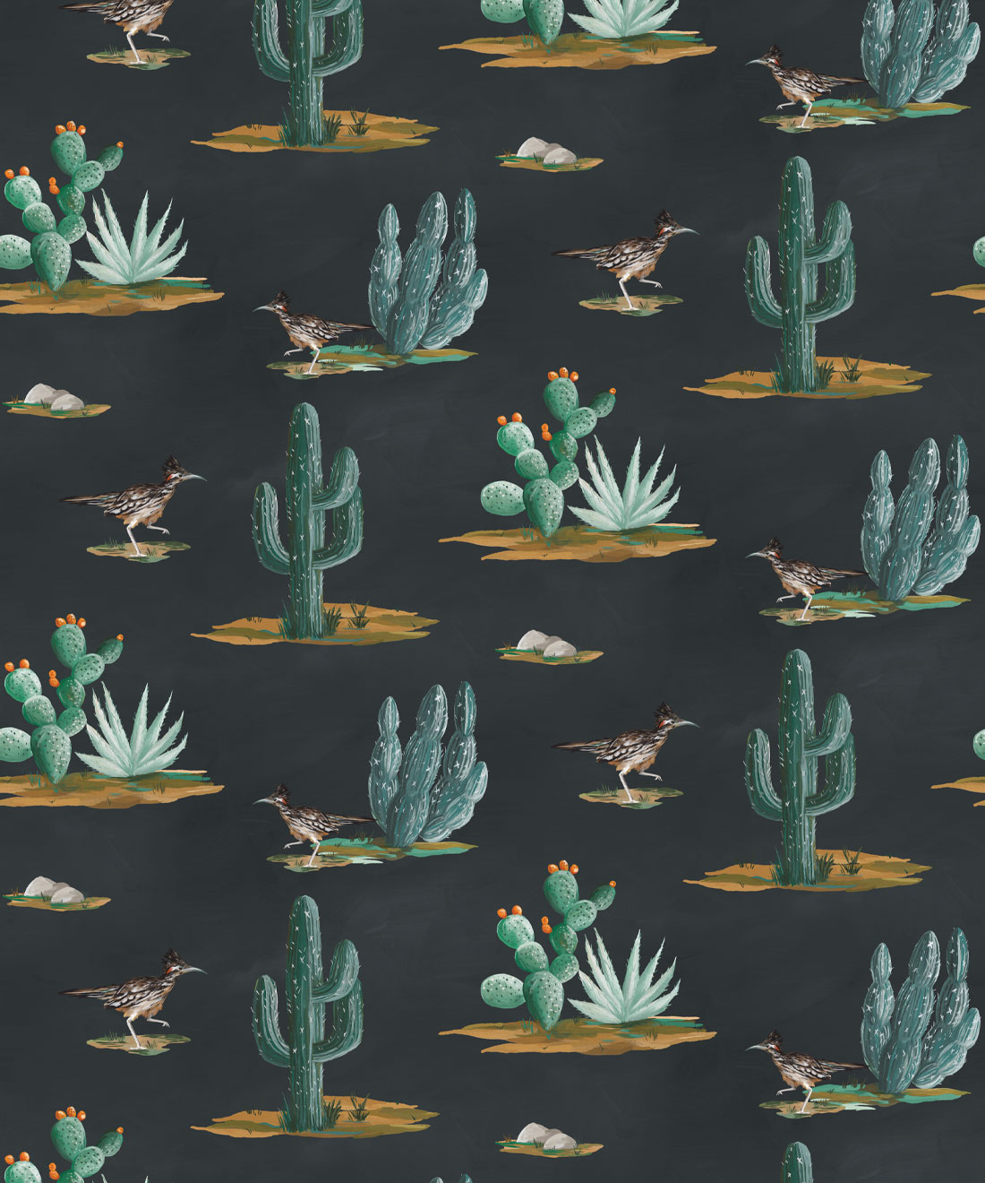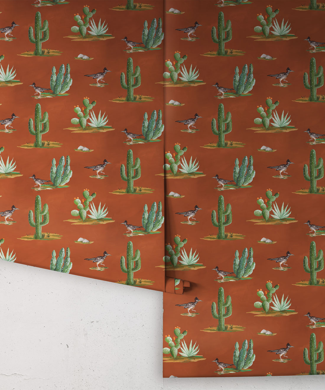 Roadrunner wallpaper is a delightfully simple design depicting the vibrant and resilient spirit of the desert and its wildlife. The roadrunner is regarded by some Indigenous cultures as a symbol of exceptionally good luck. Featuring hand painted illustrations of roadrunners, cacti and other desert plants, the design creates a harmonious and engaging scene that will bring the warmth of the desert and the luck of the roadrunner into any space.