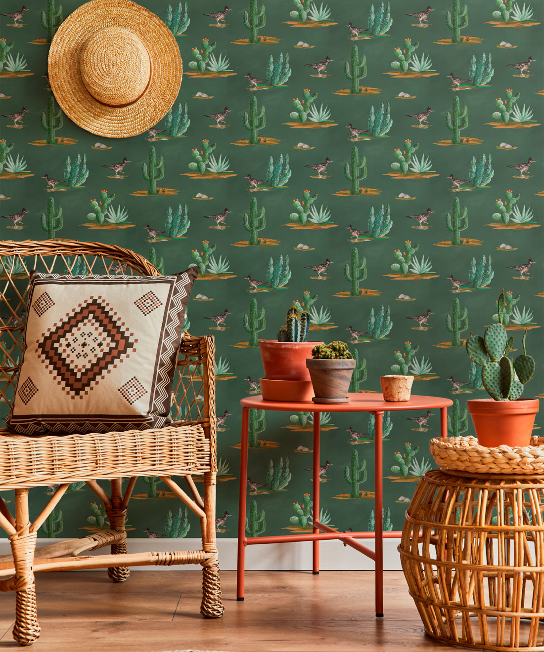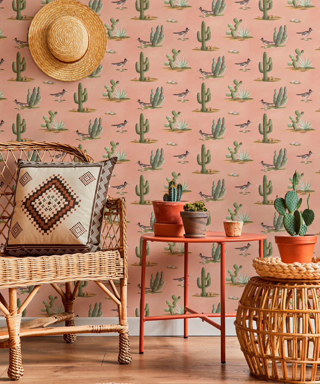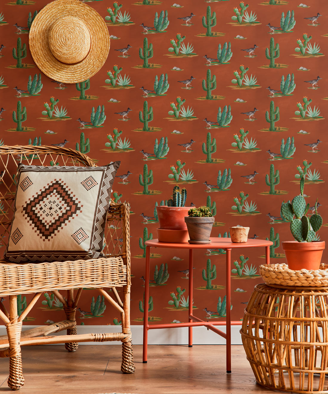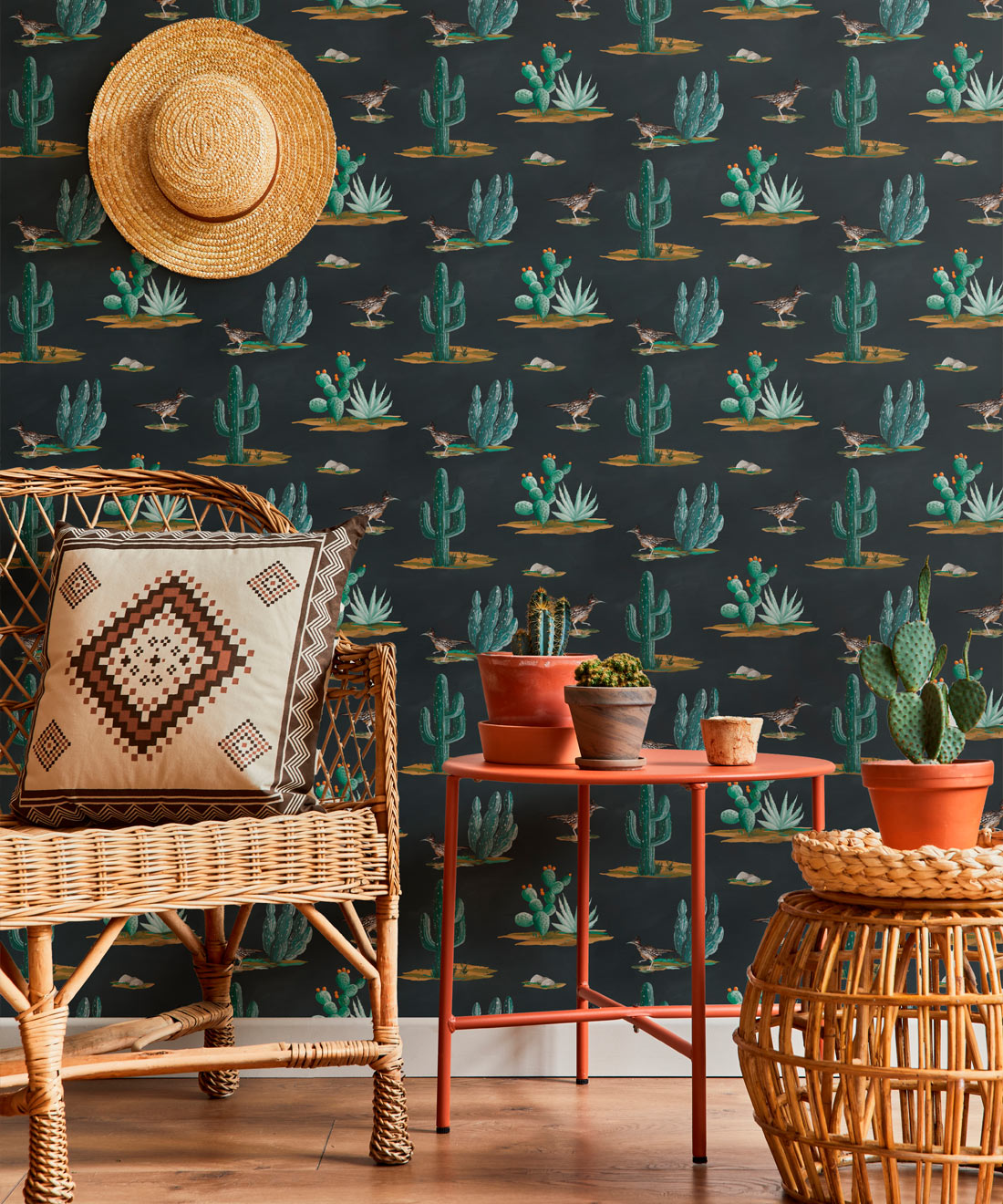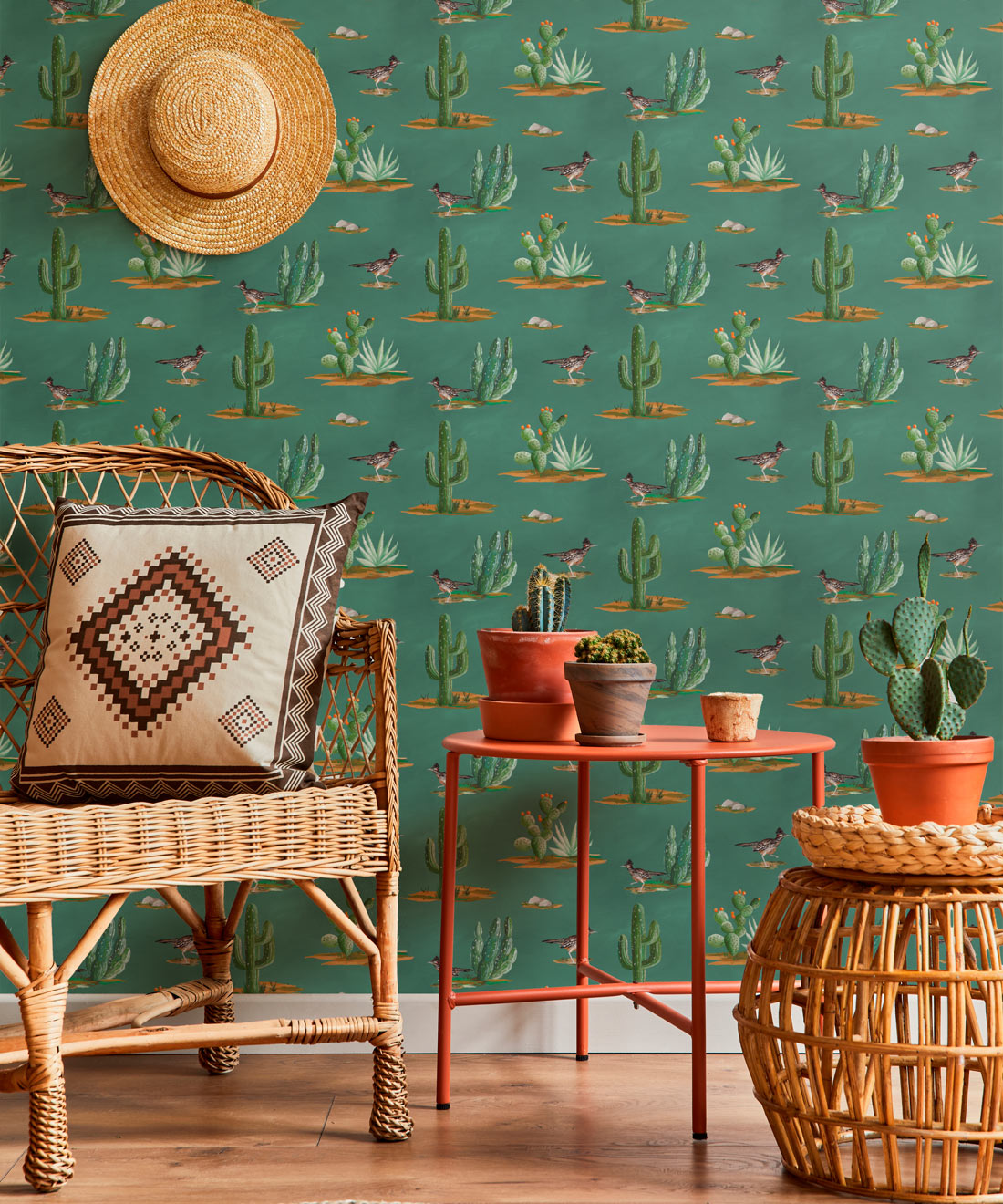 Roadrunner wallpaper is a delightfully simple design depicting the vibrant and resilient spirit of the desert and its wildlife. The roadrunner is regarded by some Indigenous cultures as a symbol of exceptionally good luck. Featuring hand painted illustrations of roadrunners, cacti and other desert plants, the design creates a harmonious and engaging scene that will bring the warmth of the desert and the luck of the roadrunner into any space.
