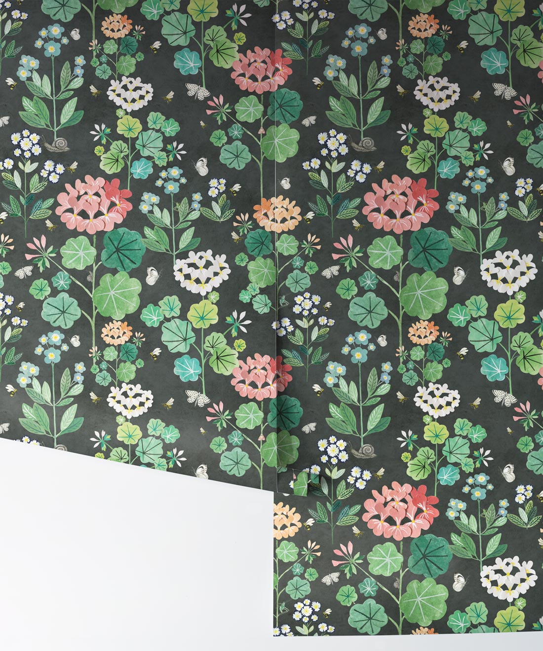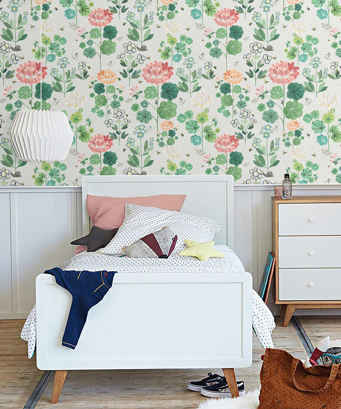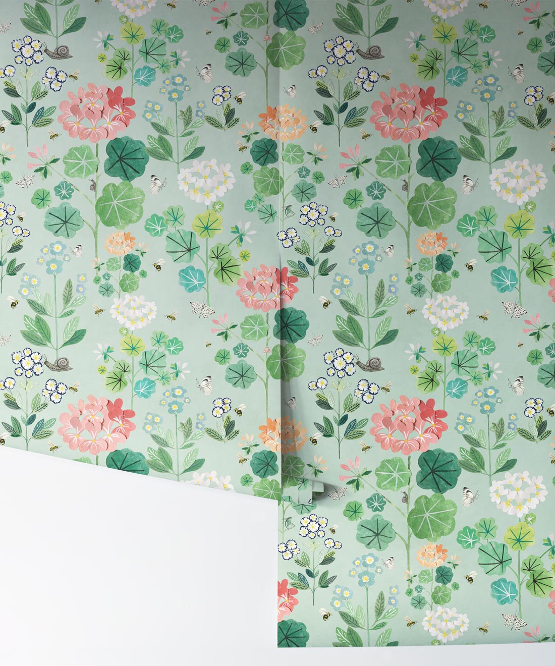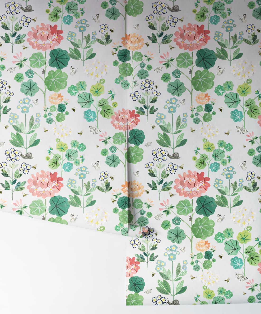 A stunning kids wallpaper created for young Sophie. Joyfully spending her time spotting all the butterflies and bees that make their home in the backyard garden. The gorgeous elements that make up the Sophie’s Garden wallpaper have been hand-painted, cut out then put back together creating layers within the flowers, thus giving the flowers a three dimensional look. This delightful kids wallpaper is abundant with plants and flowers that will fill the room with a playful mood.