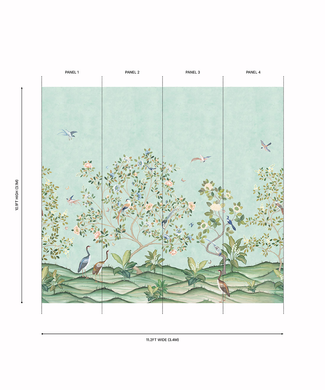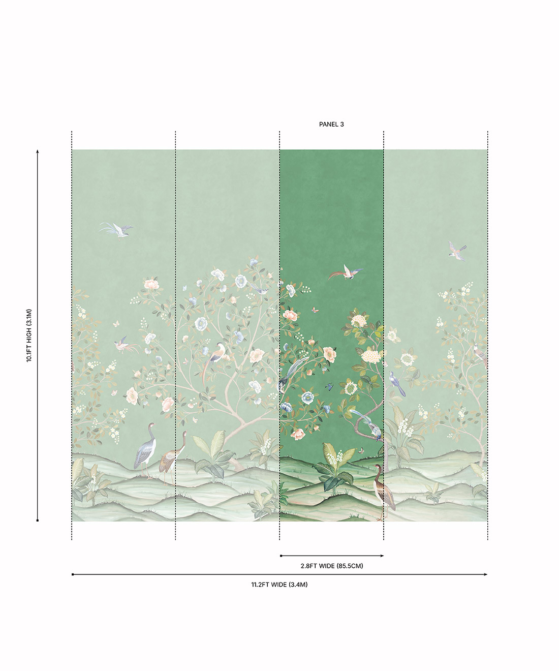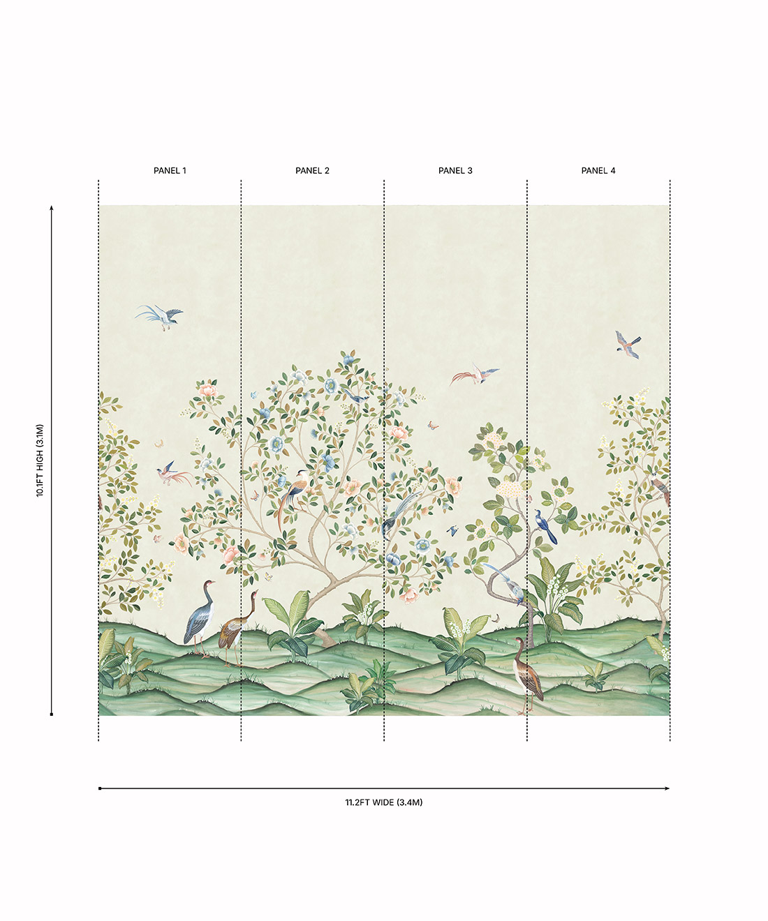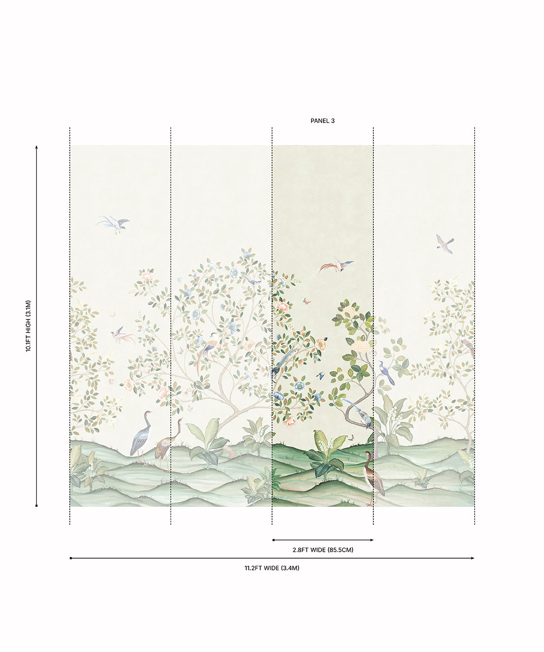 Designed as panels that are 33.6″ (85.5cm) wide x 10.1ft (310cm) high.