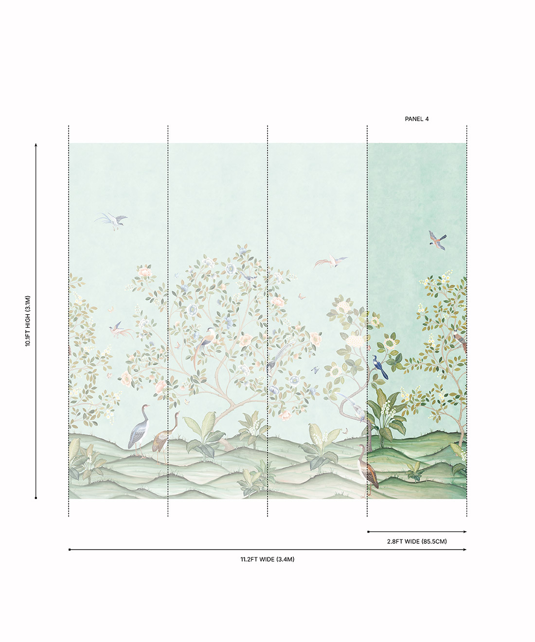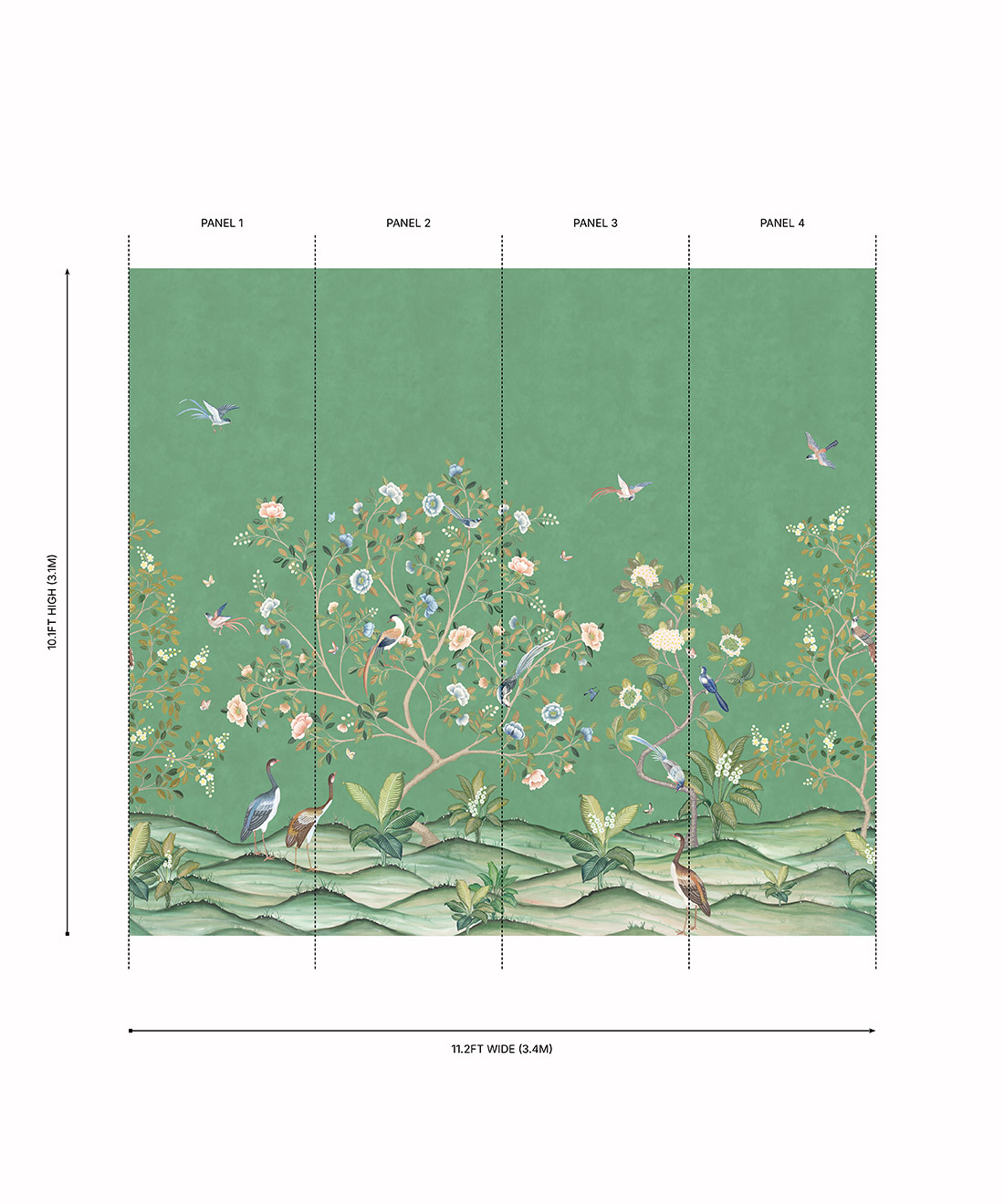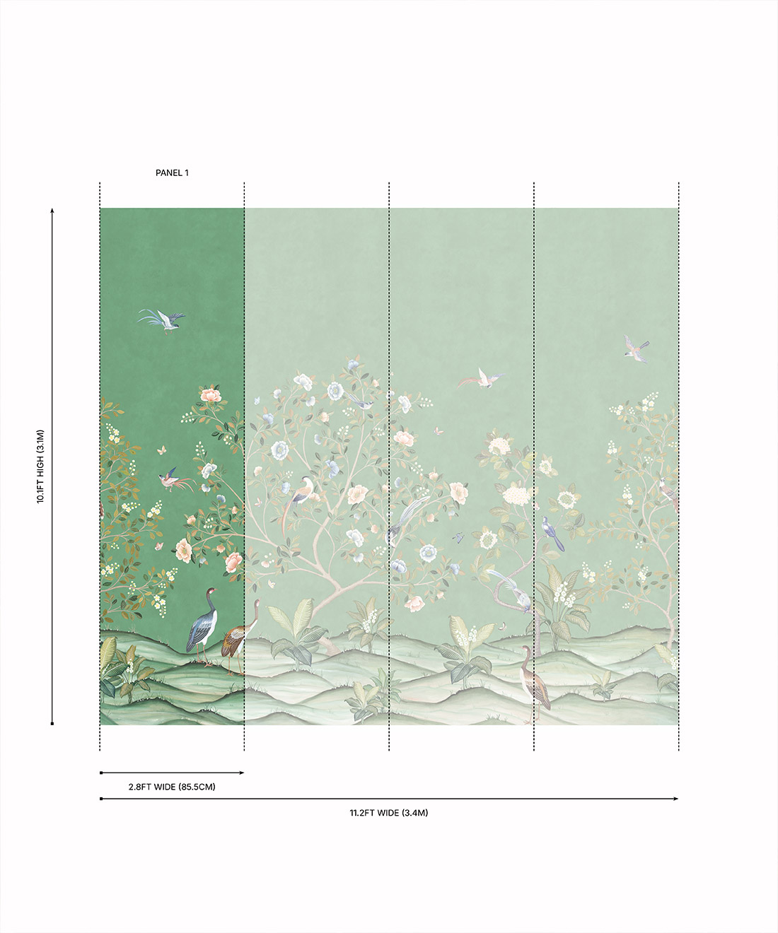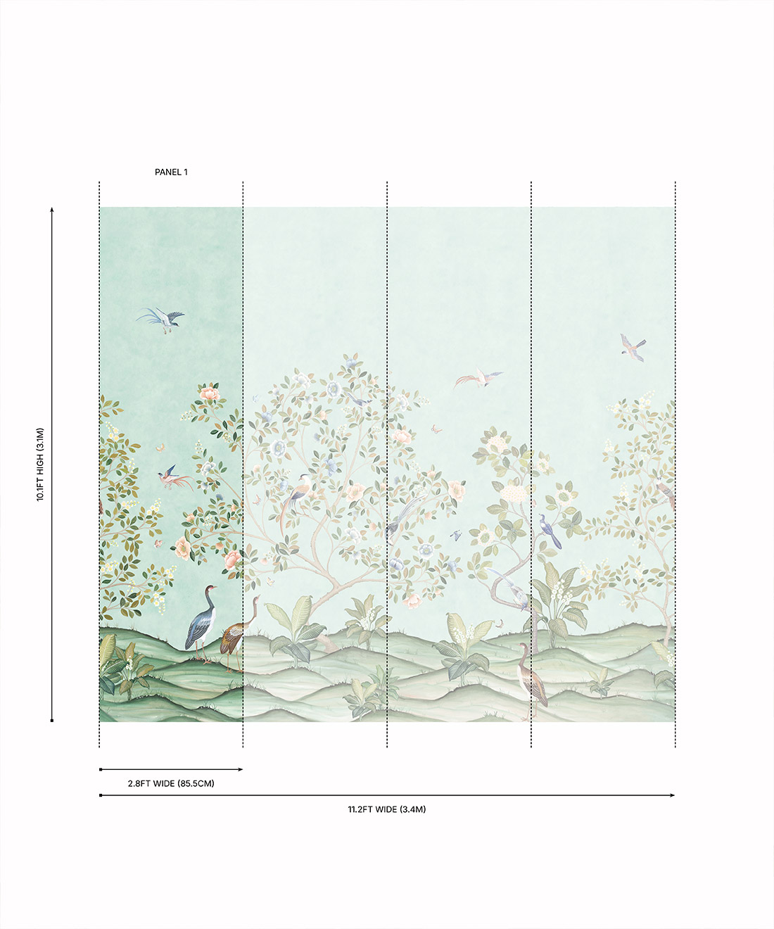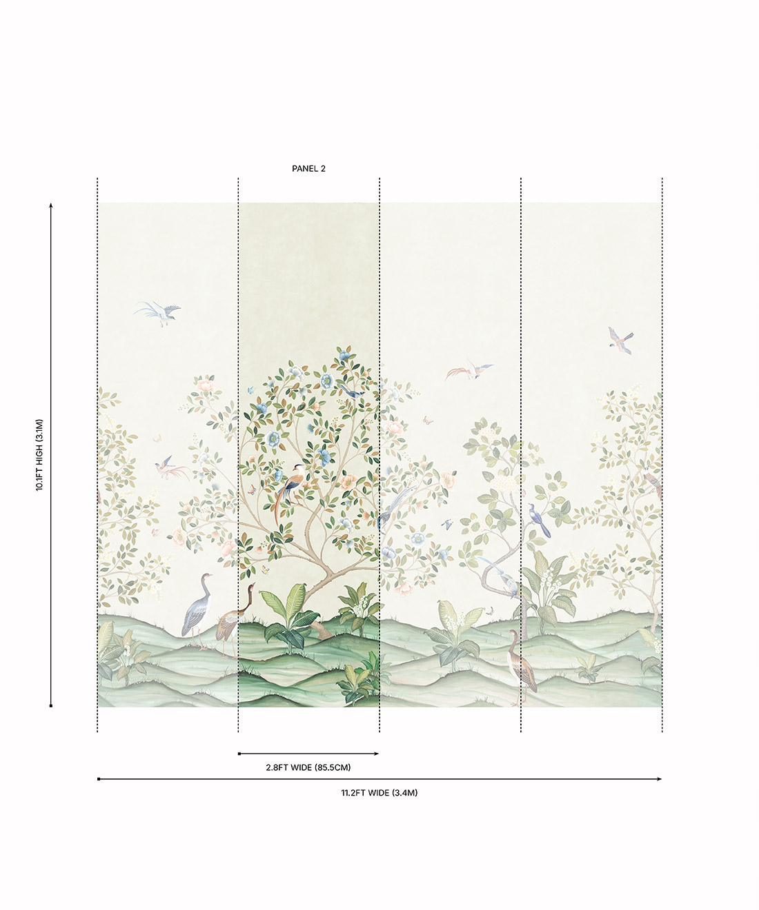 Designed as panels that are 33.6″ (85.5cm) wide x 10.1ft (310cm) high.