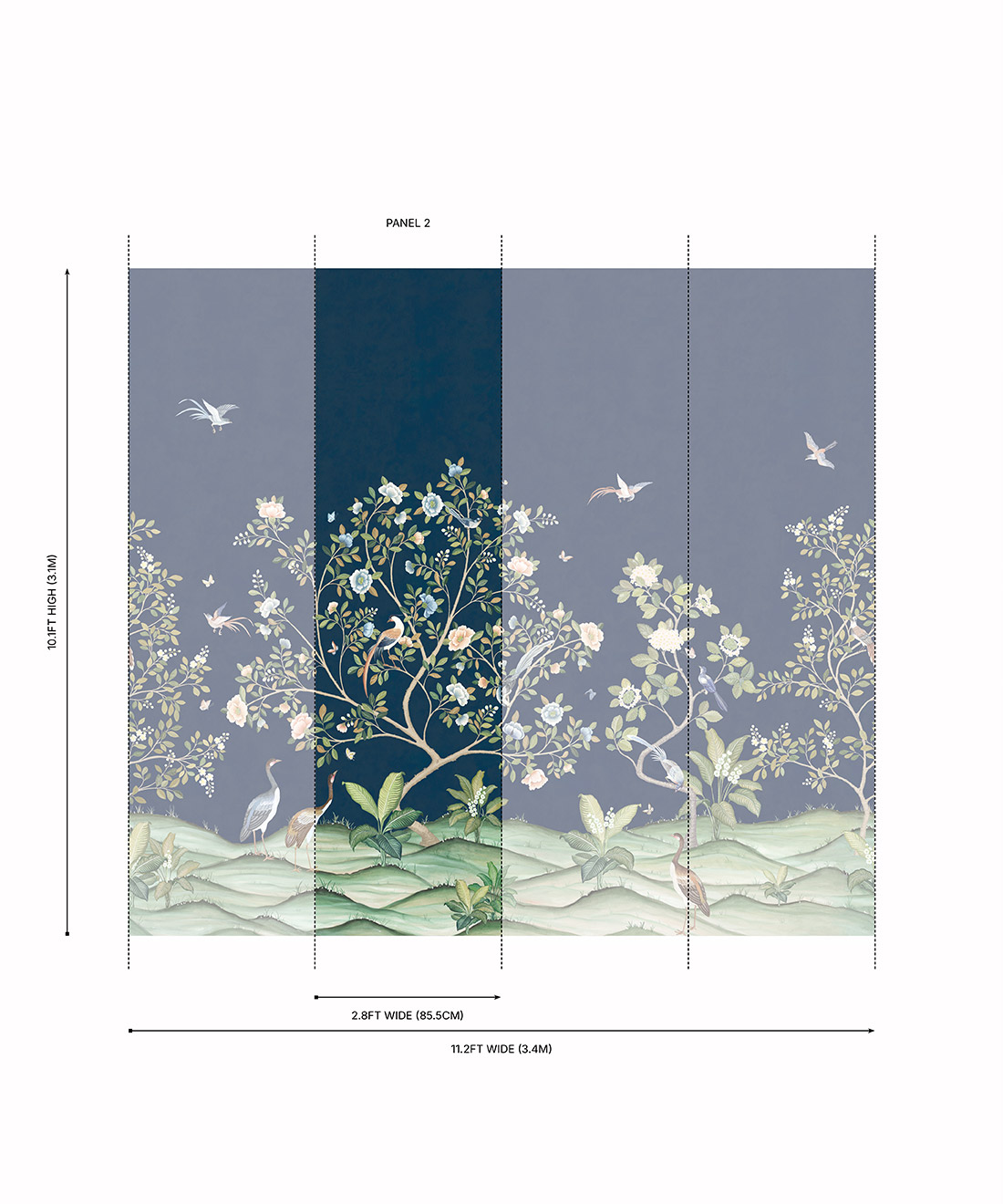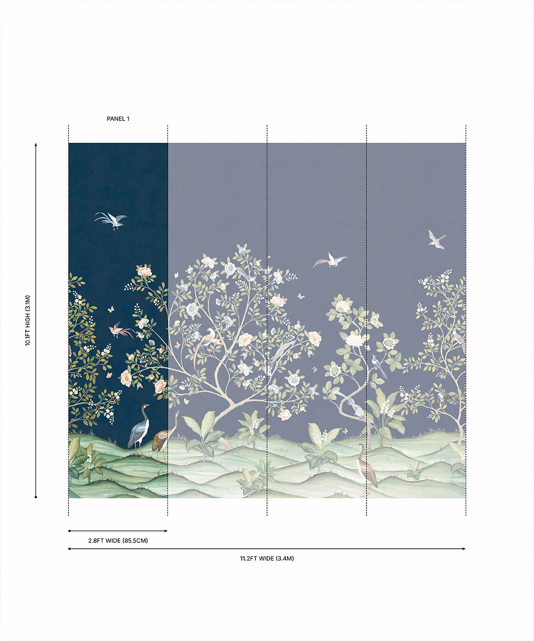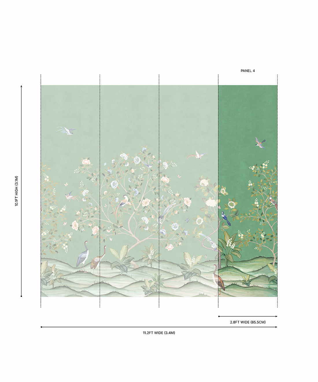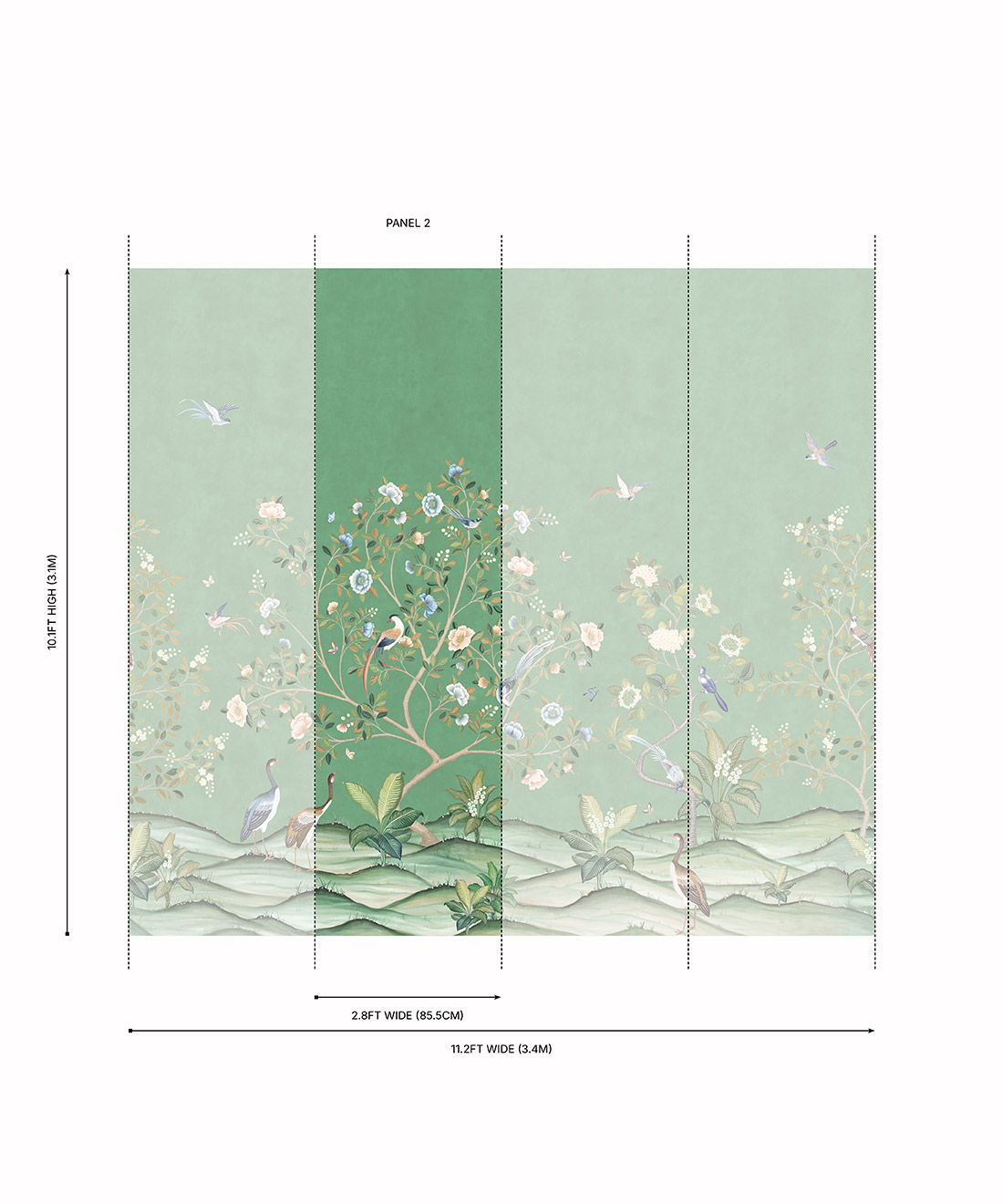 Designed as panels that are 33.6″ (85.5cm) wide x 10.1ft (310cm) high.