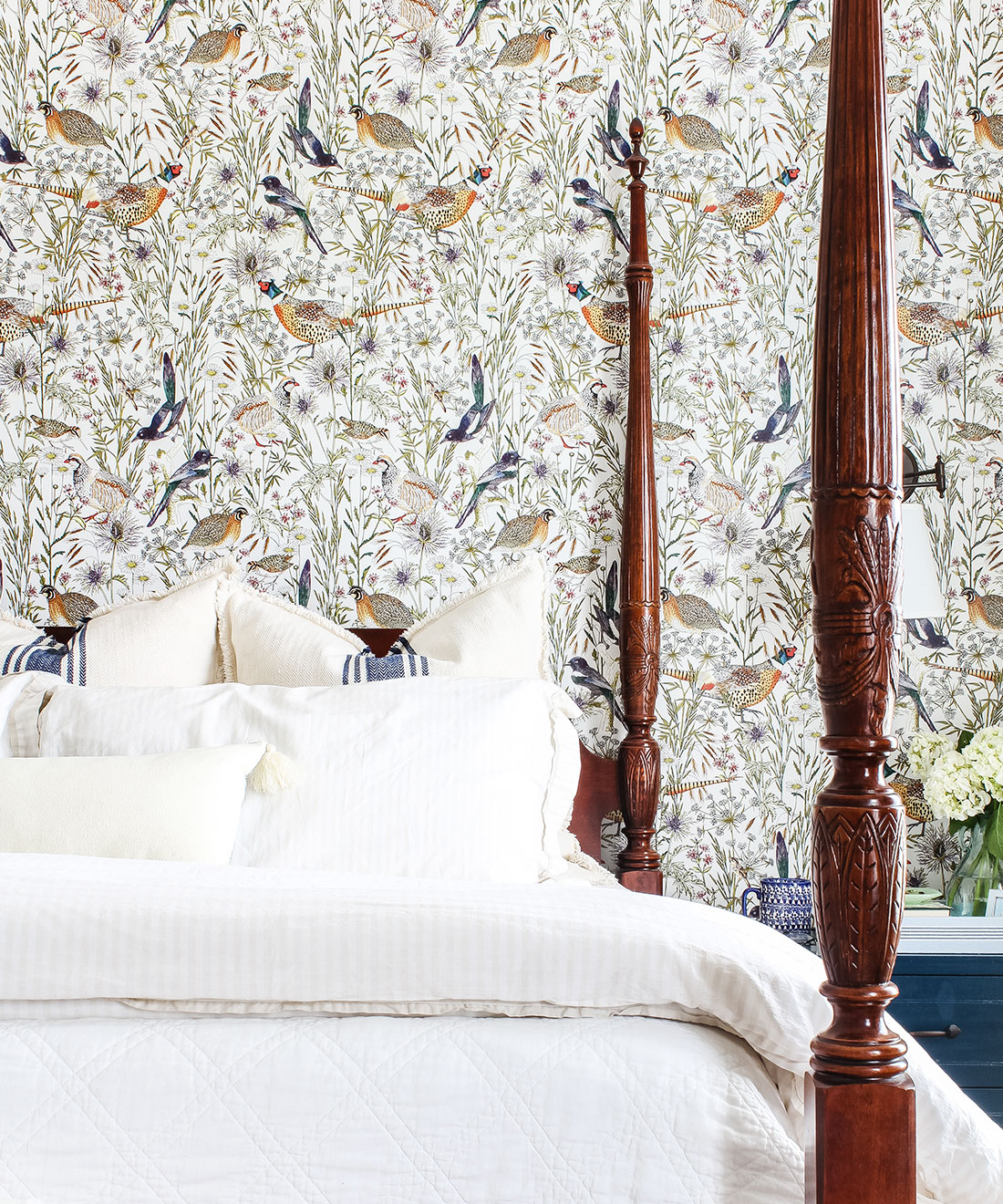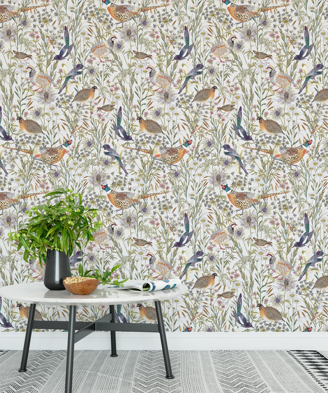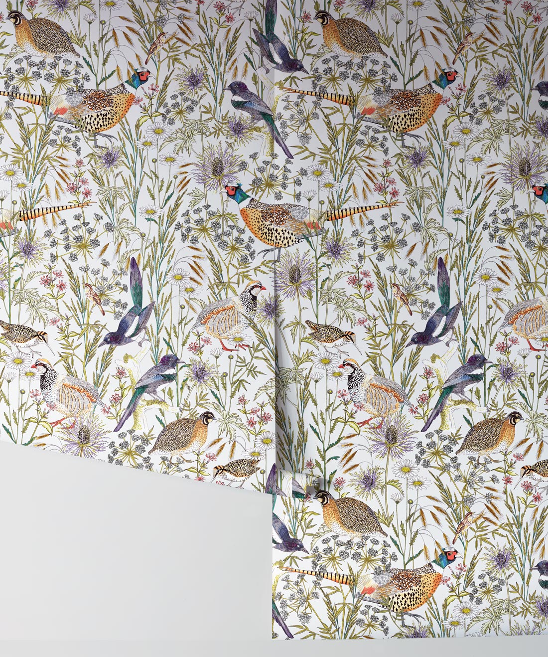 An intricate and lively botanical wallpaper, illustrated by Jacqueline Colley featuring cowslip and daisies in the long grasses of the woodland edge. Birds strut through this english pastoral scene including; a jewelled pheasant and red legged partridge each drawn with stunning detail. A large scale pattern that would look stunning in any environment. Manufactured on a hard- wearing non woven, this easy to install wallpaper is ideally suited to both commercial and residential installations.