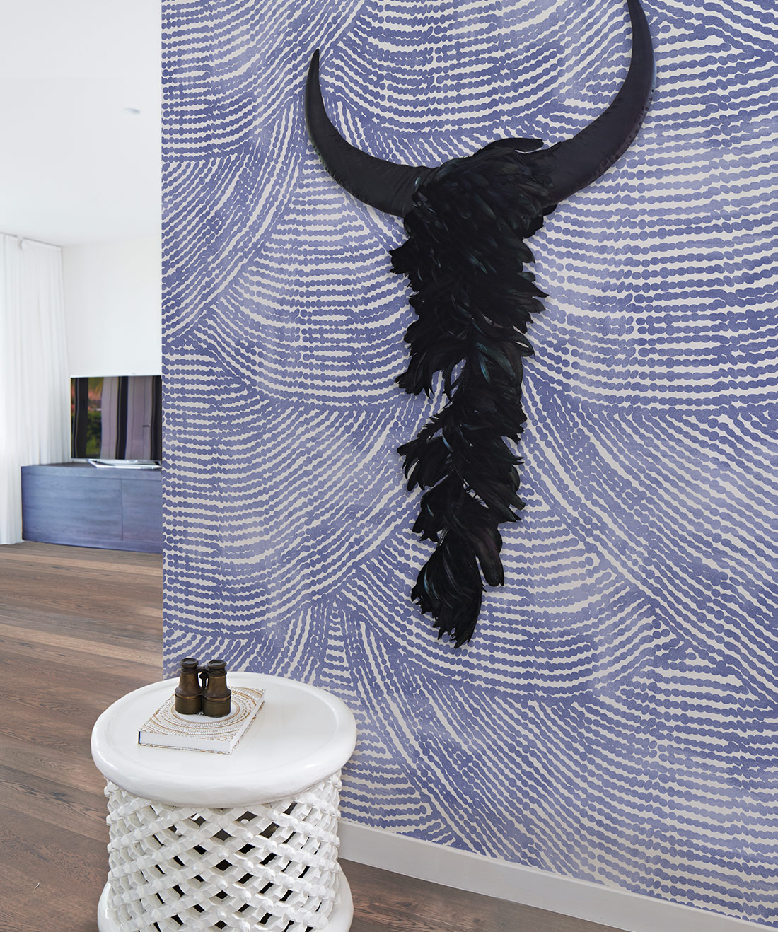 On a safari expedition into the heart of Zulu country, an African beauty is betrothed and draped in curtains of trade beads now rendered in wallpaper. Colours are drawn from clay, sand, grasses and hues of South Africa. ‘Zulu Efuru’ means ‘Zulu warrior daughter’/ ‘zulu princess’. This textural curtain of rhythmic beads echo’s an ancestral song of ancient lineage and connection to mother nature.