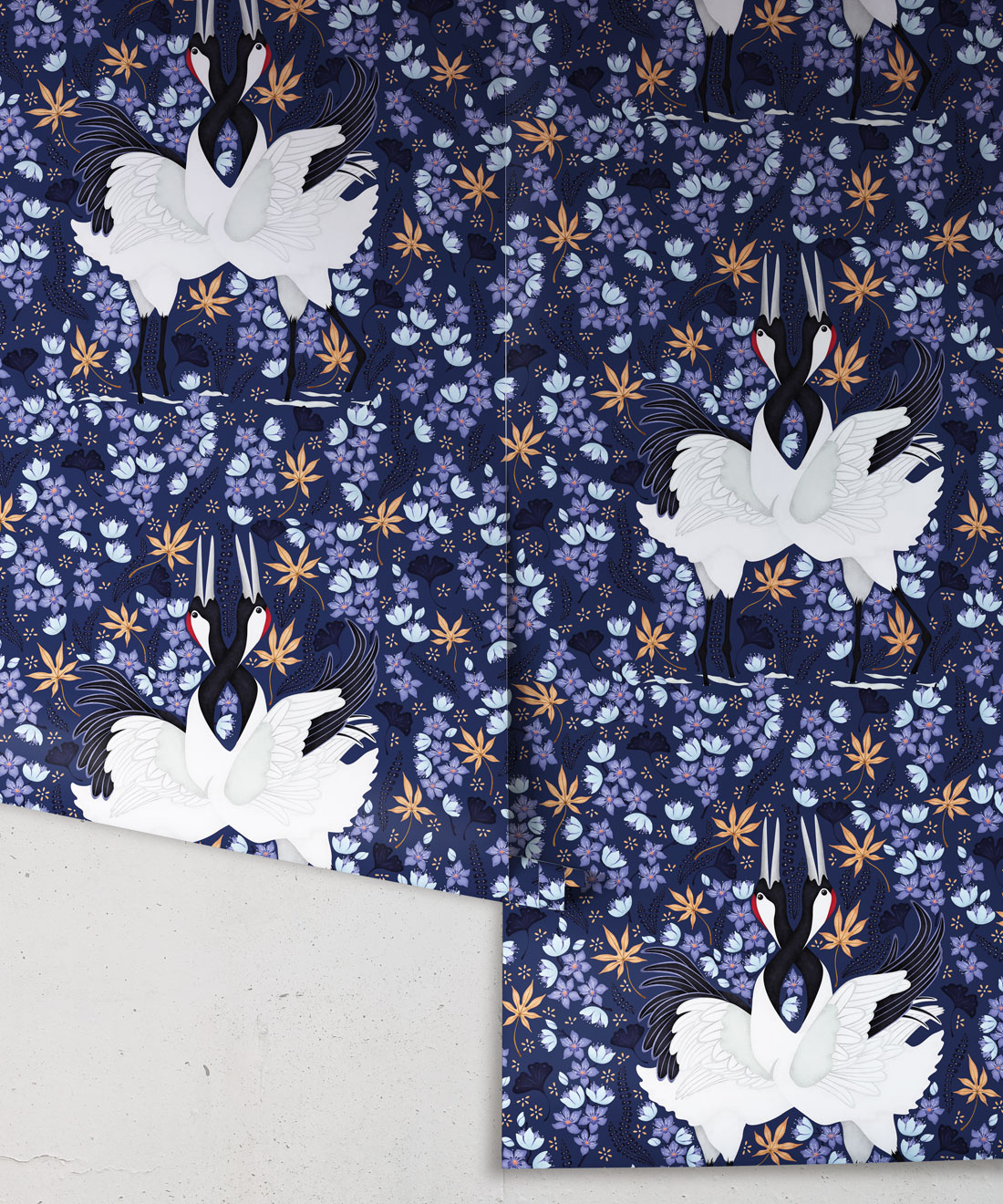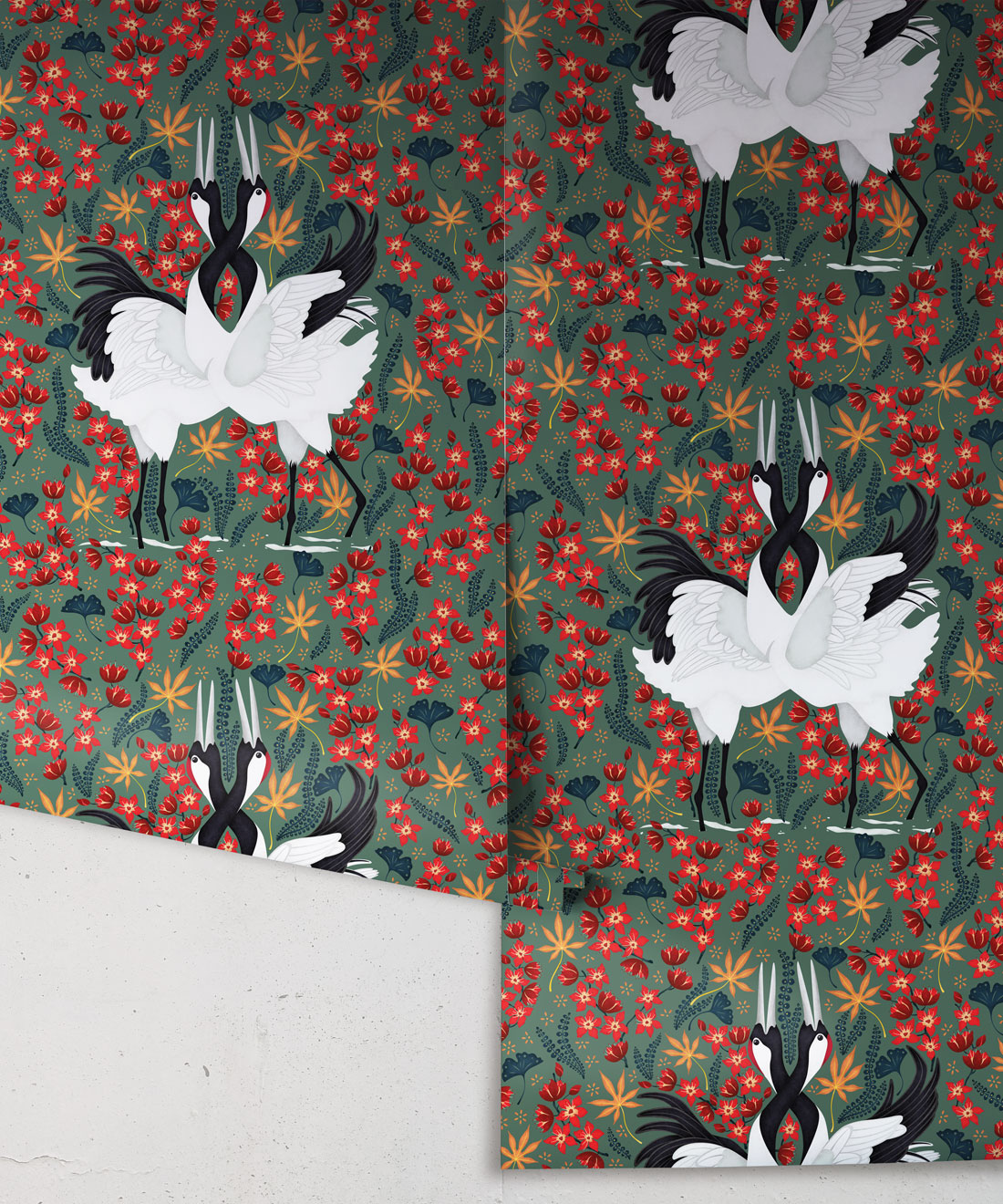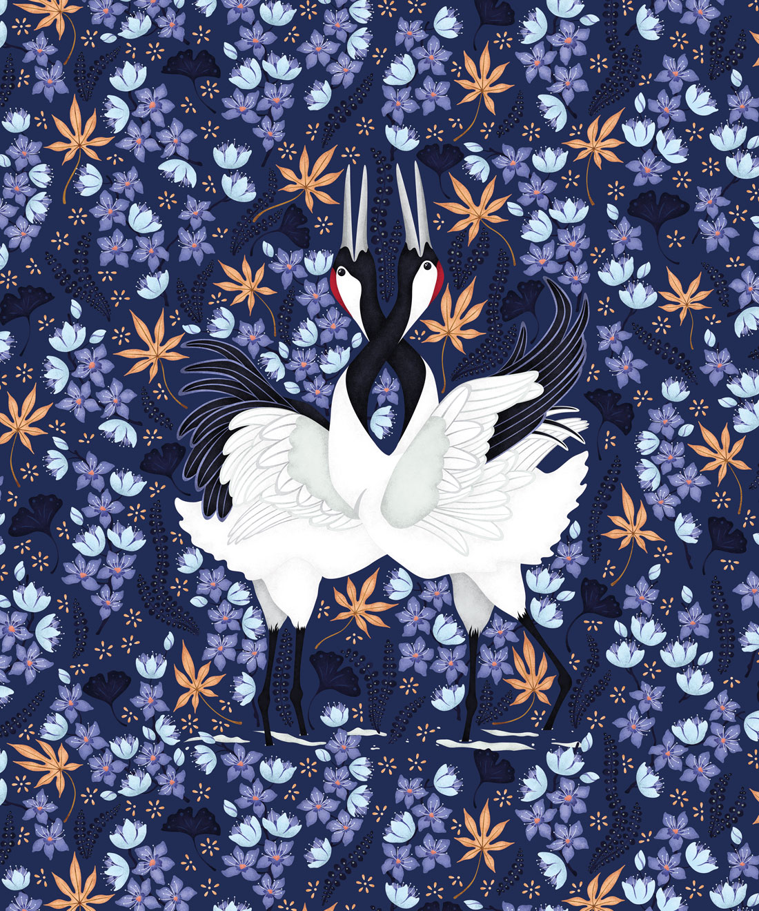 Catherine was inspired to draw the dancing Japanese Cranes in memory of a recent travel to Japan. Her family has a long lasting fascination for the Japanese culture which has attracted them to visit this beautiful country on multiple occasions. Her sister also lived in Japan for a few years in a small rural & traditional town where she met her husband. This artwork is a homage to their love.