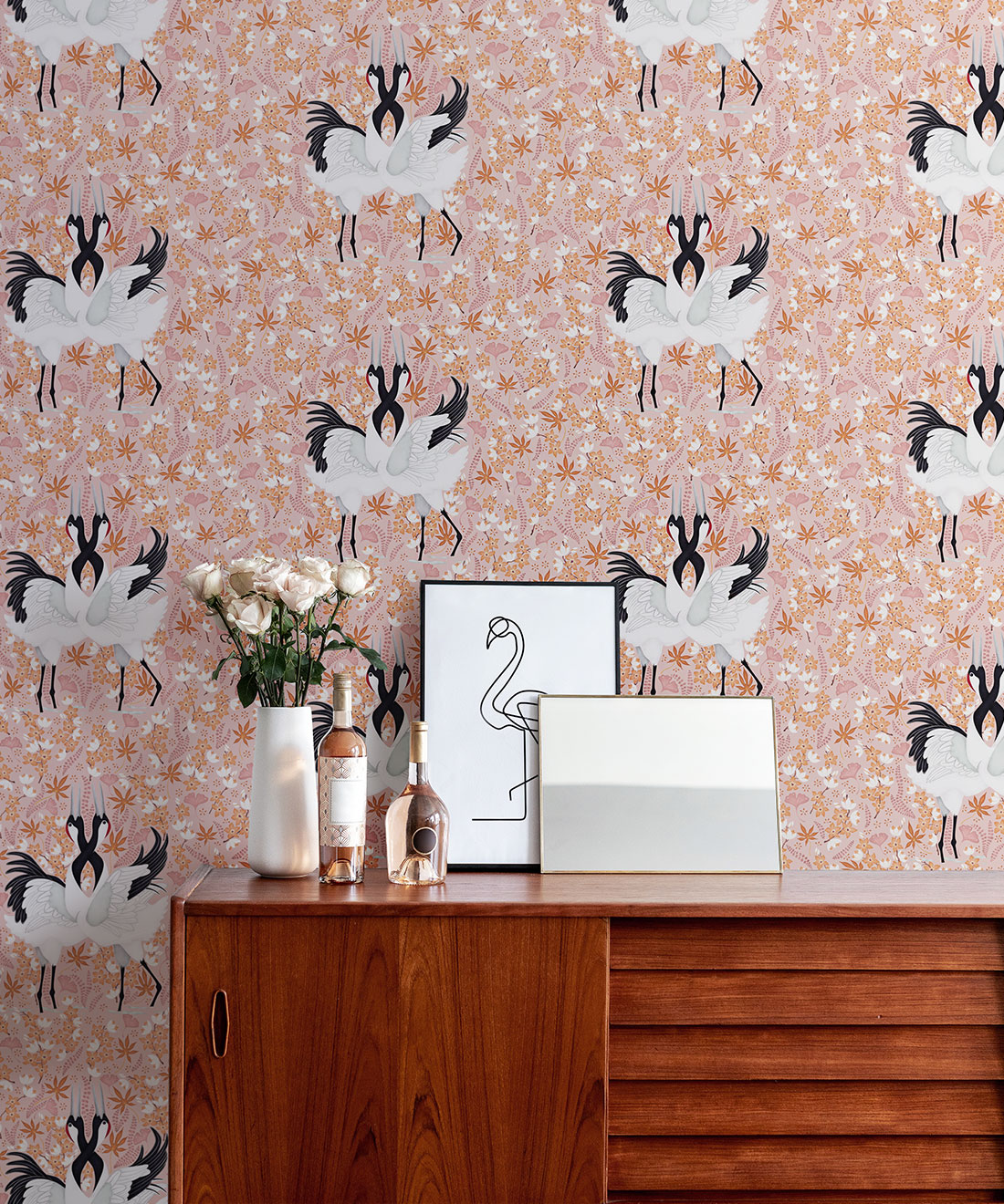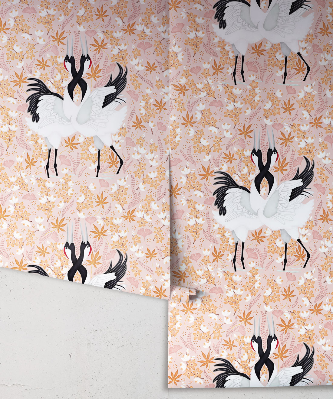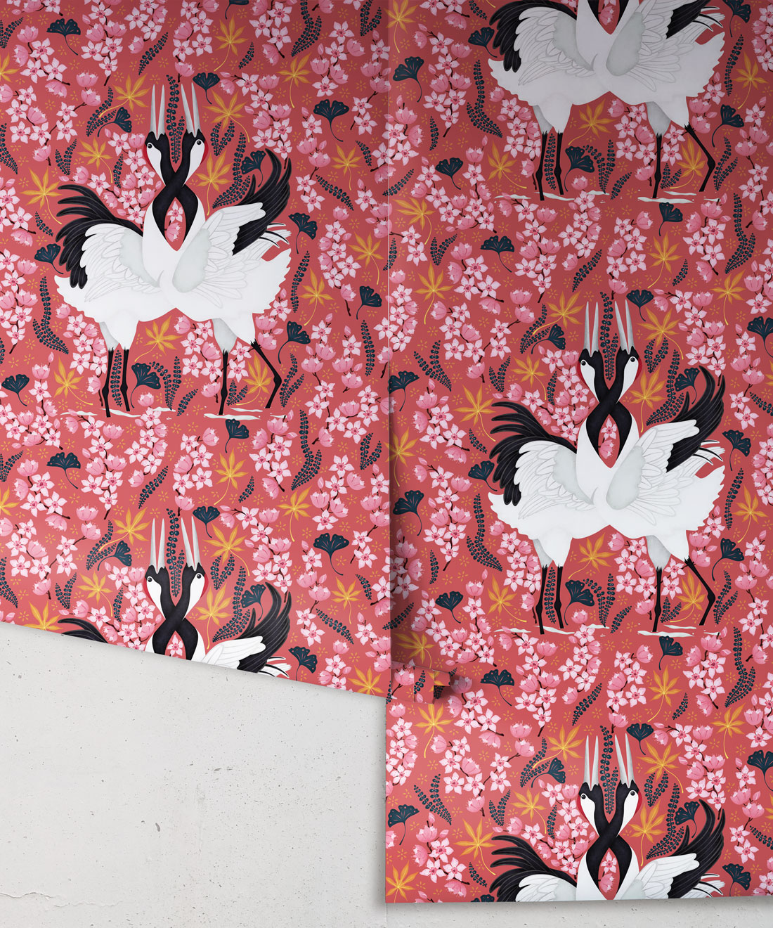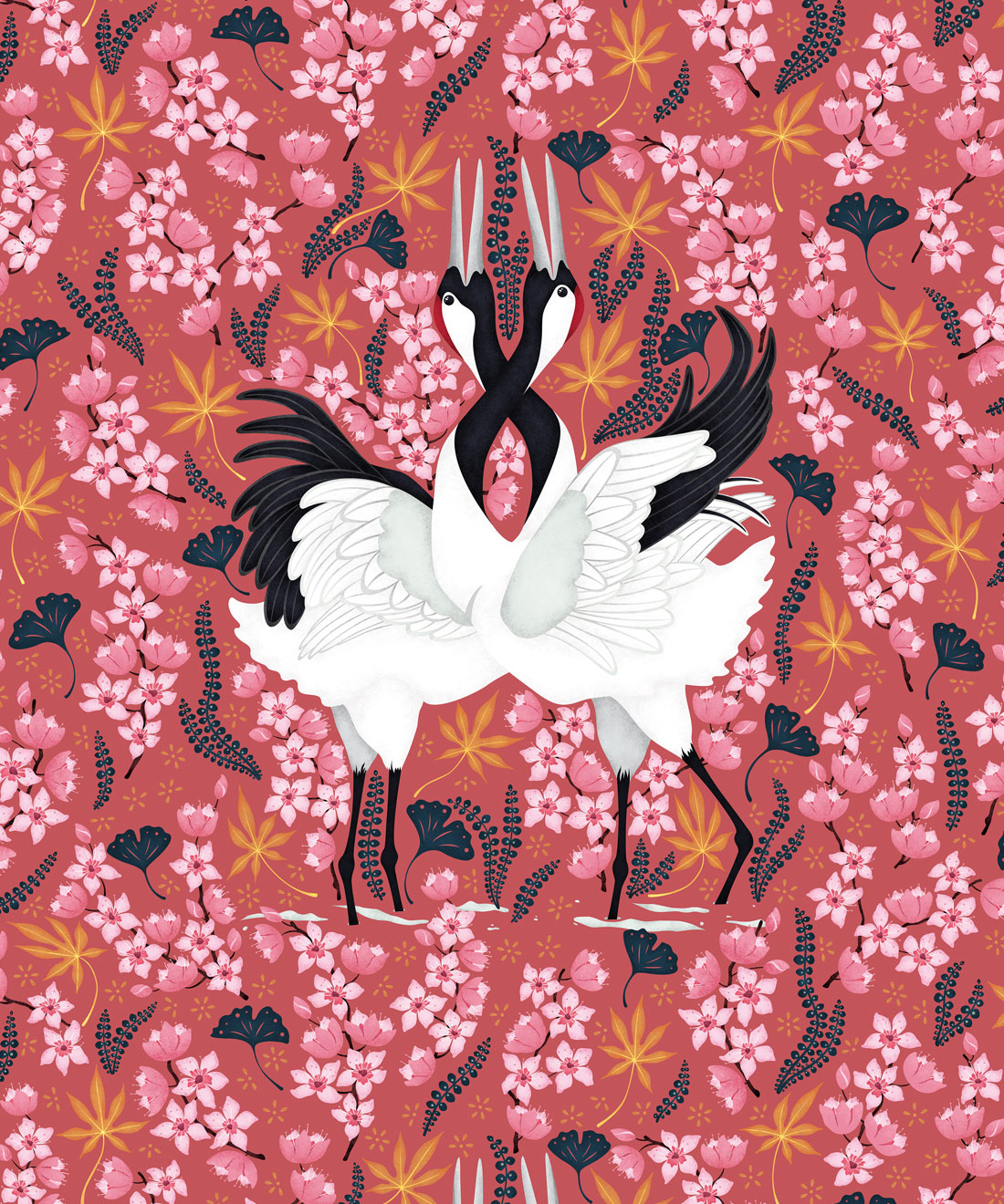 This artwork is a hymn to love representing two Japanese cranes dancing together in spring. The flowers and leaves have been selected to evoke a Japanese garden, from the pink cherry blossom to the Japanese maple tree leaves. The Japanese Crane is a symbol of love and fidelity, which is not surprising since these elegant birds bond for life once they have found a mate. This artwork conveys both at the same time a sense of power & softness, which is in essence very similar to love.