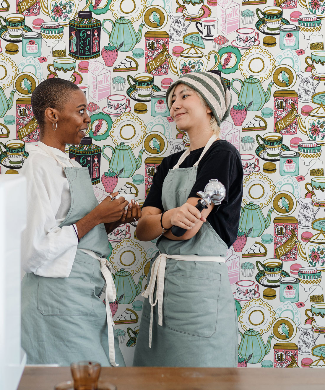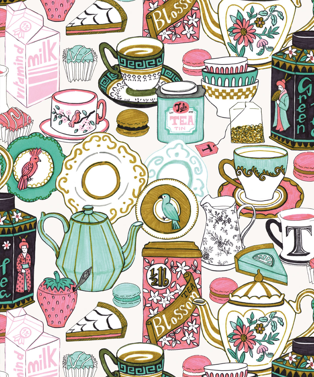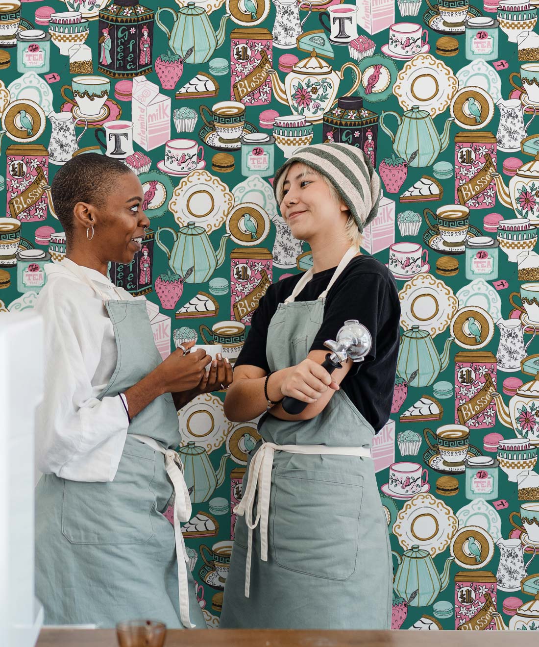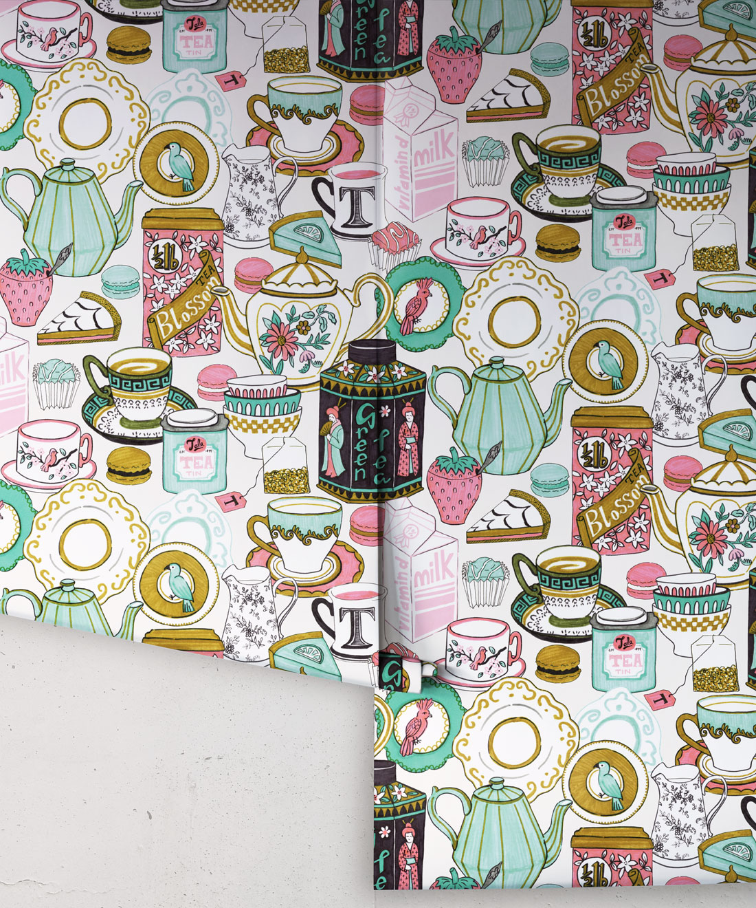 Tea Time Wallpaper is an intricate and playful wallpaper design illustrated by Jacqueline Colley. This design uses a turquoise and pink colour palette and features macaroons, cake, milk and, of course, plenty of tea cups and tea pots. It celebrates the long history that spans from the orient to England of taking some time out of the day to sit and converse over your favorite brew of tea. Encapsulating fantastical Alice in wonderland vibes, it is a perfect kitchen wallpaper and would also be fitting in a hip commercial setting as well.