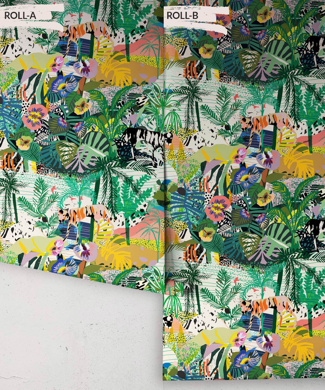 The Utopia Wallpaper design is inspired by imagined utopian landscape. The jungle is dense with large palms in a colourful tropical setting featuring flora, fauna and roaming tigers throughout the wallpaper.